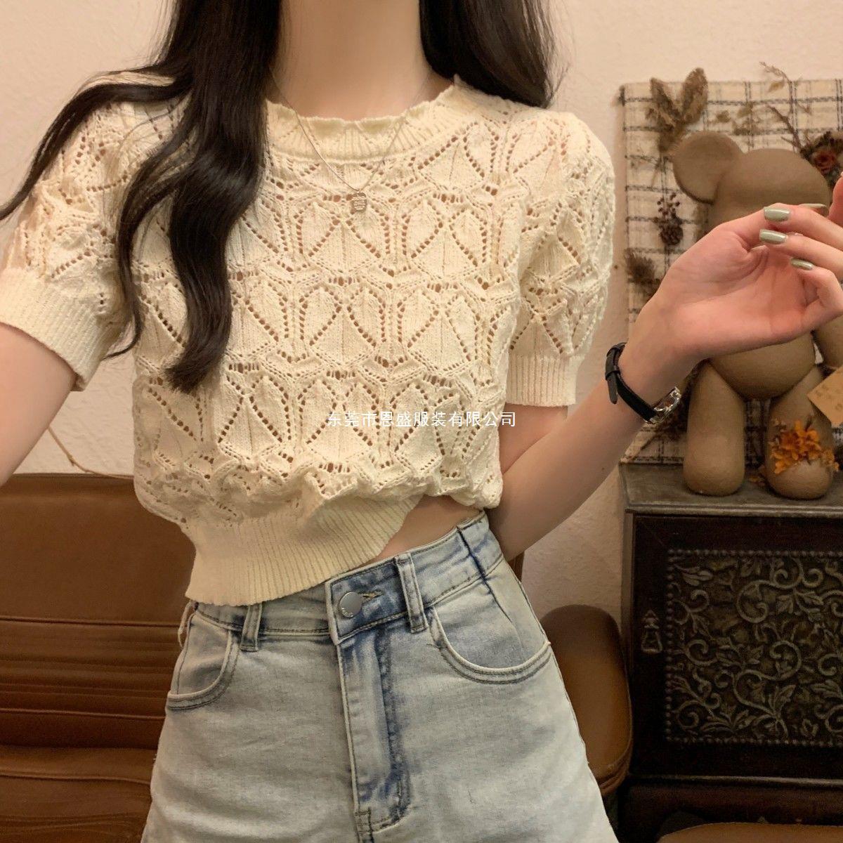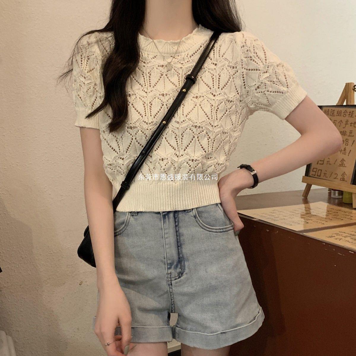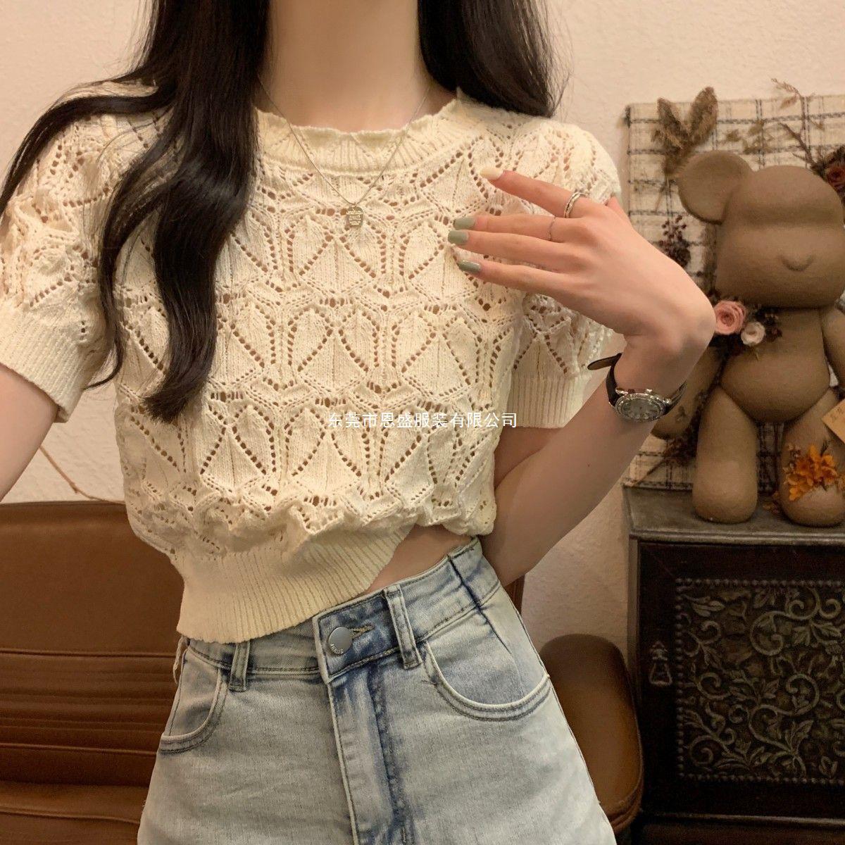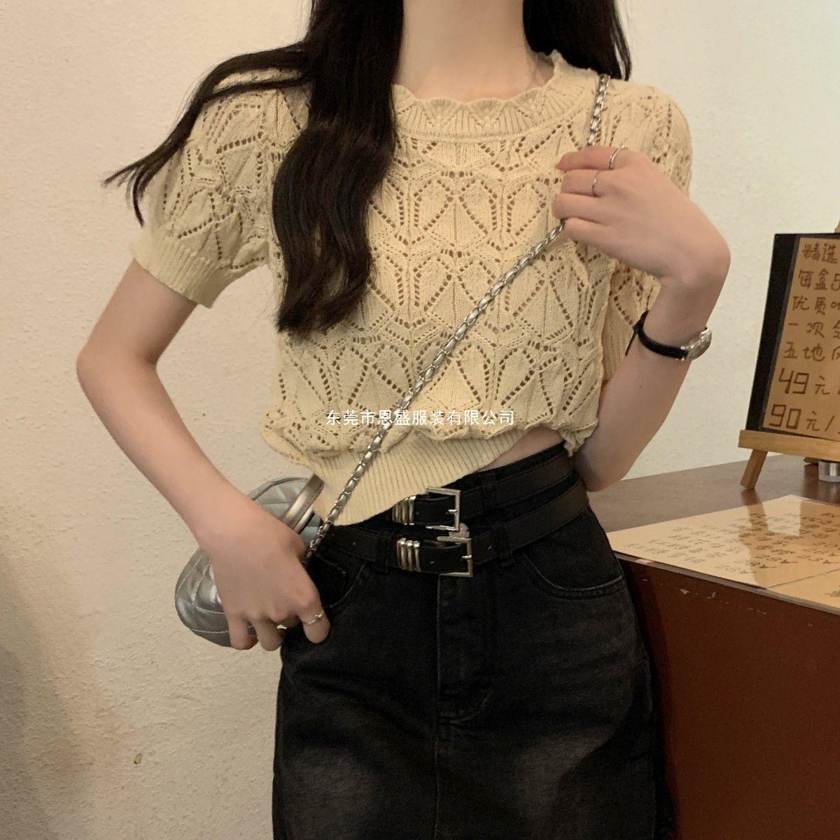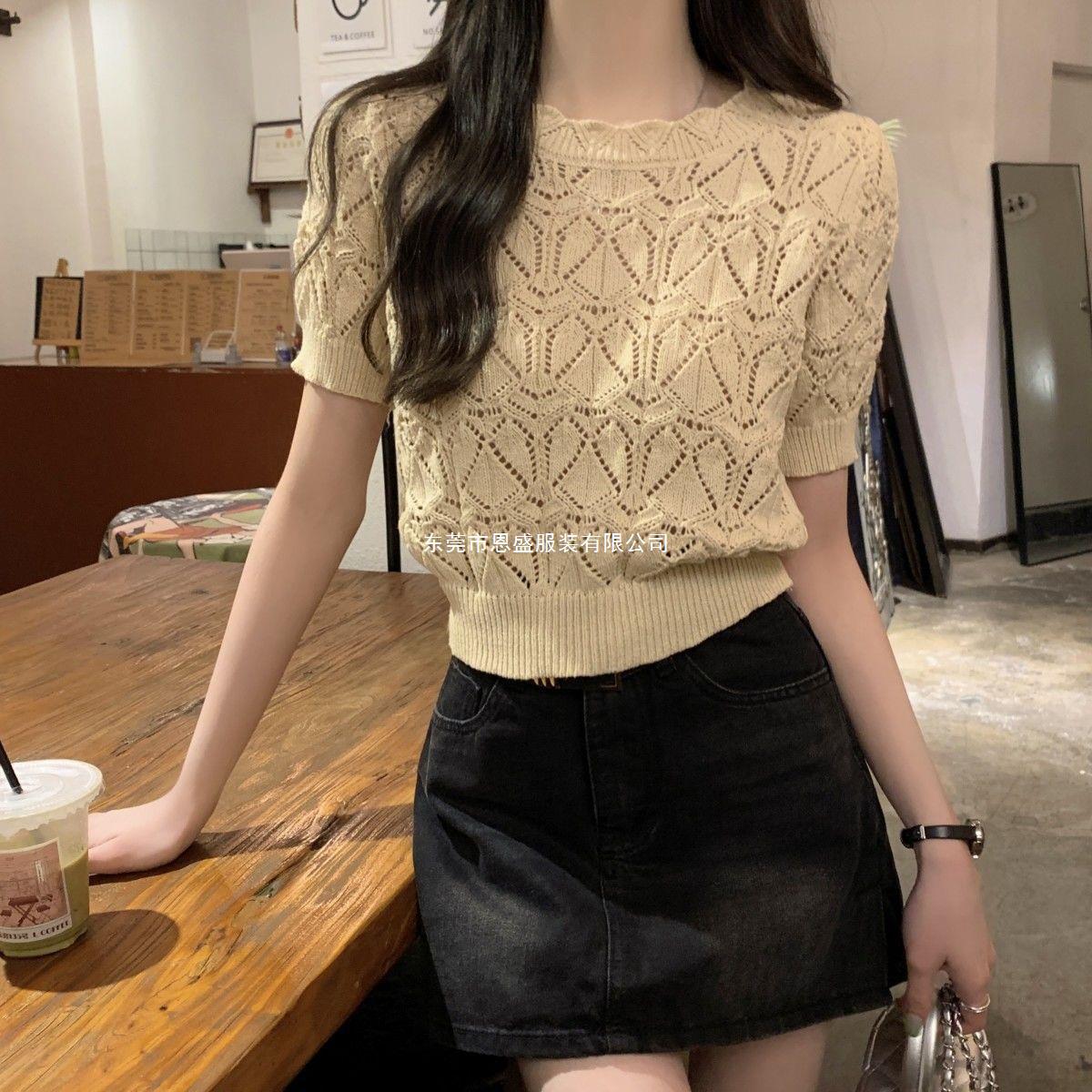 Camiseta Tejida de Seda de Hielo con Recortes de Manga Corta y Cuello Redondo, Diseño Delgado de Verano, Ajuste Entallado de Cintura Alta, Estilo Extranjero, Top Versátil para Mujer