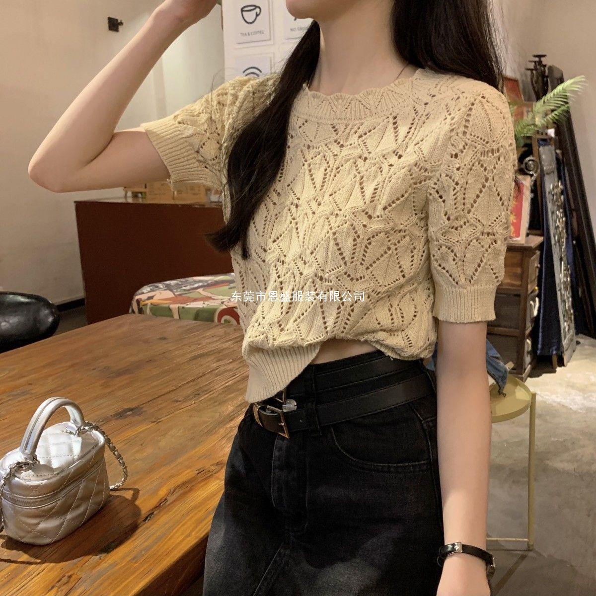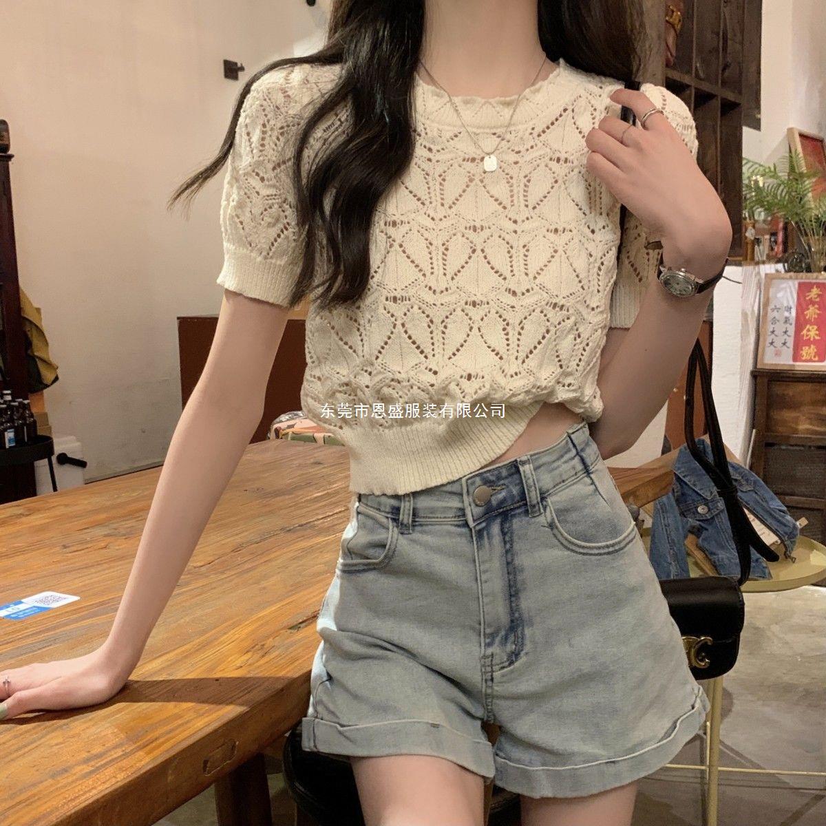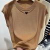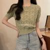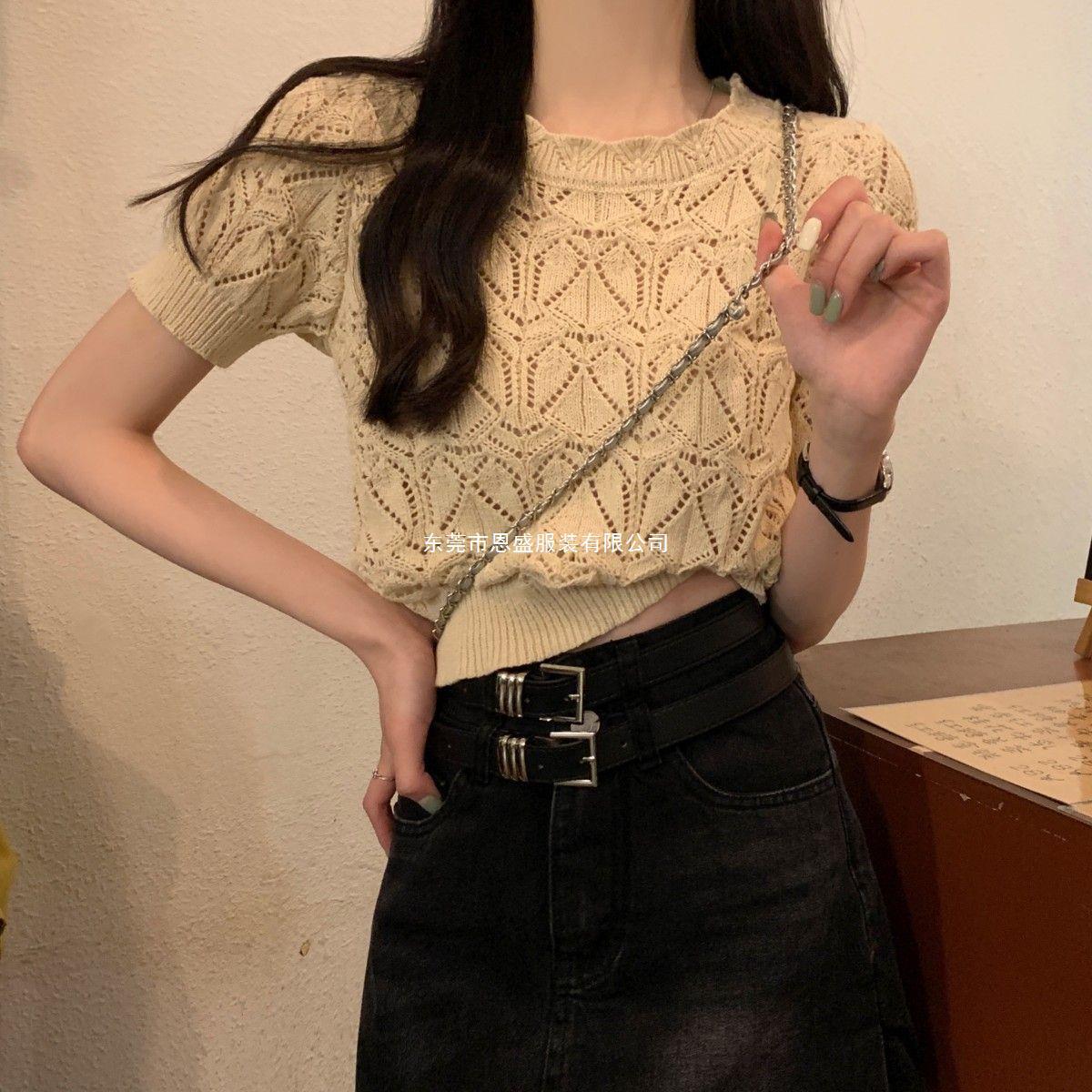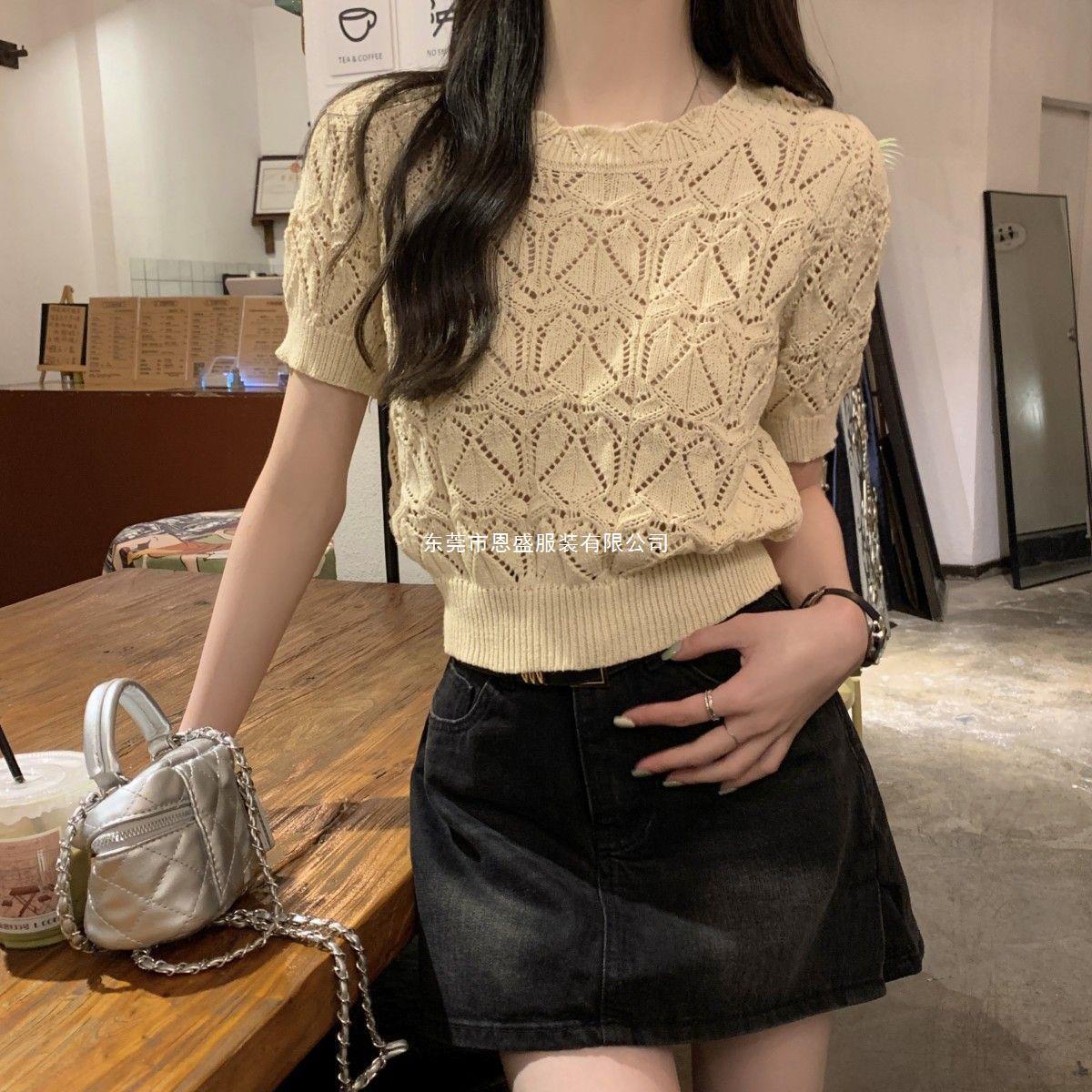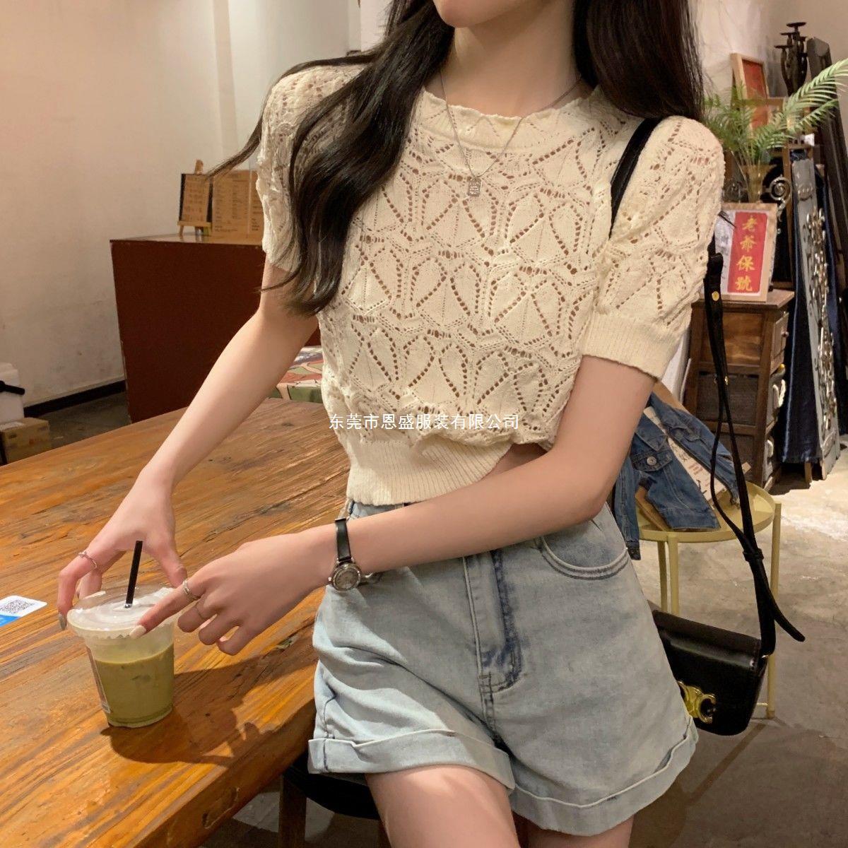 Camiseta Tejida de Seda de Hielo con Recortes de Manga Corta y Cuello Redondo, Diseño Delgado de Verano, Ajuste Entallado de Cintura Alta, Estilo Extranjero, Top Versátil para Mujer