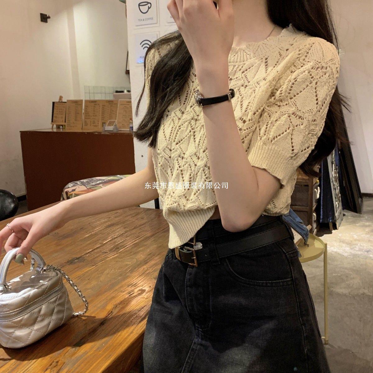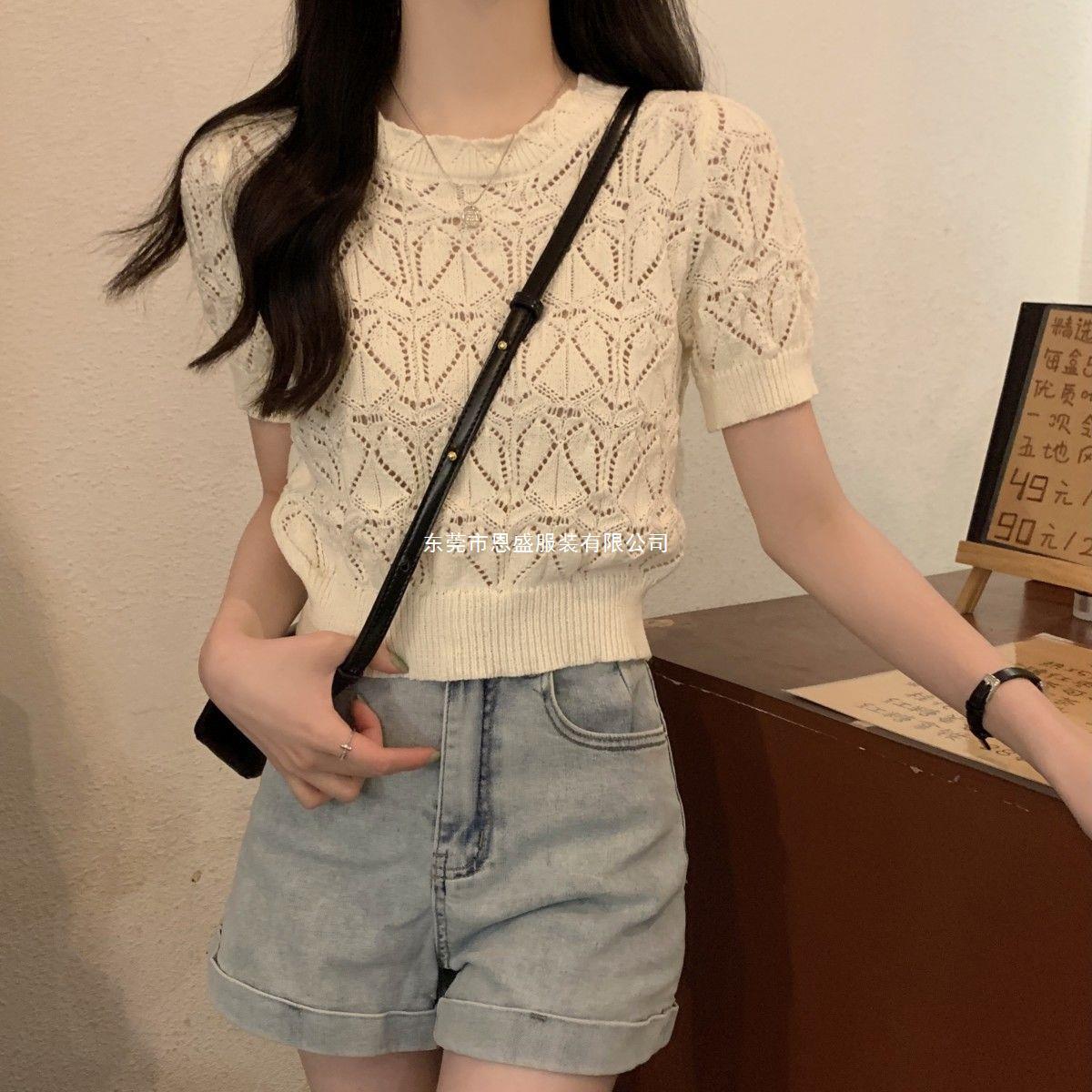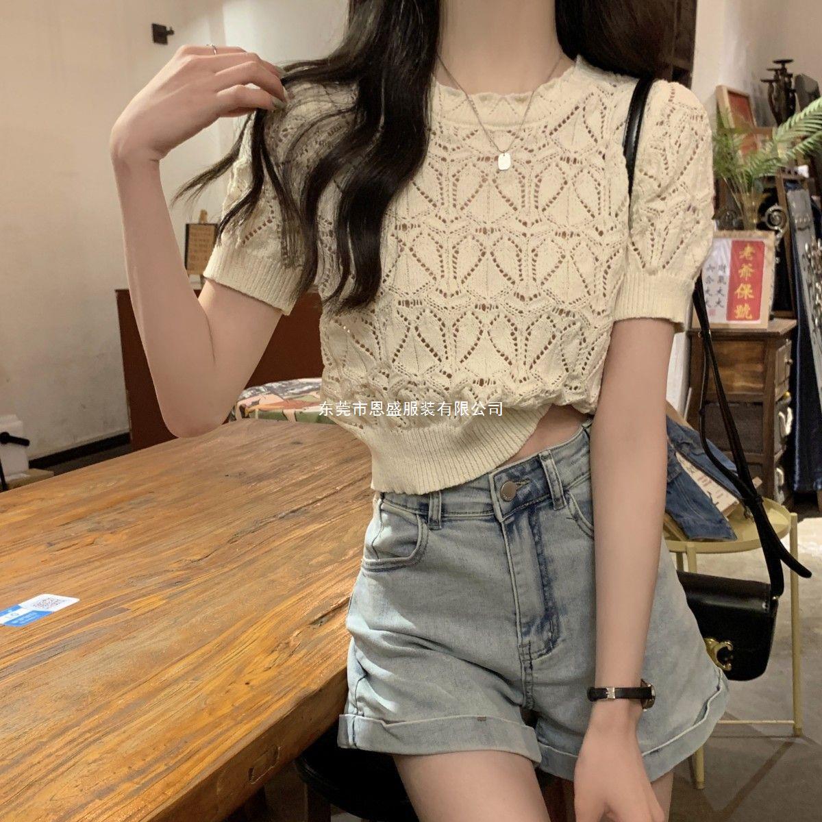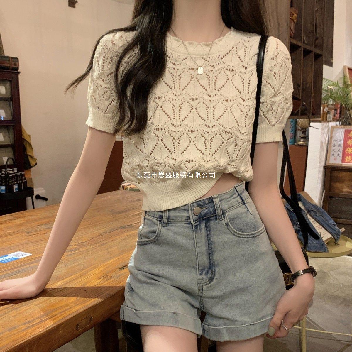 Camiseta Tejida de Seda de Hielo con Recortes de Manga Corta y Cuello Redondo, Diseño Delgado de Verano, Ajuste Entallado de Cintura Alta, Estilo Extranjero, Top Versátil para Mujer