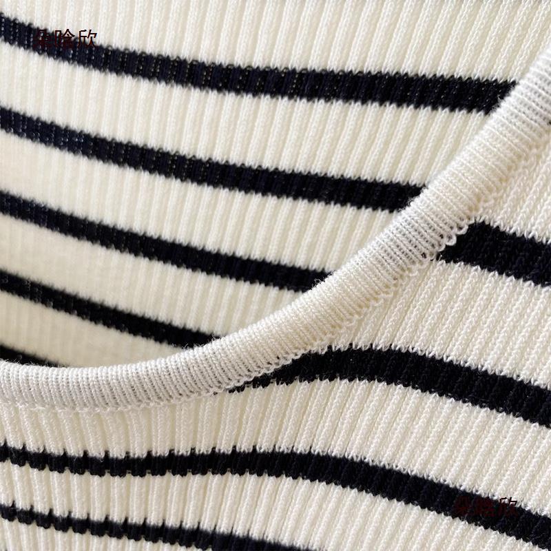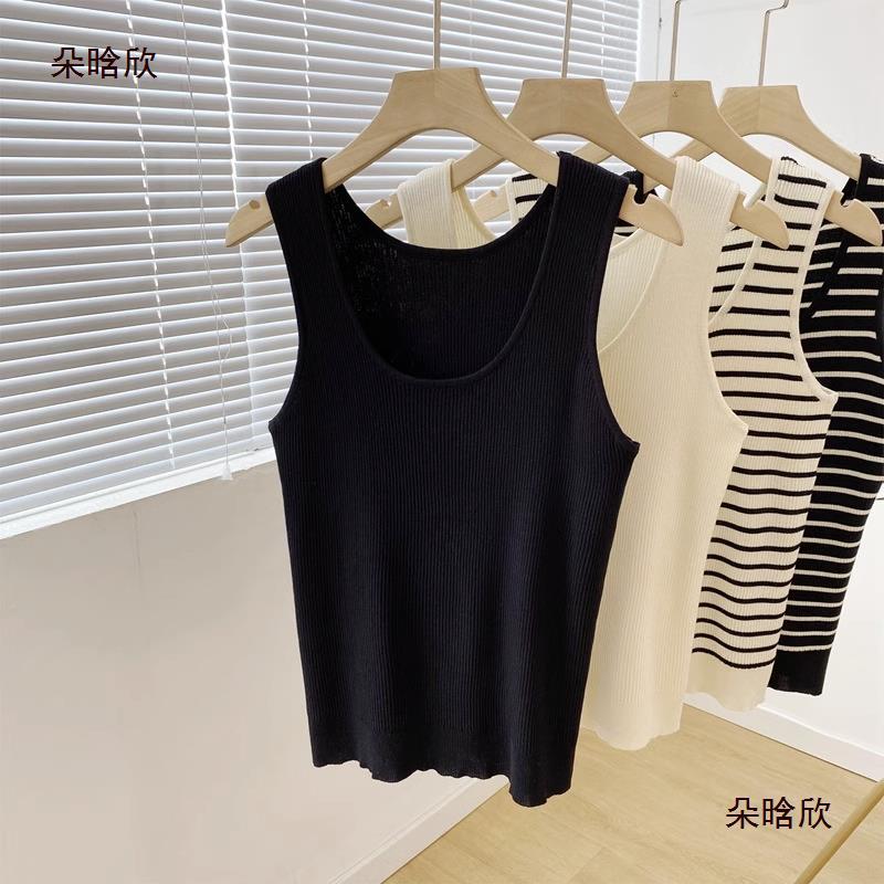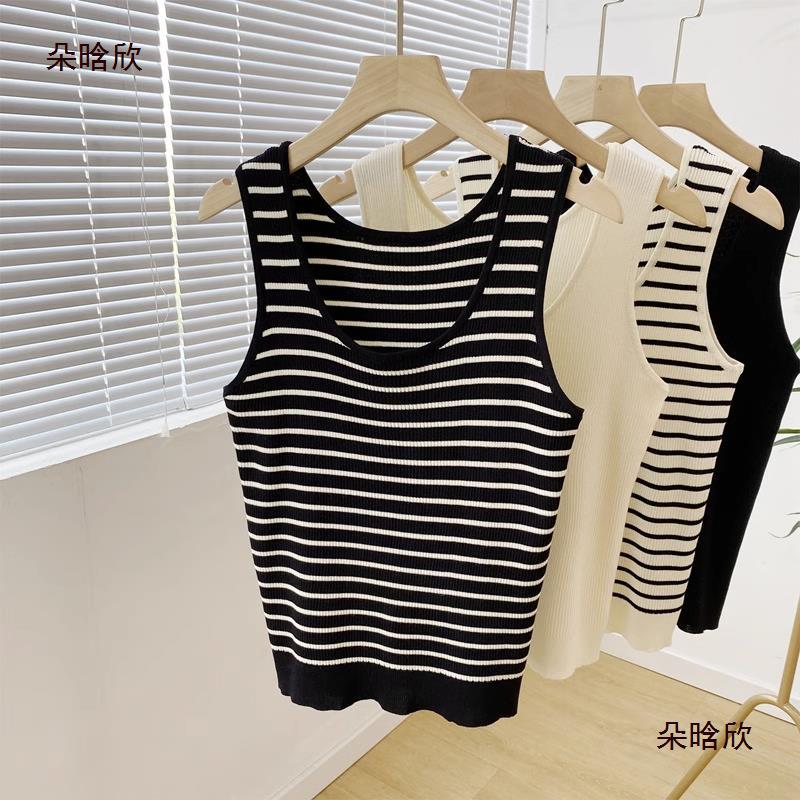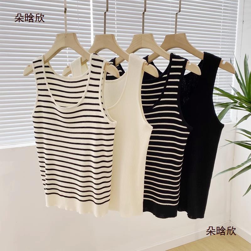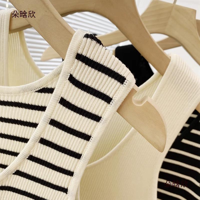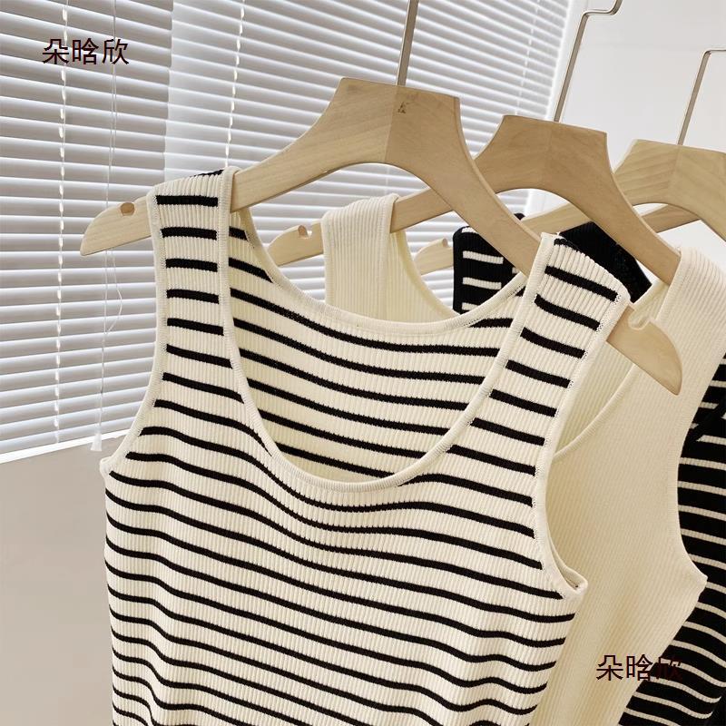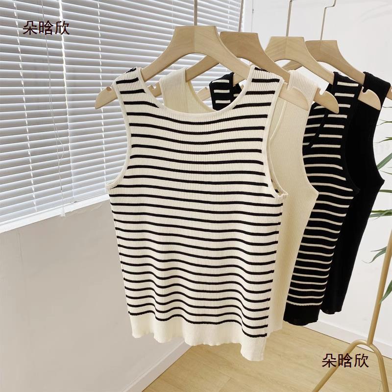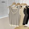 Chaleco de seda helada con cuello en U a rayas para mujer, diseño exterior con base interior de punto, sin mangas, corte entallado.