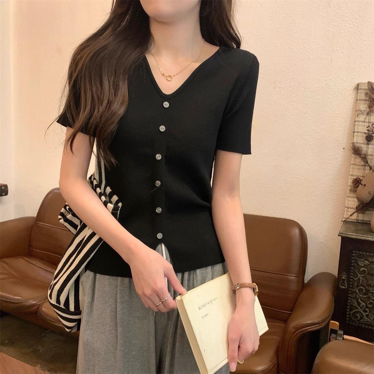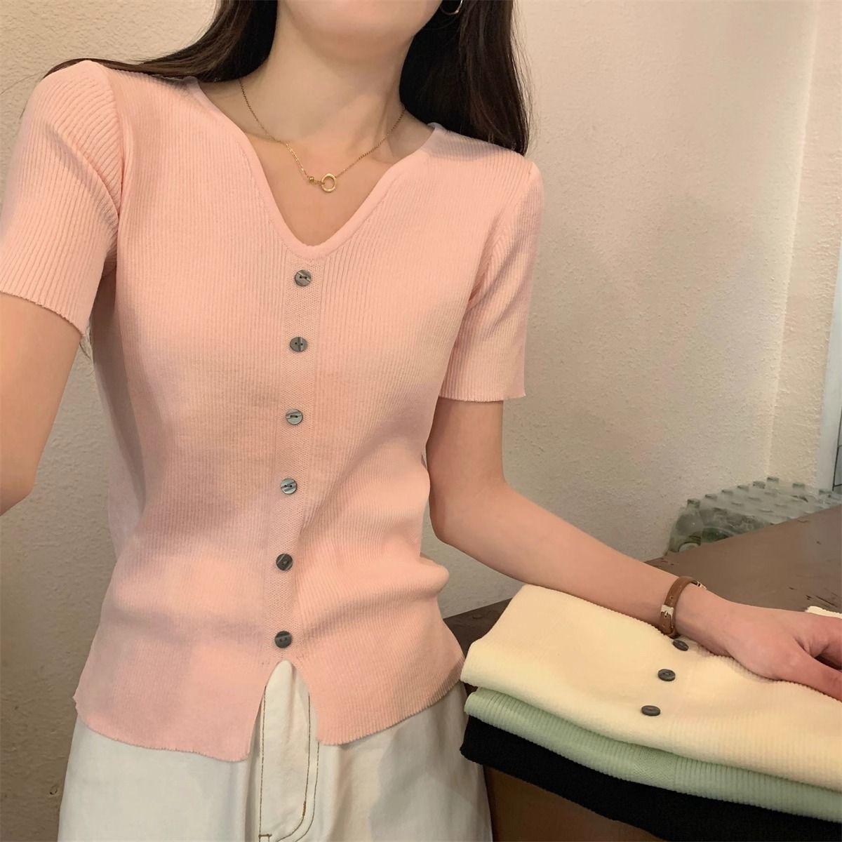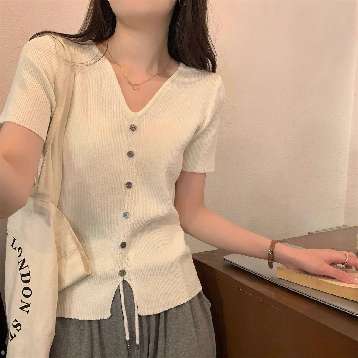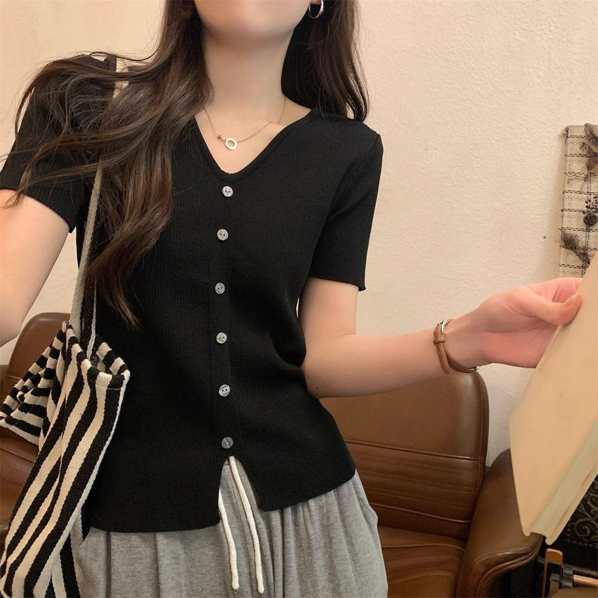 Verano Francés Cuello en V Abertura Botón Tejido de Punto Versátil Manga Corta Diseño para Mujer Único Entallado Elegante Top Trendy
