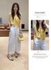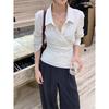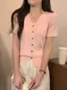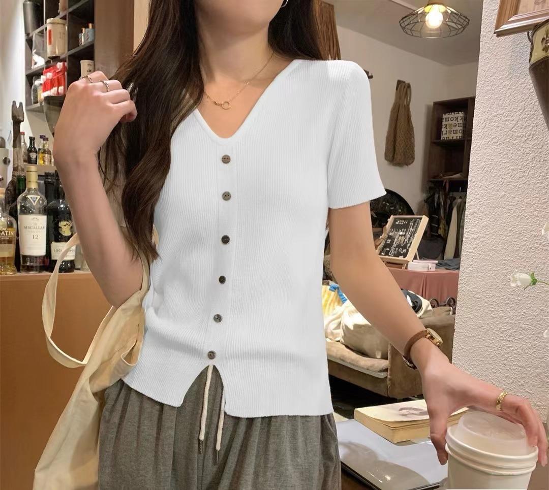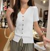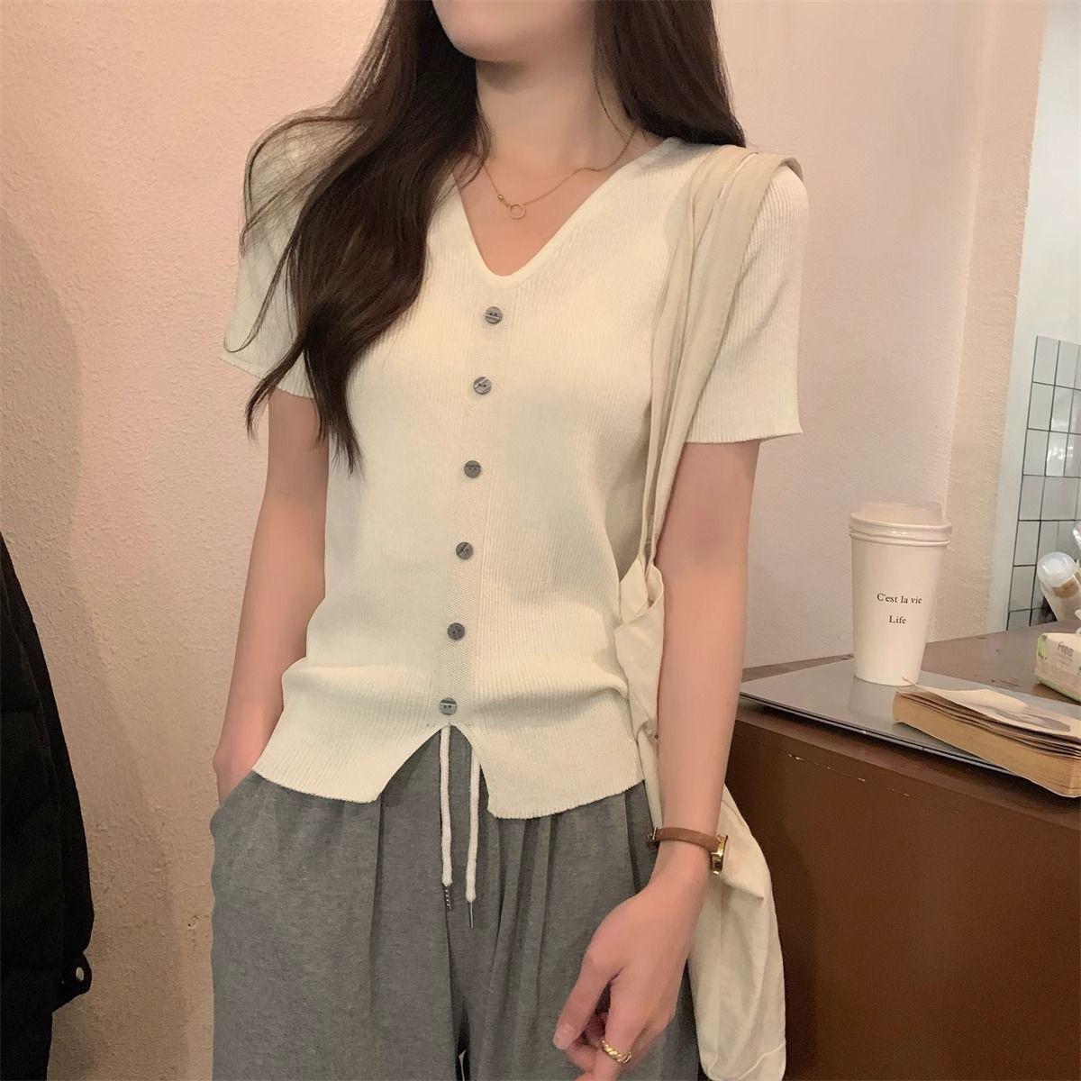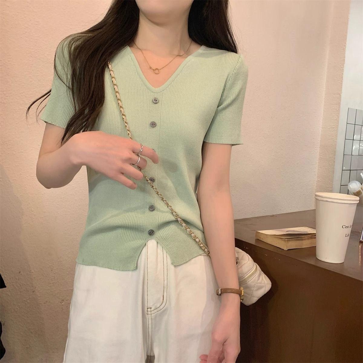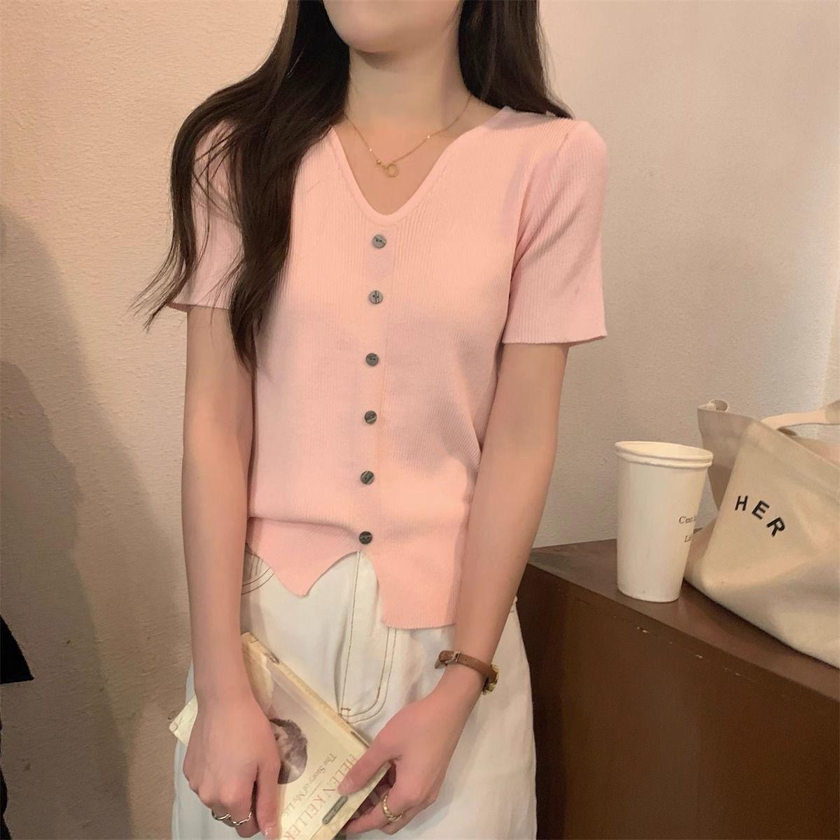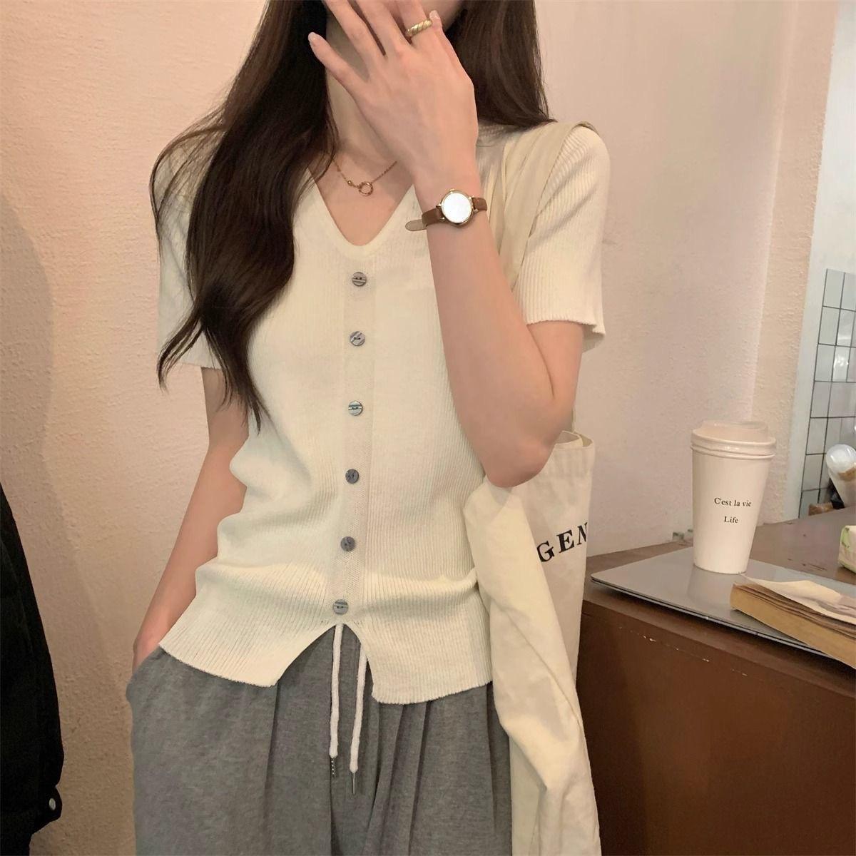 Verano Francés Cuello en V Abertura Botón Tejido de Punto Versátil Manga Corta Diseño para Mujer Único Entallado Elegante Top Trendy