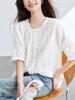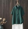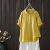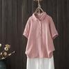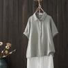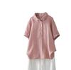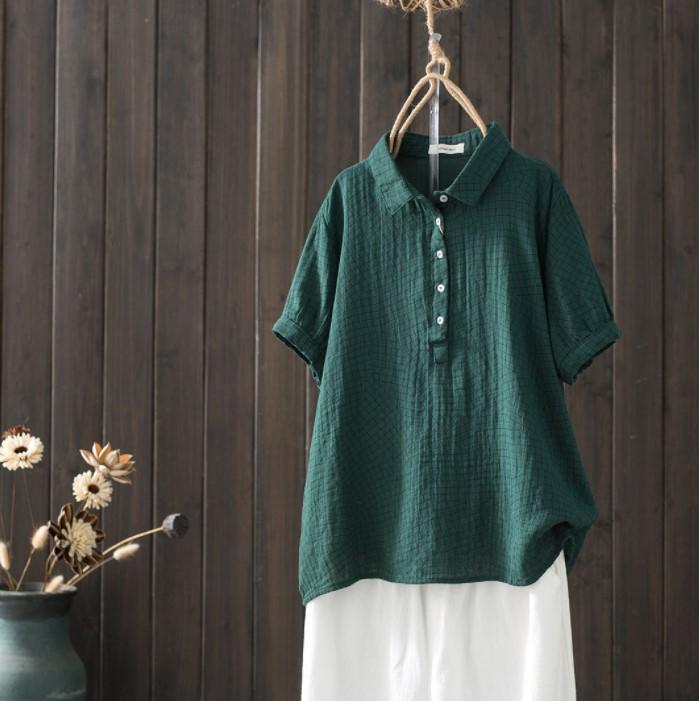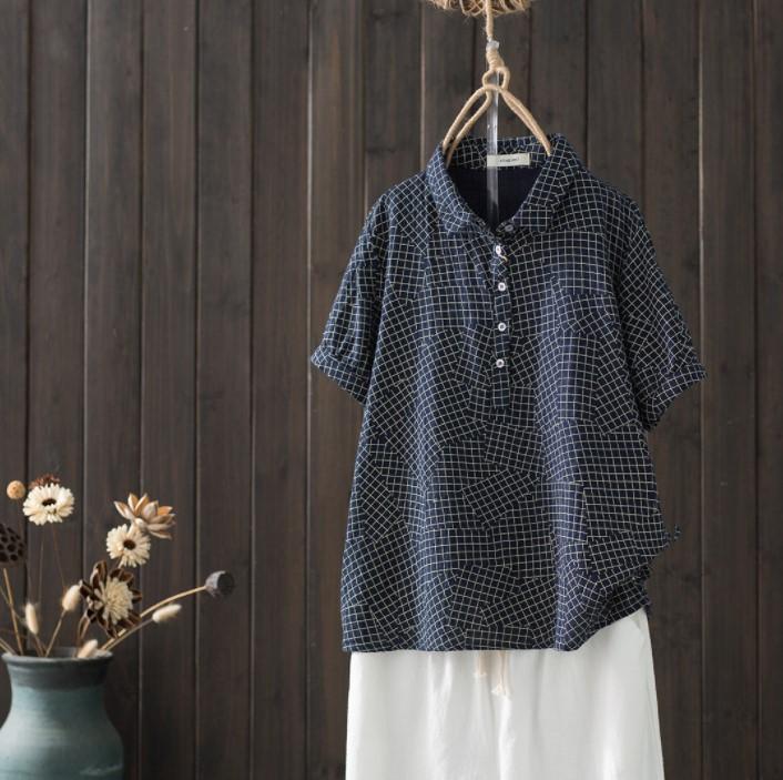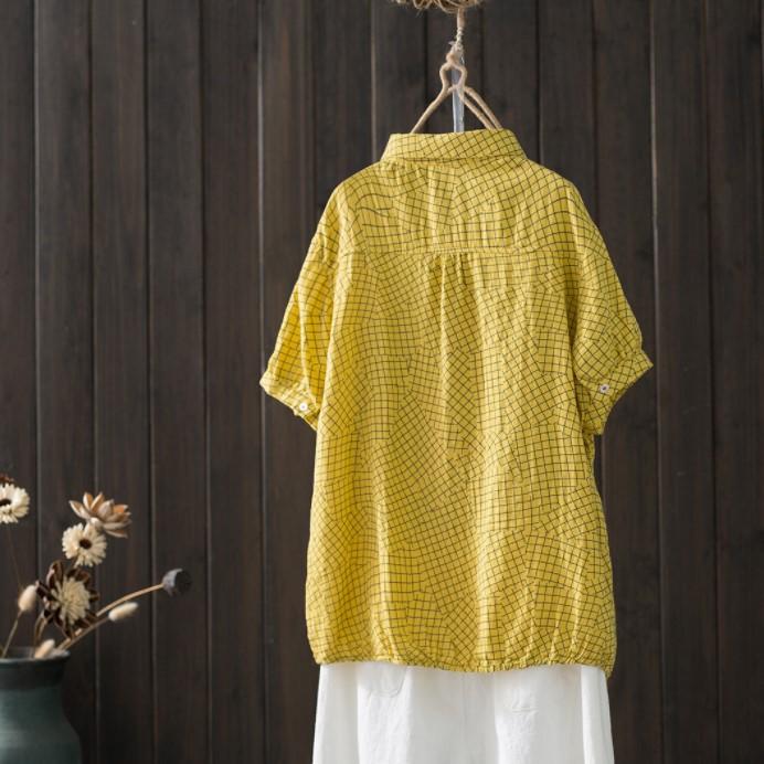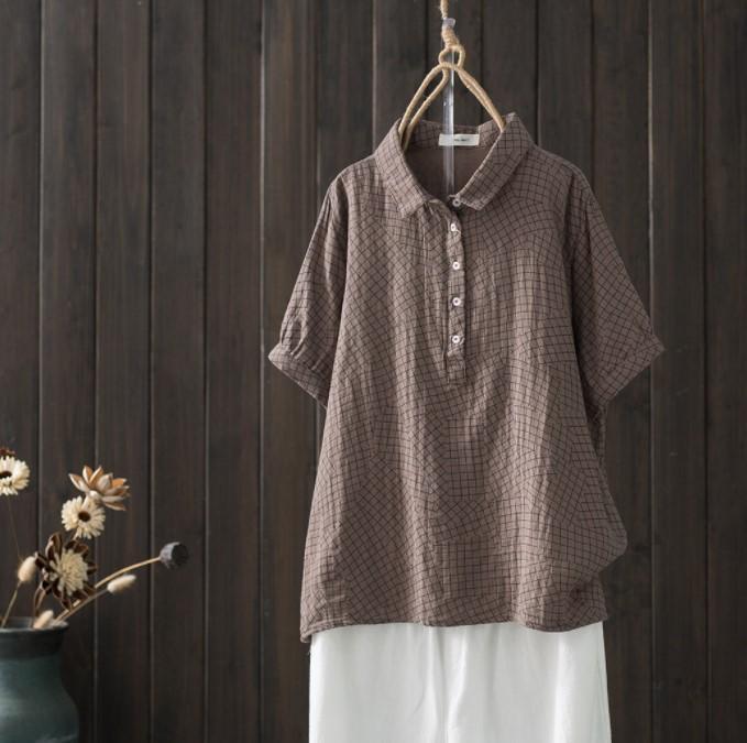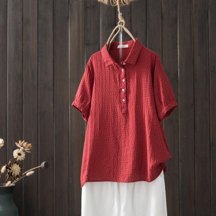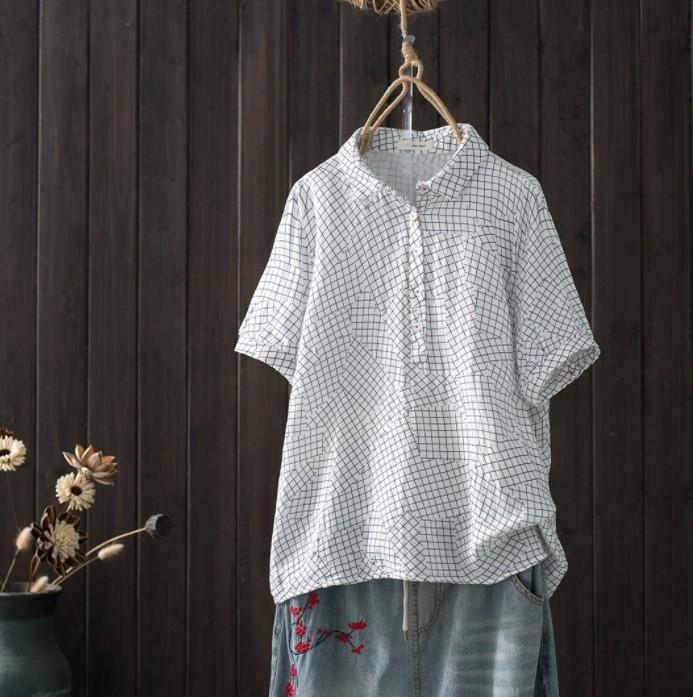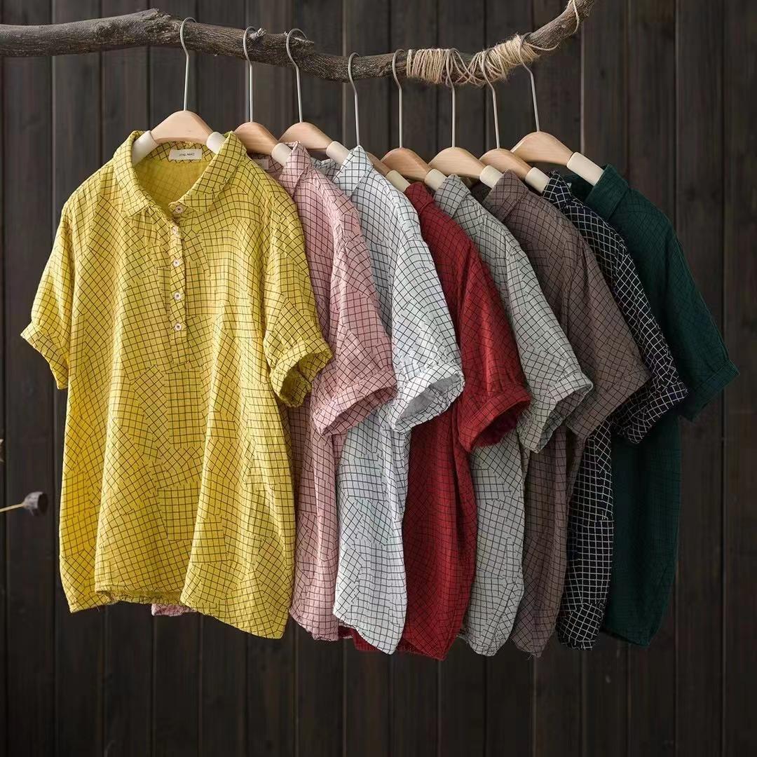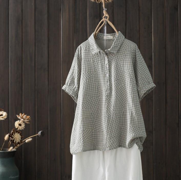 Camisa de manga corta de algodón de doble capa con costuras a cuadros, estilo artístico, holgada y adelgazante, para mujer, novedad de verano