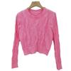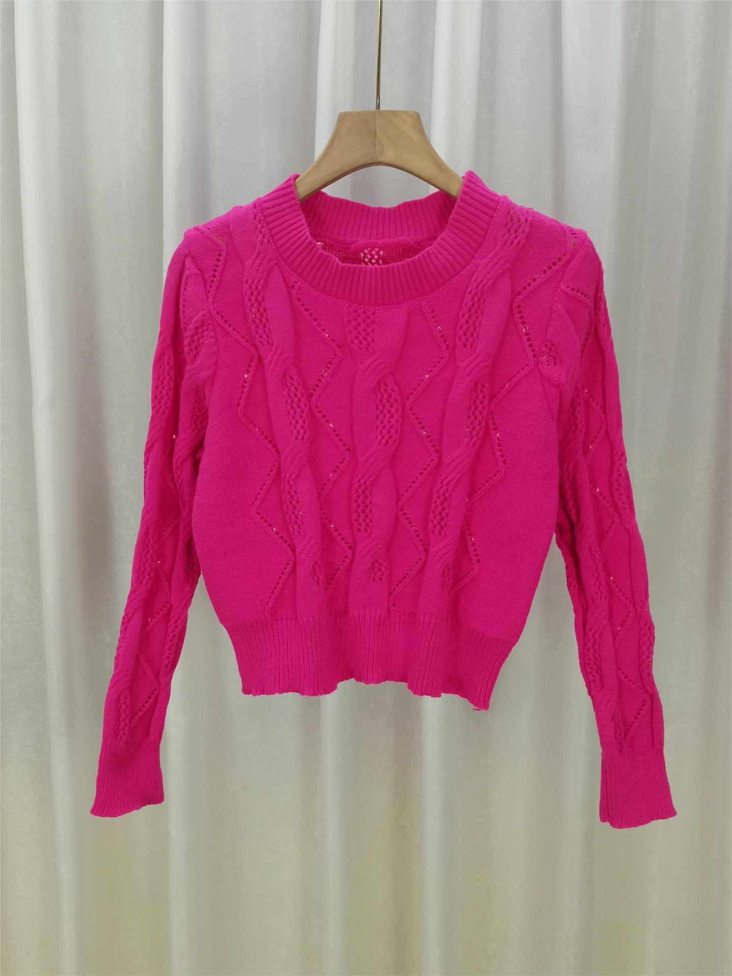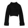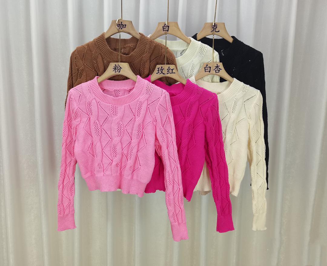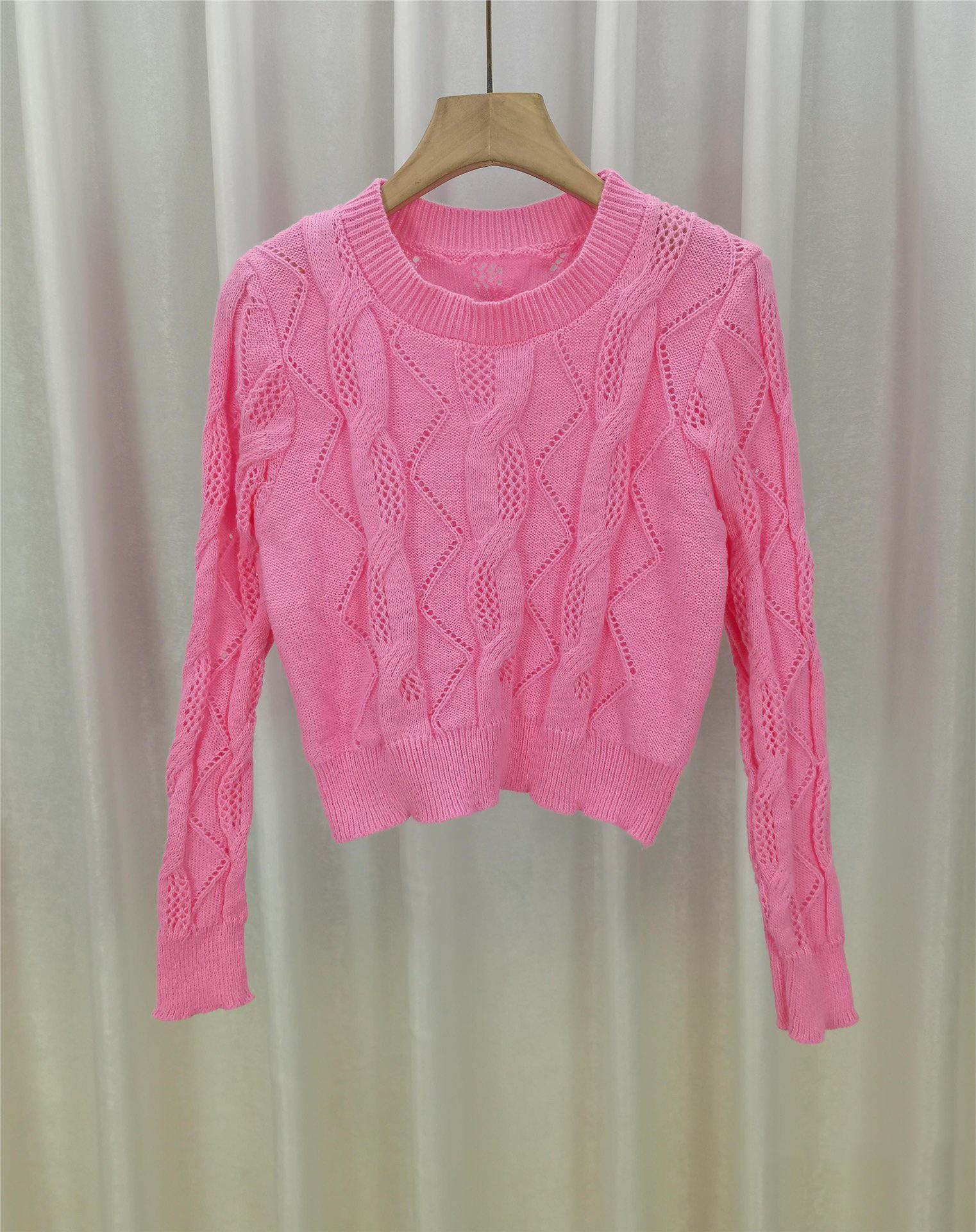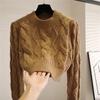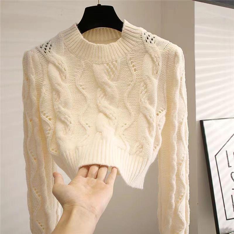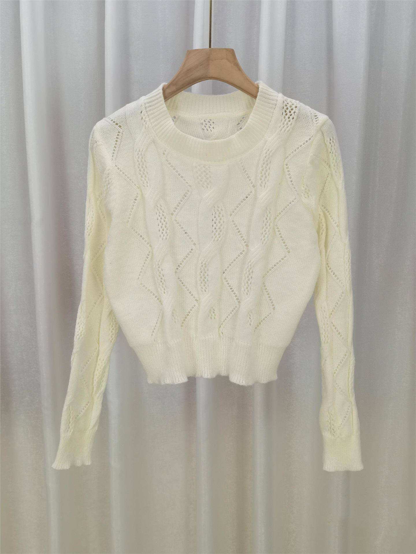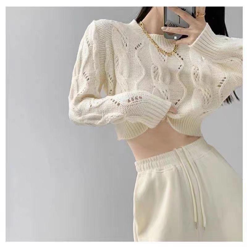Suéter Retro Calado de Cuello Redondo y Manga Larga Otoño Transfronterizo Nuevo Top Corto Sexy para Fondo de Mujer