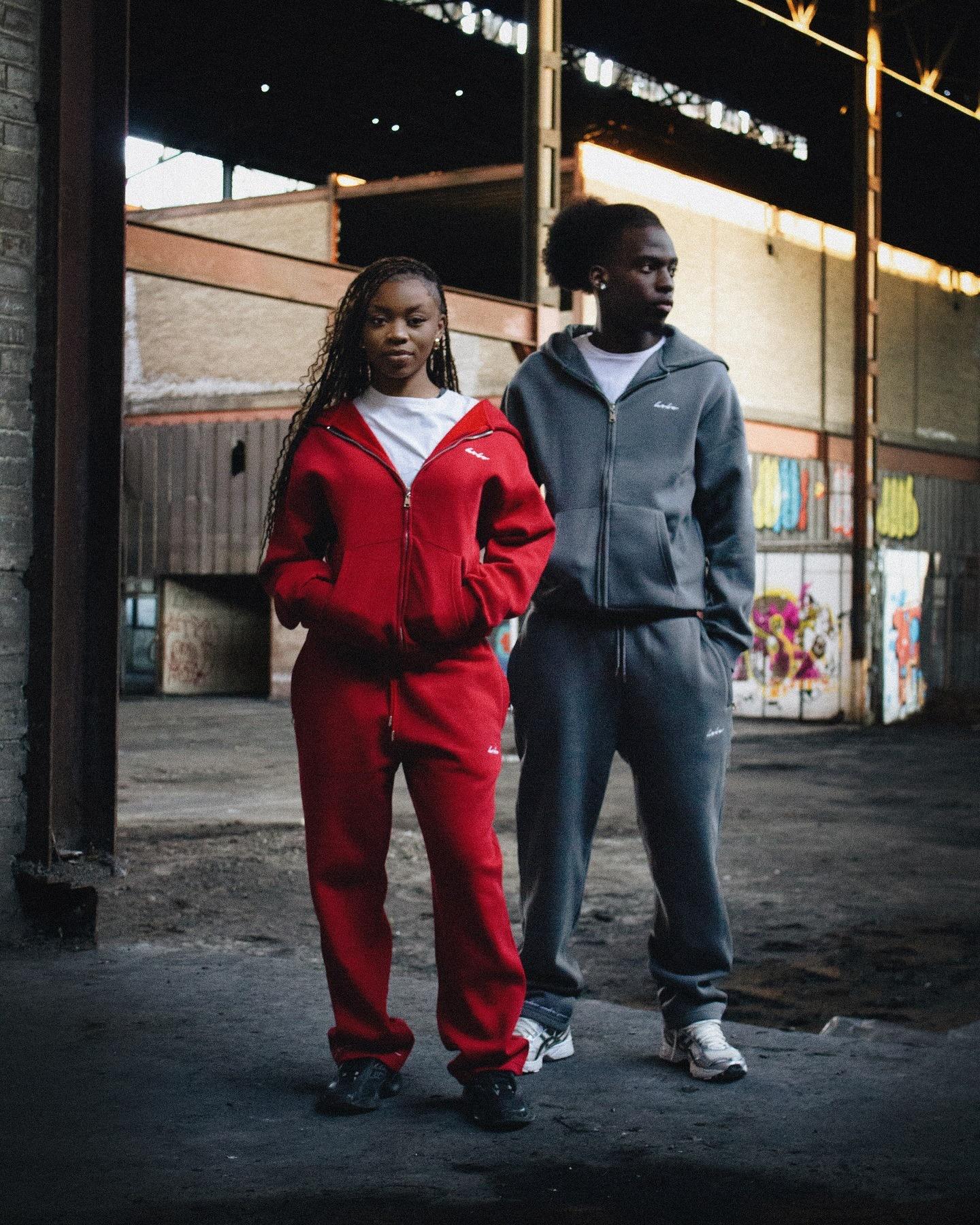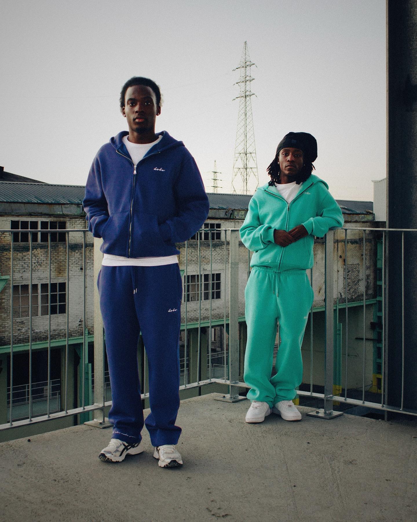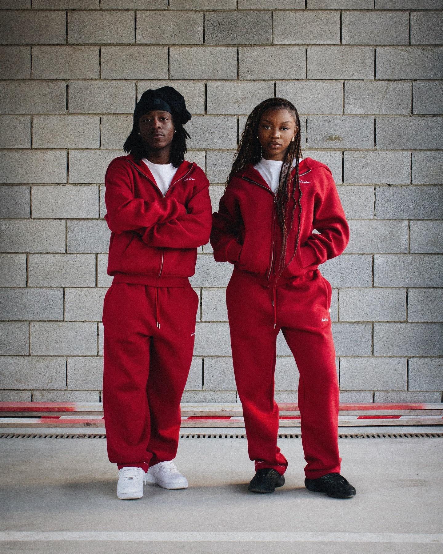 Gray sweatshirt, Gray trousers, Red sweatshirt, Red trousers, Blue sweatshirt, Blue trousers, Large quantity p...