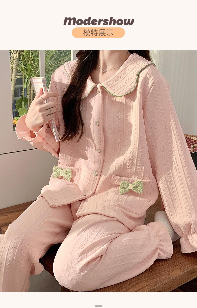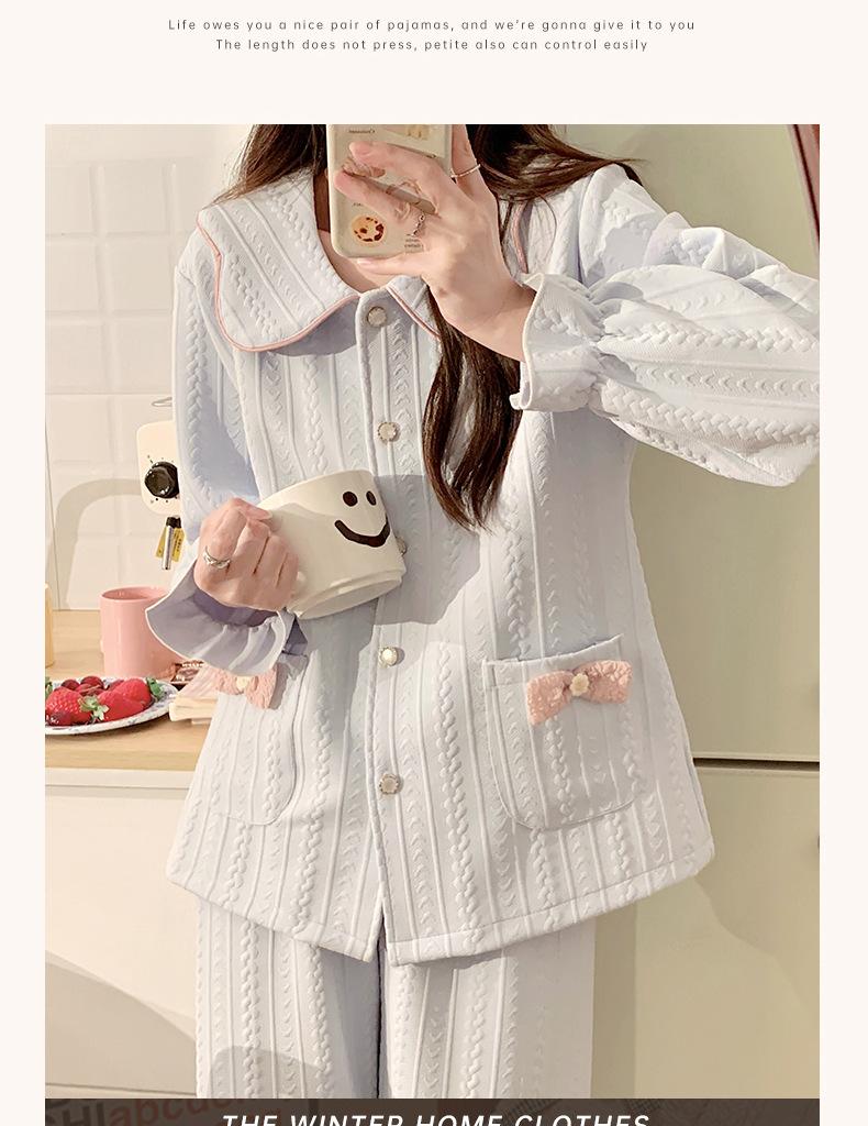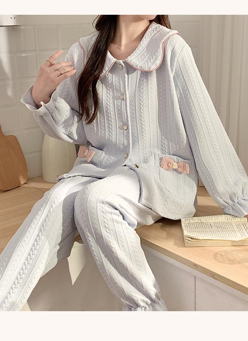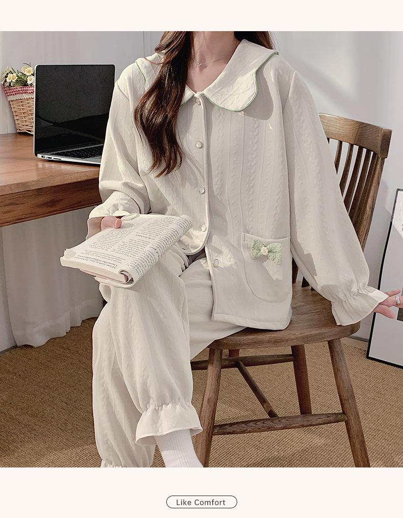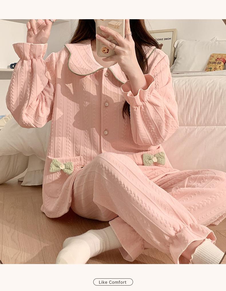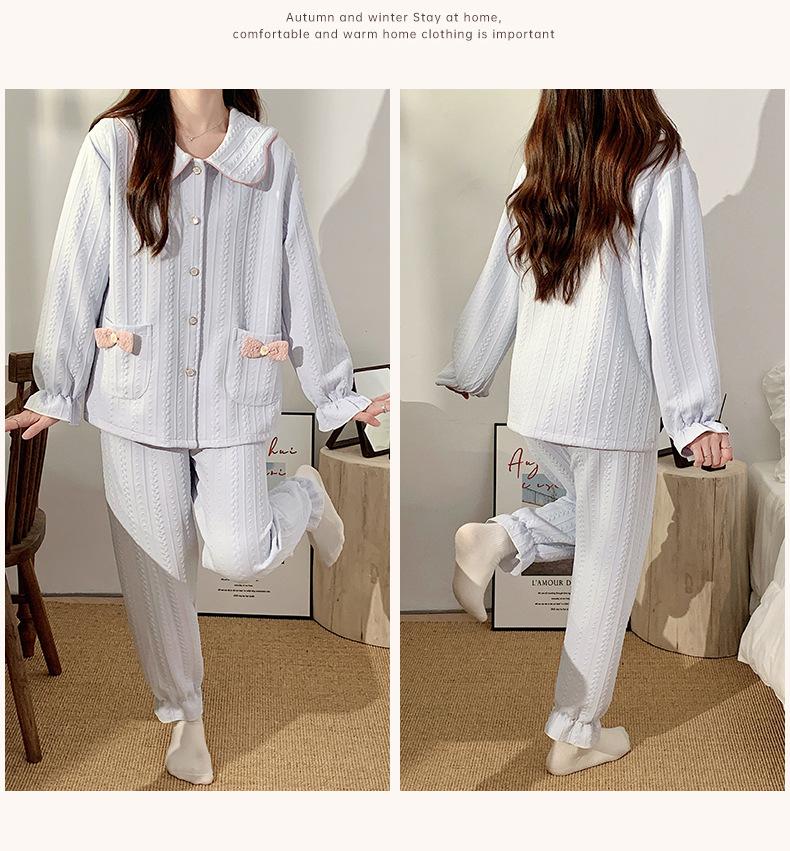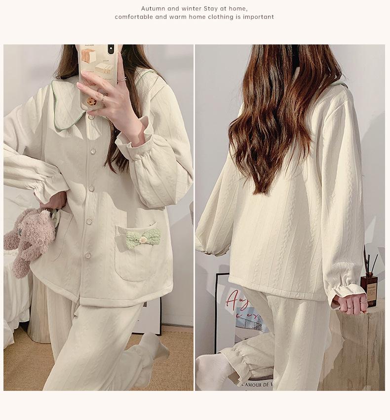 Pijama Sándwich de Algodón Aire para Mujer Otoño e Invierno Engrosado Estilo Princesa Dulce Cuello Muñeca Primavera y Otoño Traje de Ropa para el Hogar