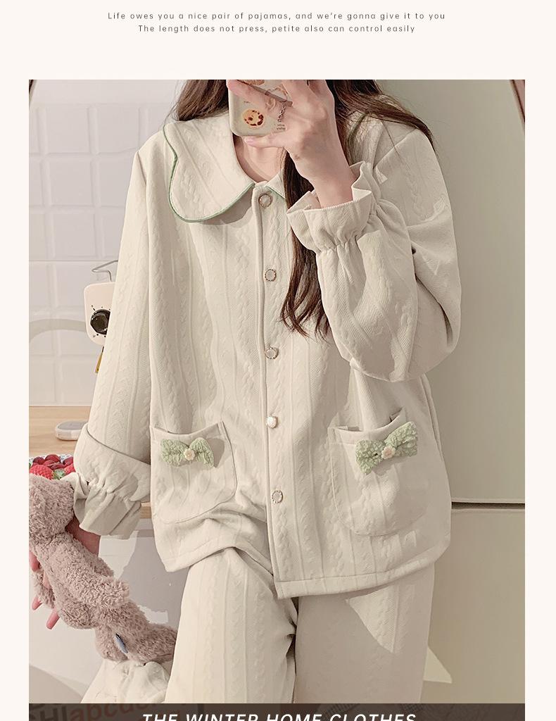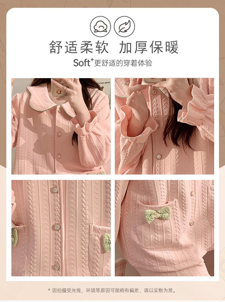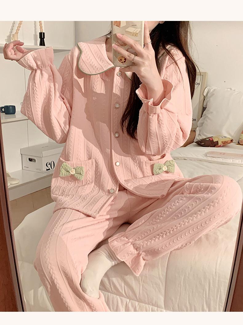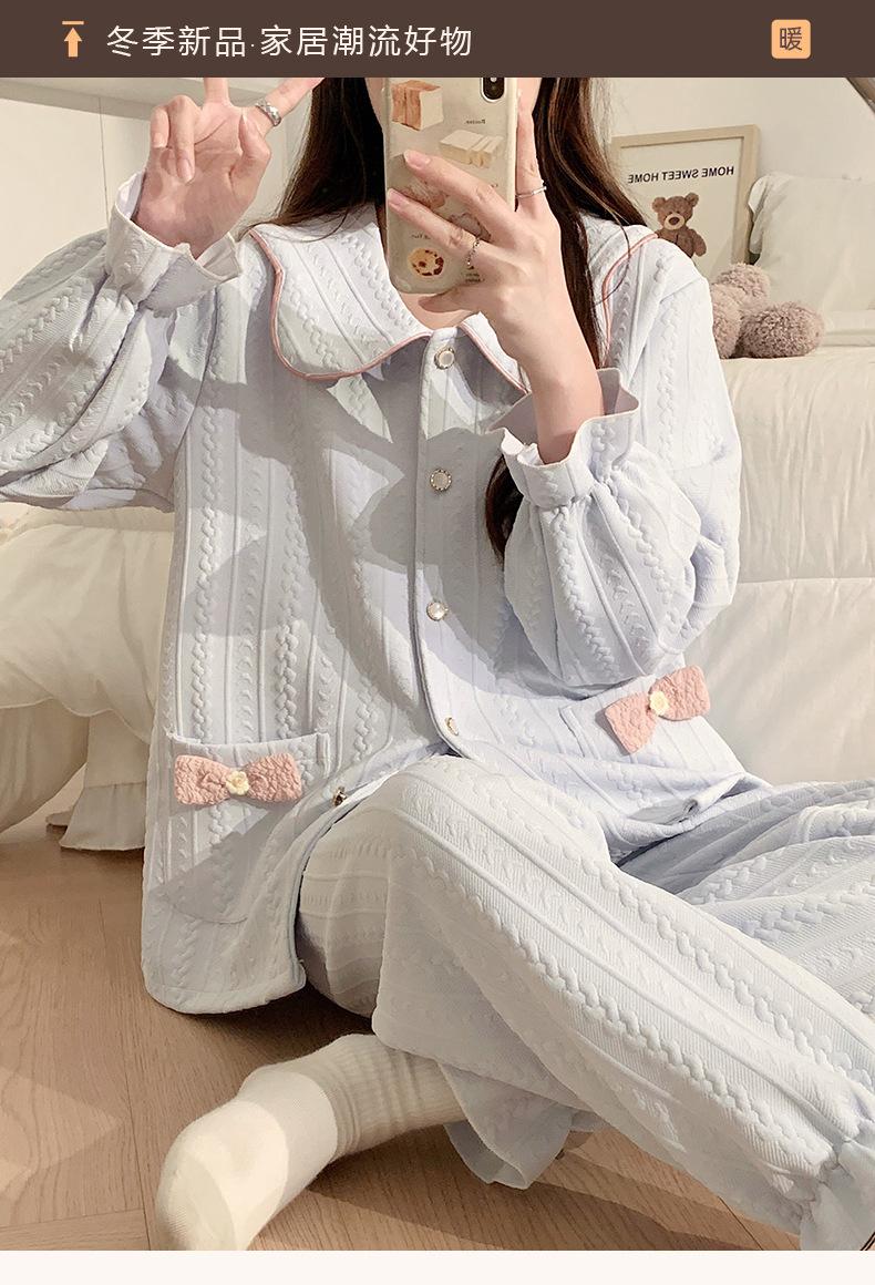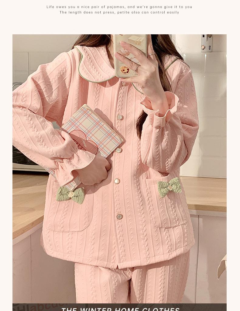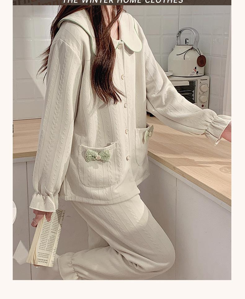 Pijama Sándwich de Algodón Aire para Mujer Otoño e Invierno Engrosado Estilo Princesa Dulce Cuello Muñeca Primavera y Otoño Traje de Ropa para el Hogar