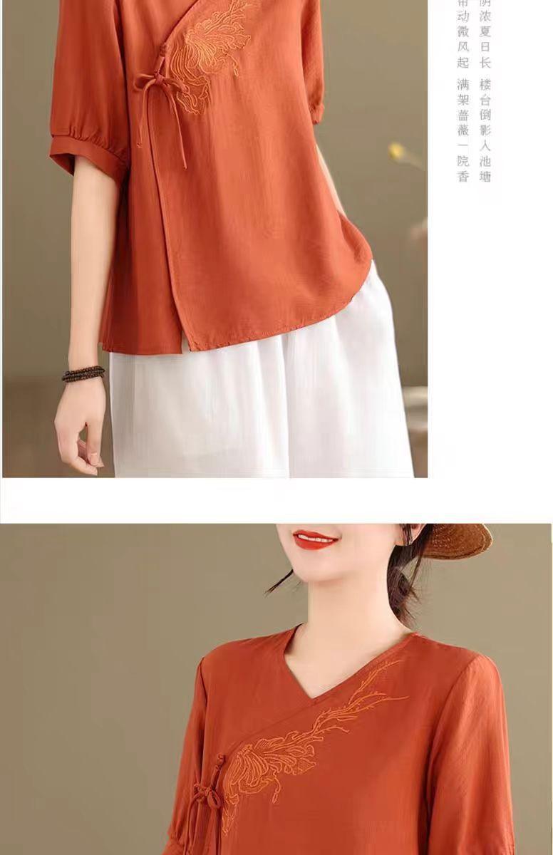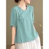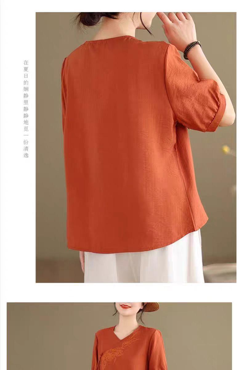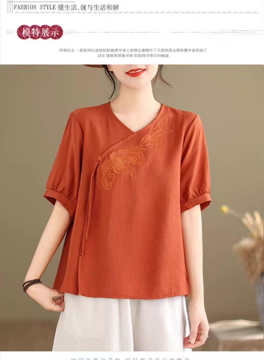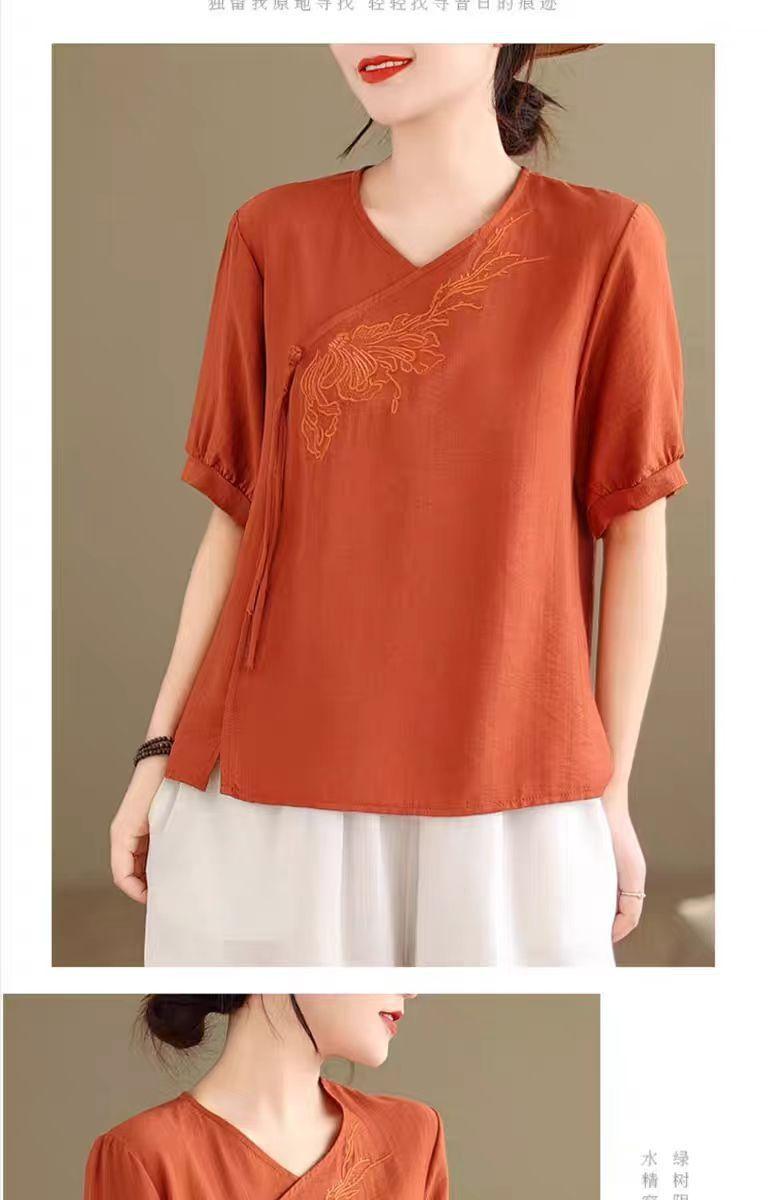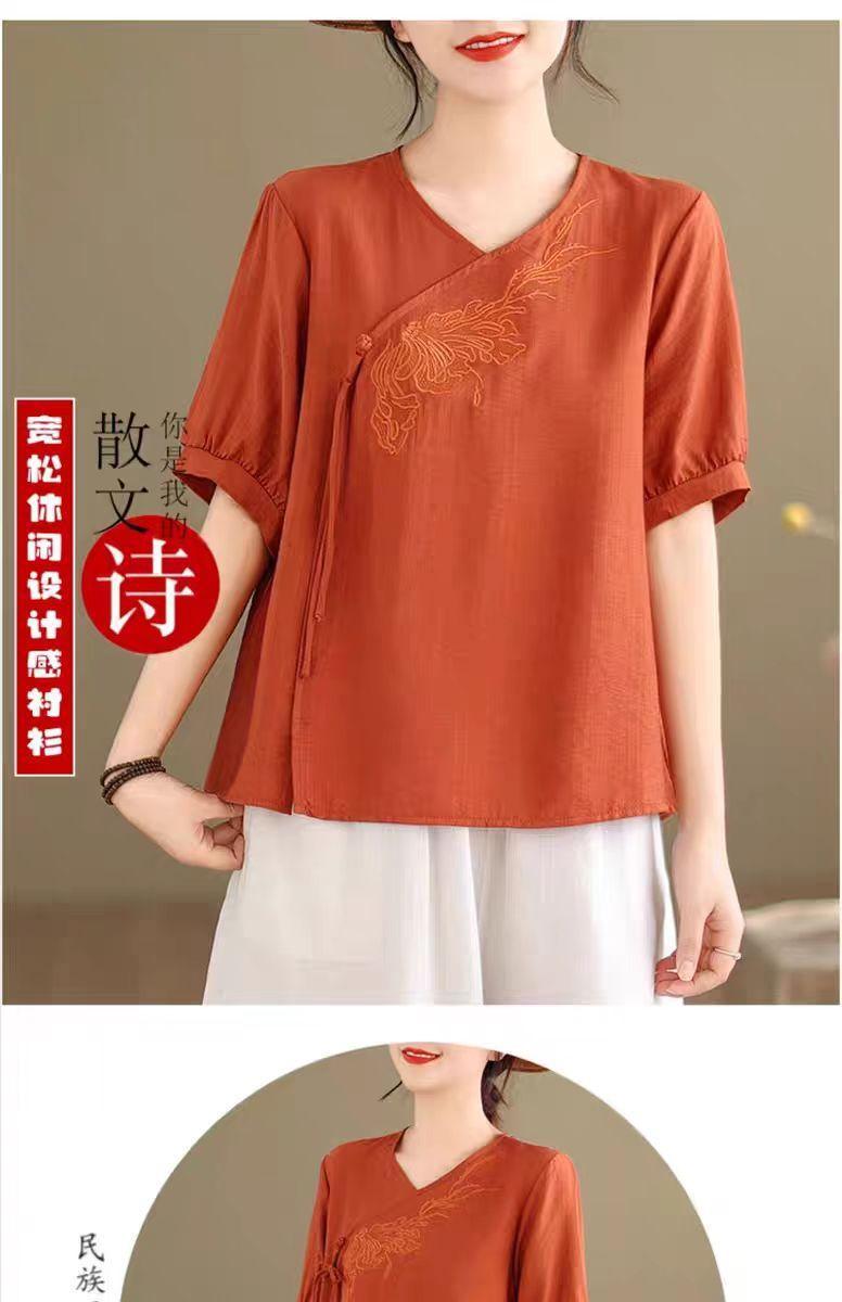 Camisa Casual de Algodón y Lino Bordada para Mujer Verano 2024 Nueva Vintage Cruzada de Manga Corta Camisa Holgada Versátil Top