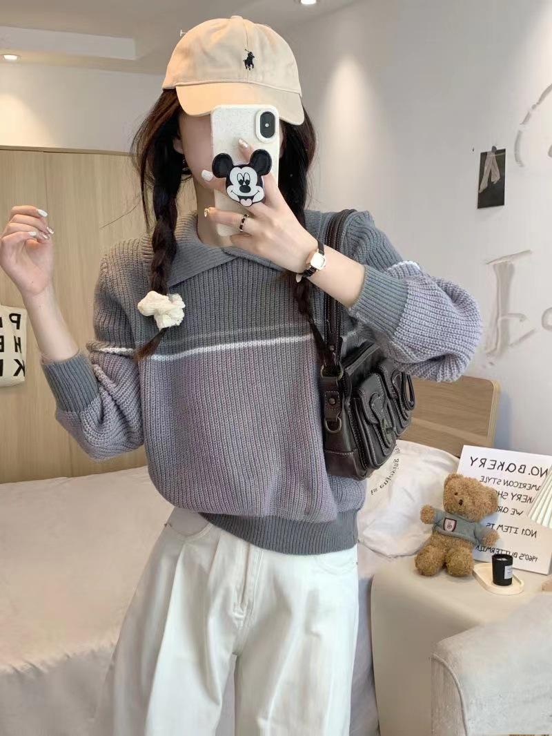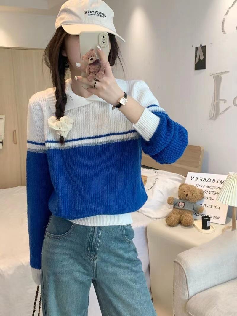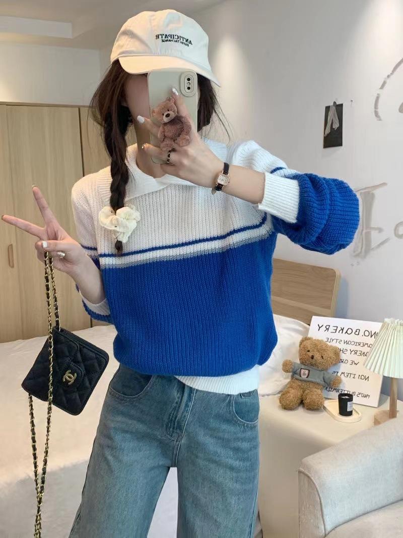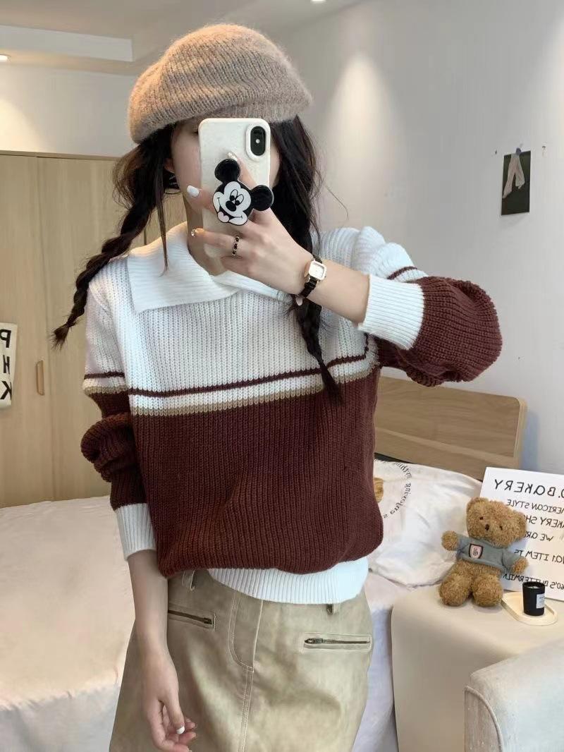 Tejido de Punto con Cuello Polo de Color Contrastante para Mujer Otoño e Invierno 2023 Nuevo Estilo Holgado y Relajado Versátil Suéter de Punto de Manga Larga