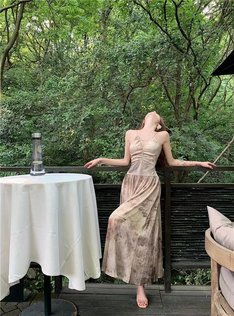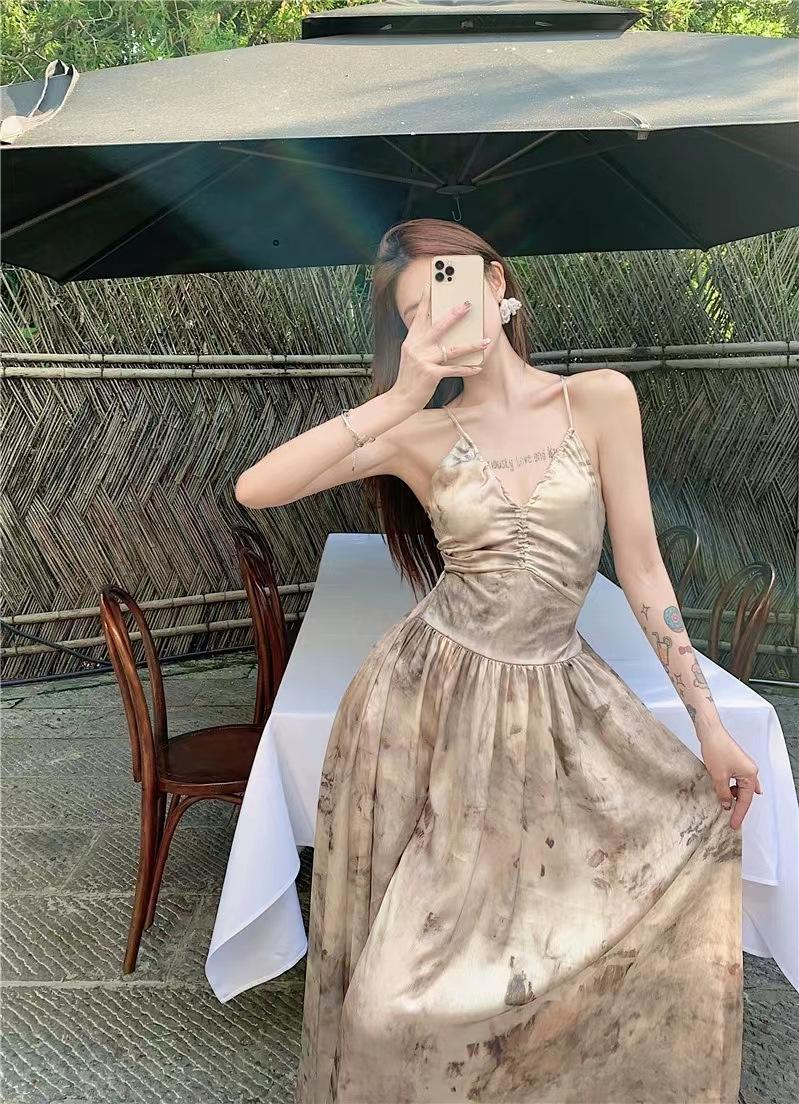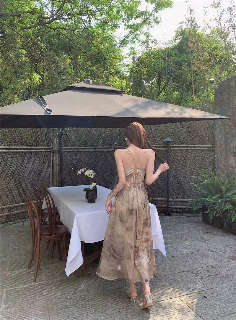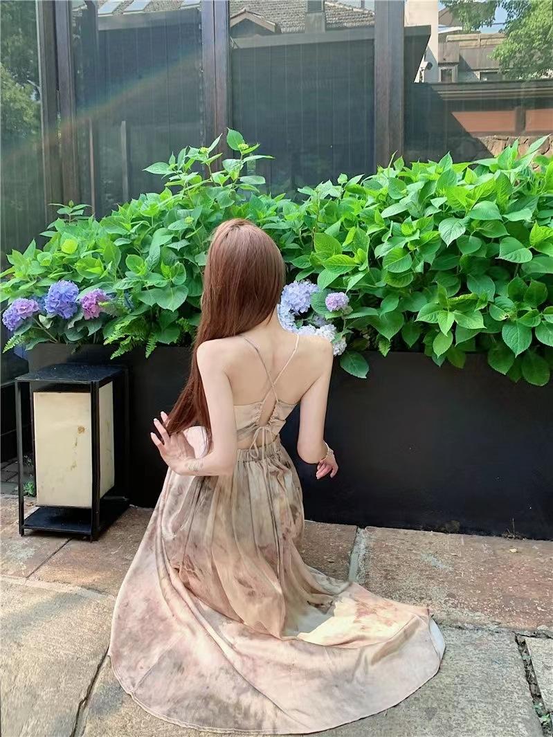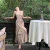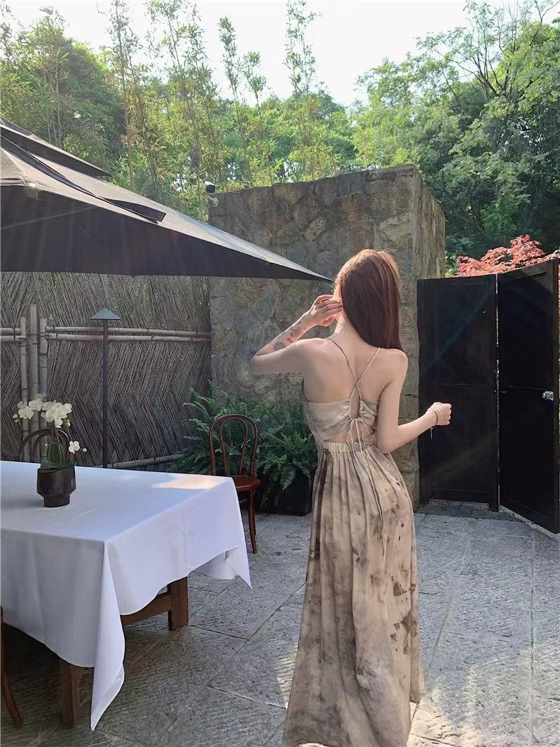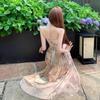 Vestido de tirantes estilo francés para mujer, falda de verano para la hora del café, falda sin espalda a la cintura, falda retro elegante de largo medio