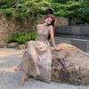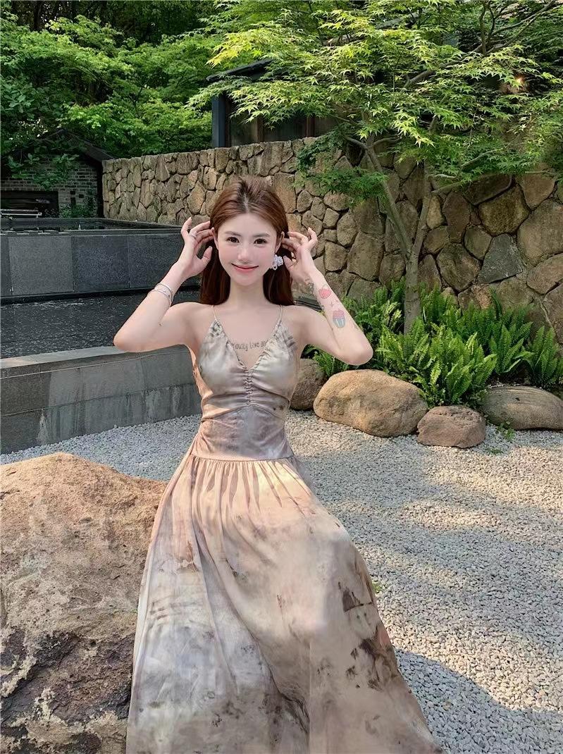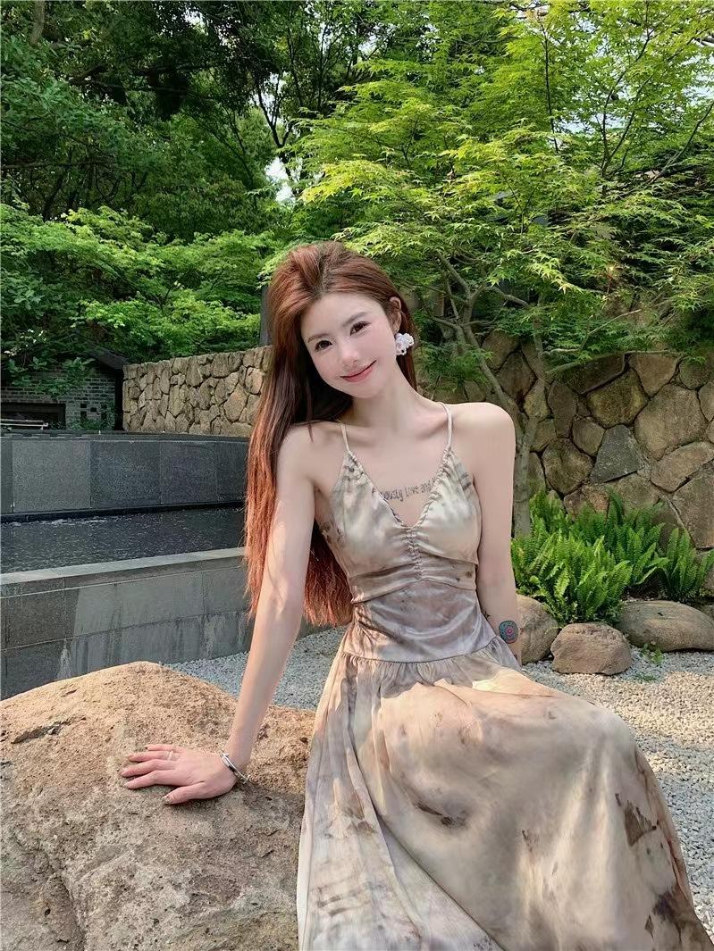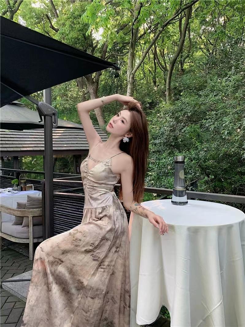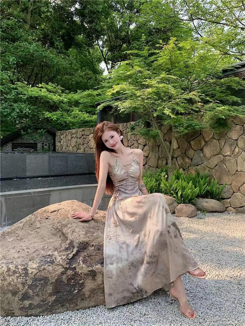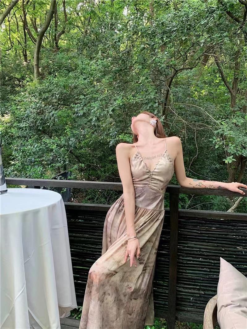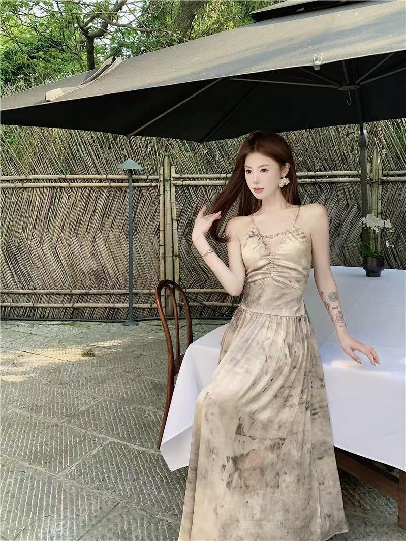 Vestido de tirantes estilo francés para mujer, falda de verano para la hora del café, falda sin espalda a la cintura, falda retro elegante de largo medio