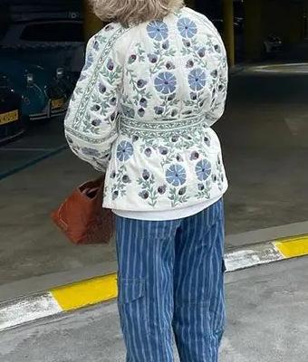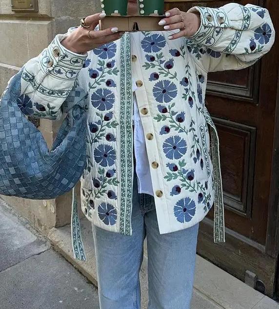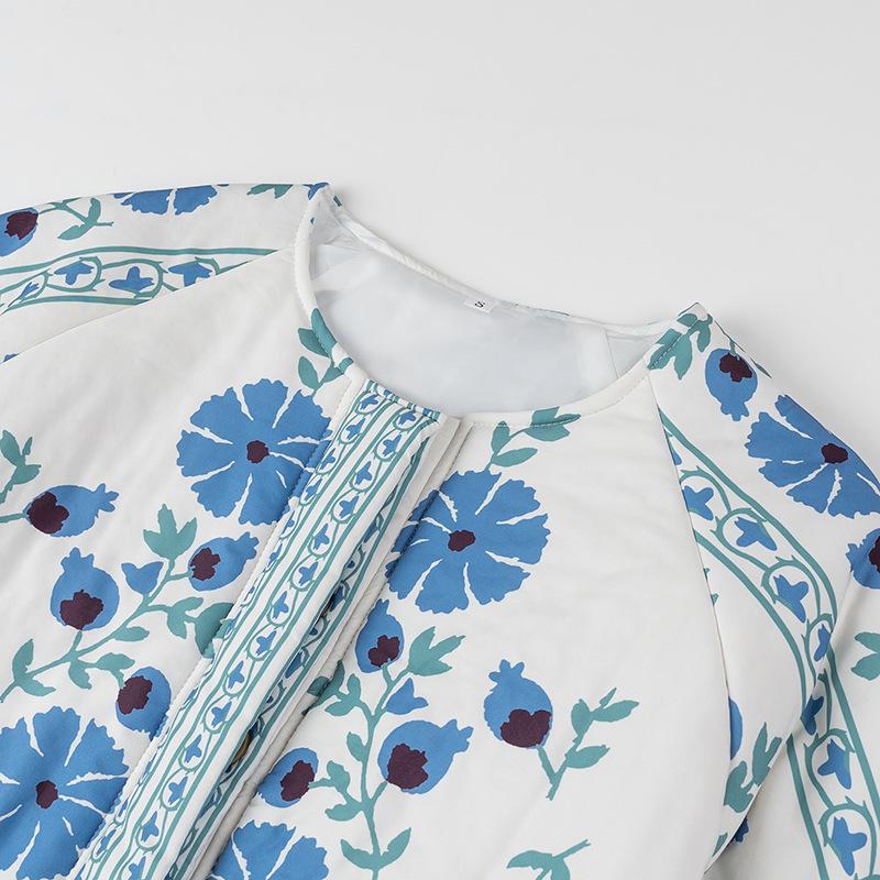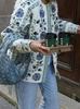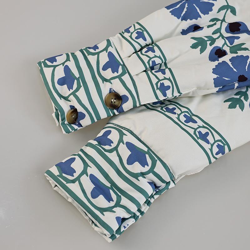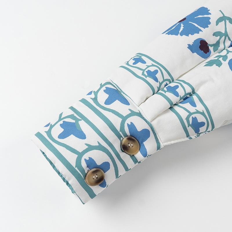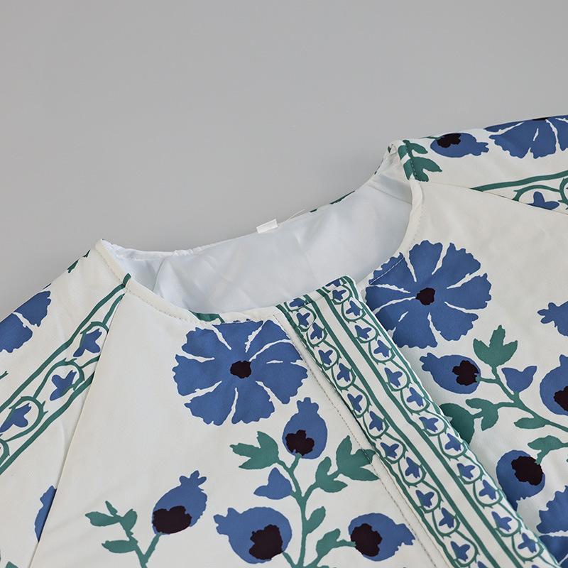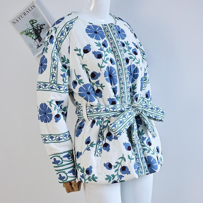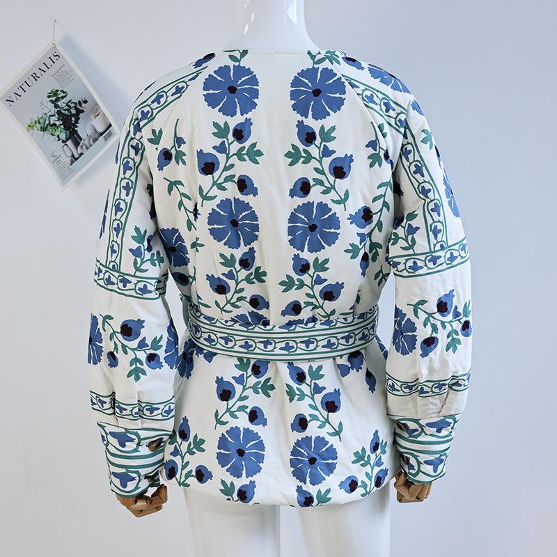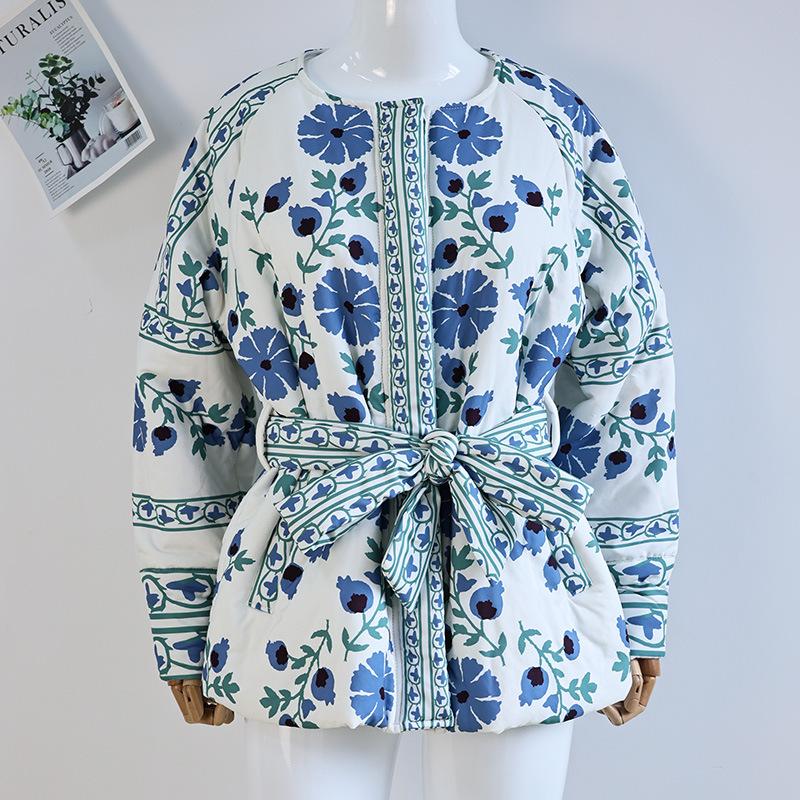 Otoño e invierno 2024 Europa y Estados Unidos transfronterizo moda temperamento azul estampado encaje cintura abrigo acolchado de algodón calle hipster