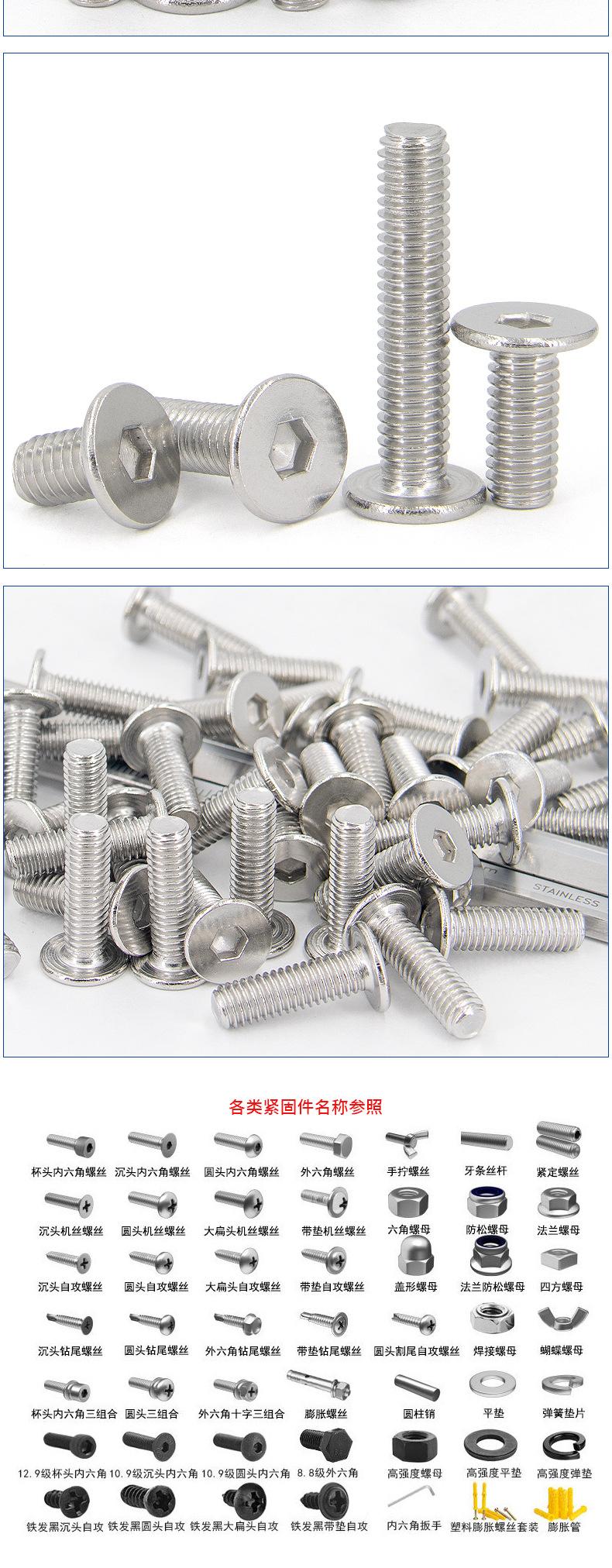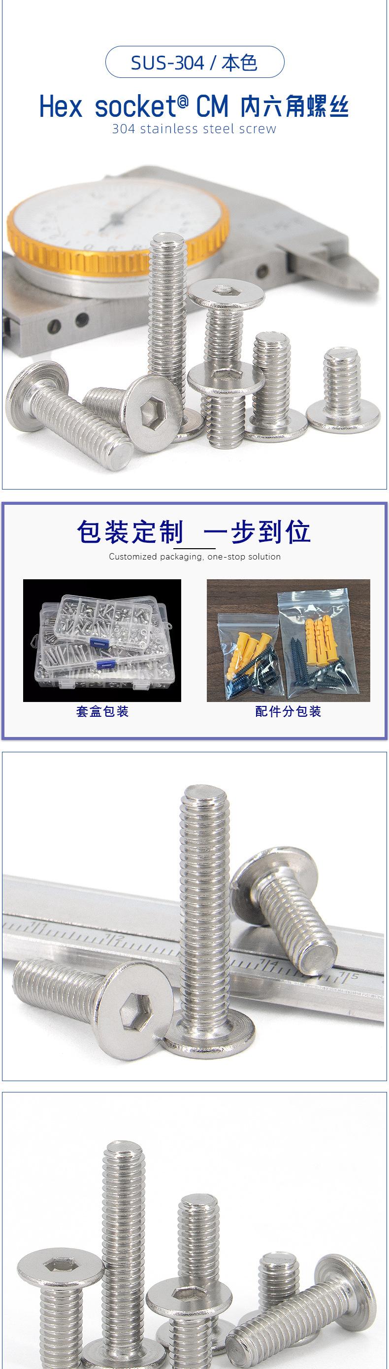 Tornillo de máquina de acero inoxidable 304 de cabeza plana delgada con hexágono interior CM, tornillo de diente de máquina de hexágono interior, tornillo de pieza estándar M5 ~ M8