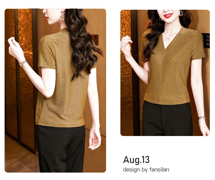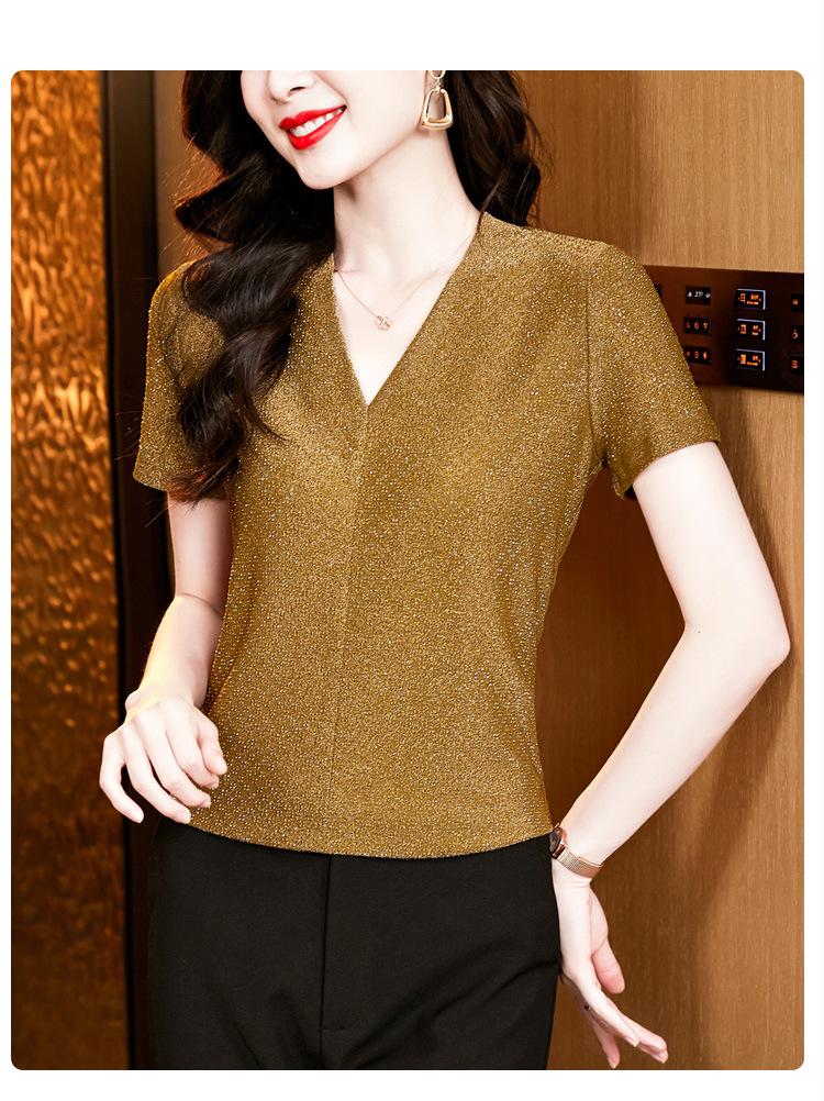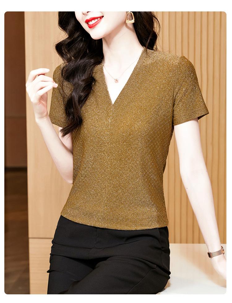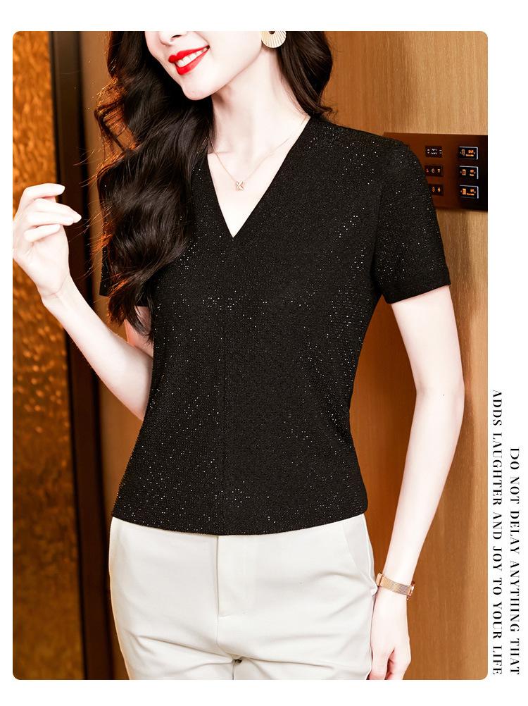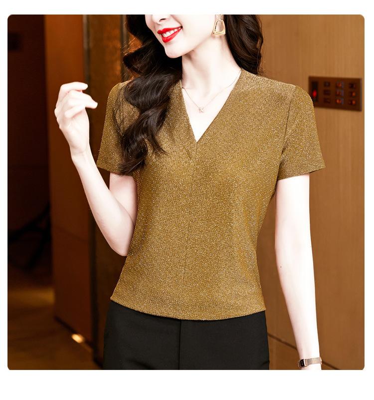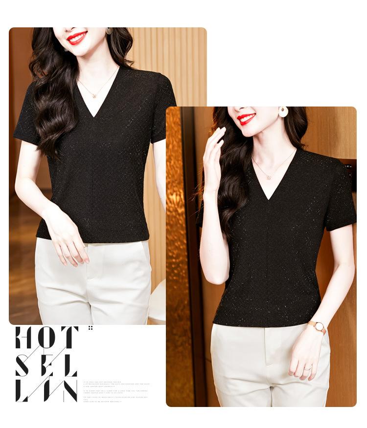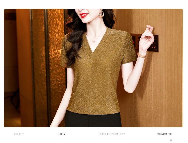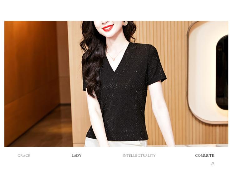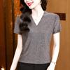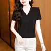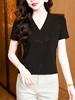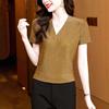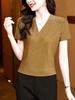 2025 Verano Nuevo Elegante Combinable Cuello en V Color Sólido Manga Corta Camiseta Básica Casual Delgada Jersey Top Camiseta de Moda para Mujer