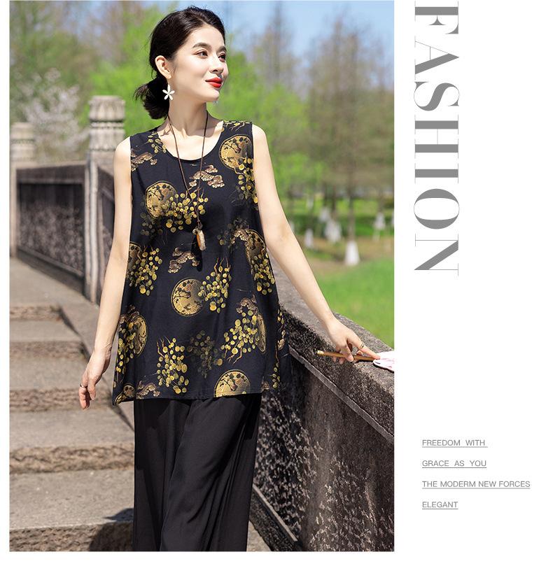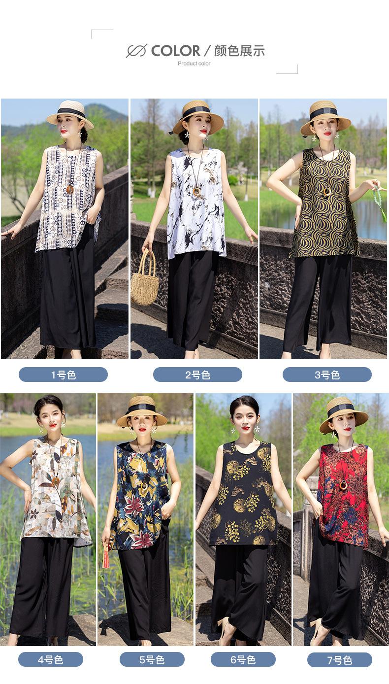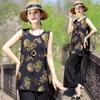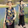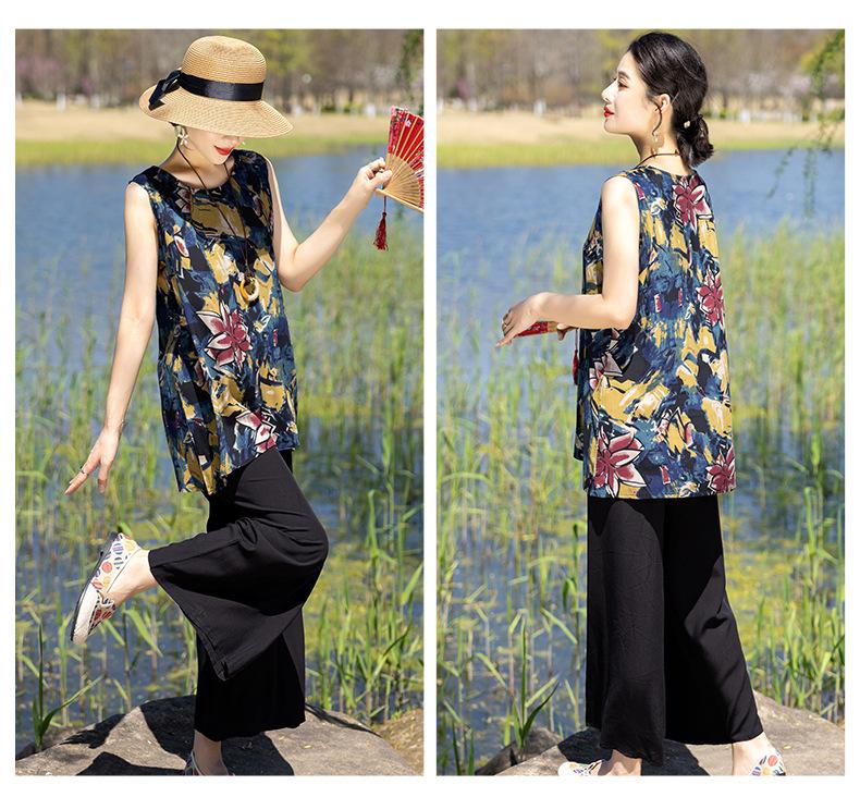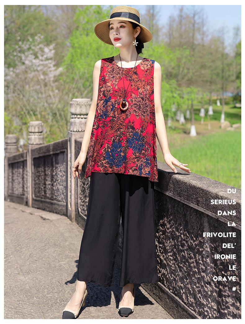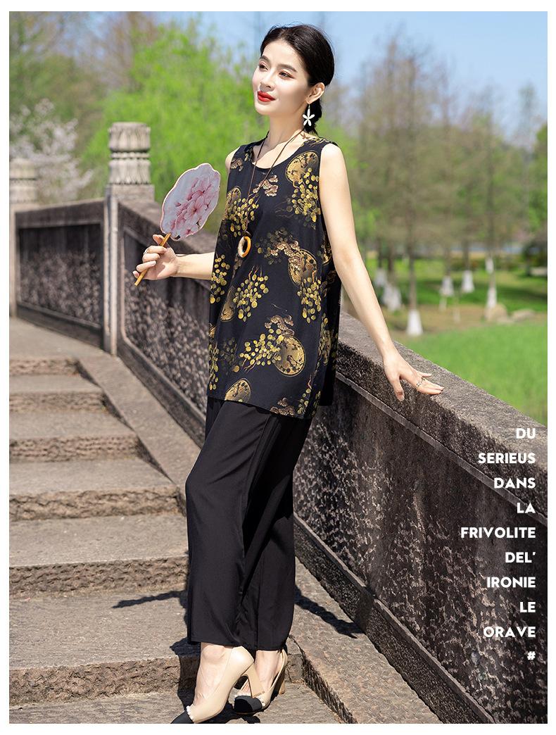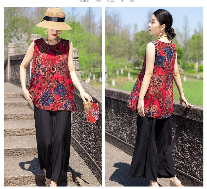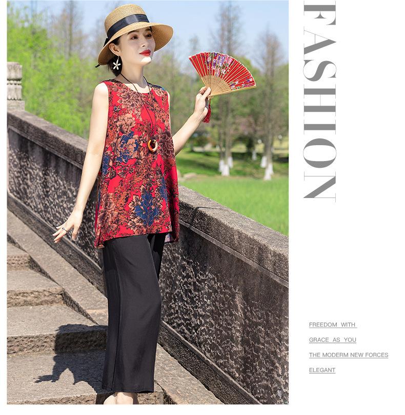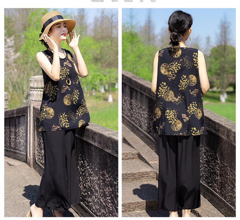 Traje Elegante de Estilo Nacional Floral de Algodón Seda para Mujer, Pijama de Verano para Exterior, Sin Mangas, Pantalones, Ropa de Casa Holgada para Madres de Mediana Edad y Ancianas