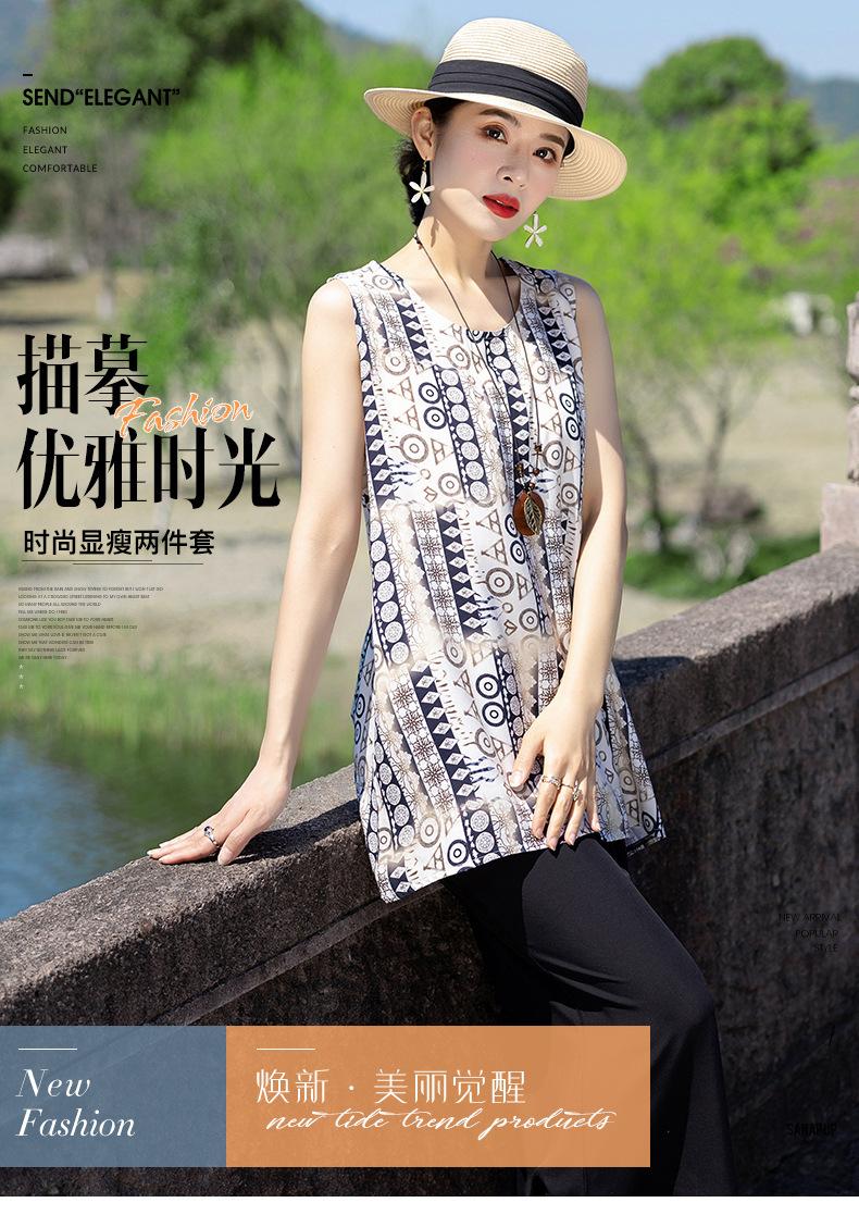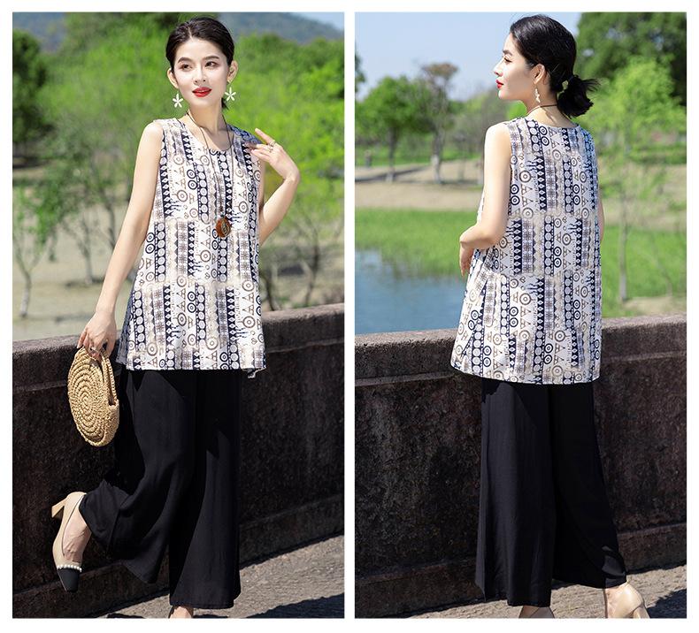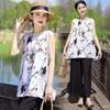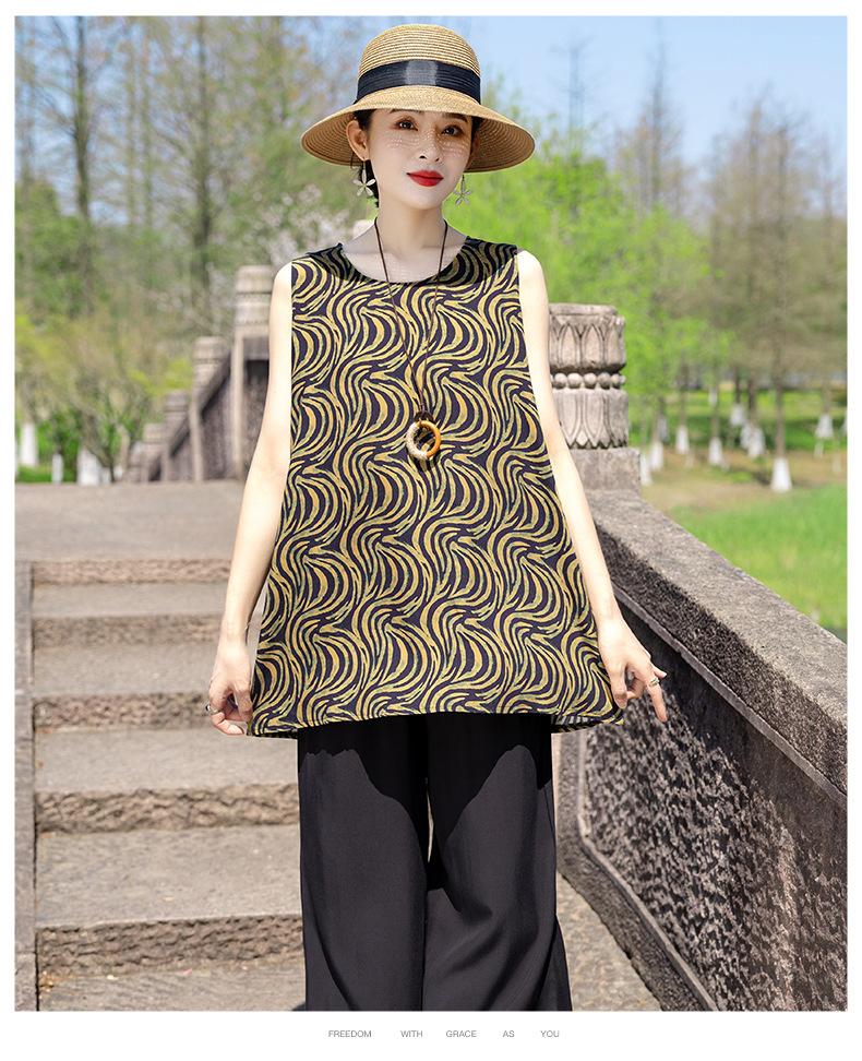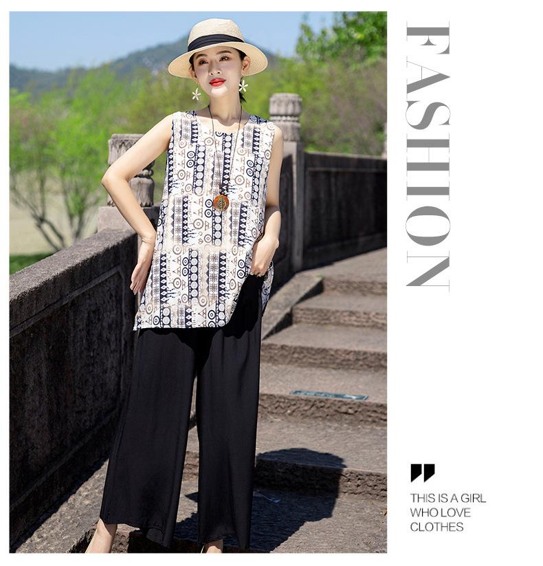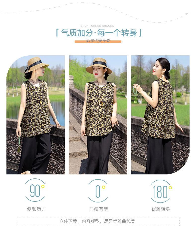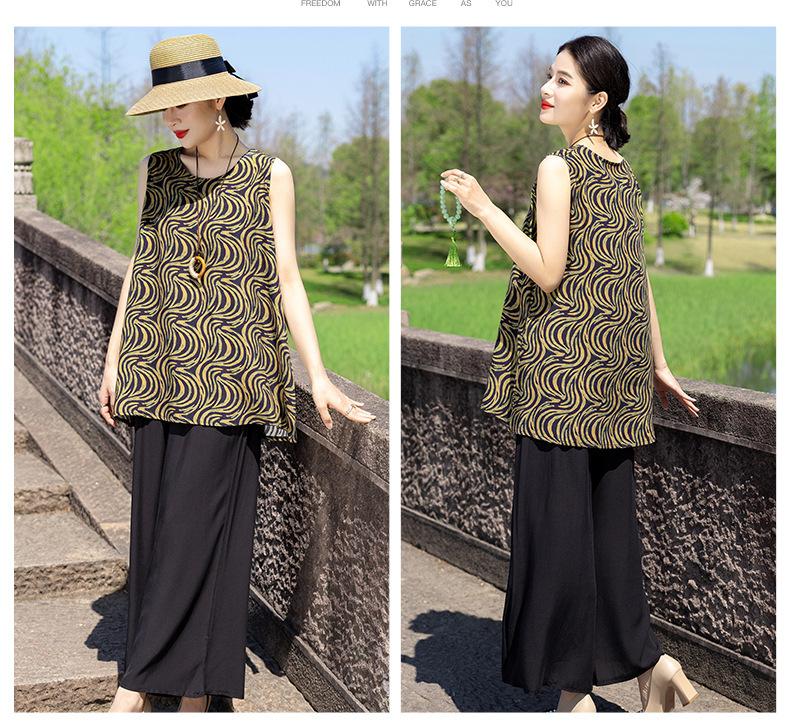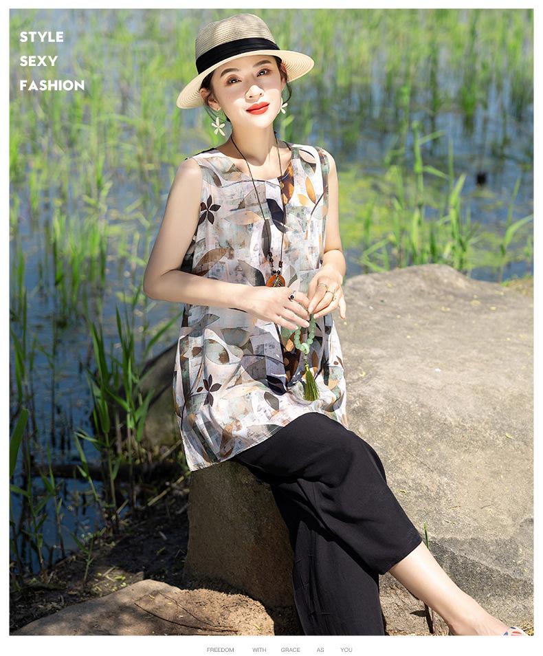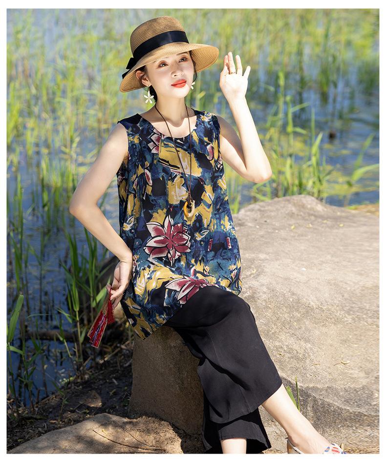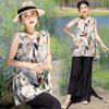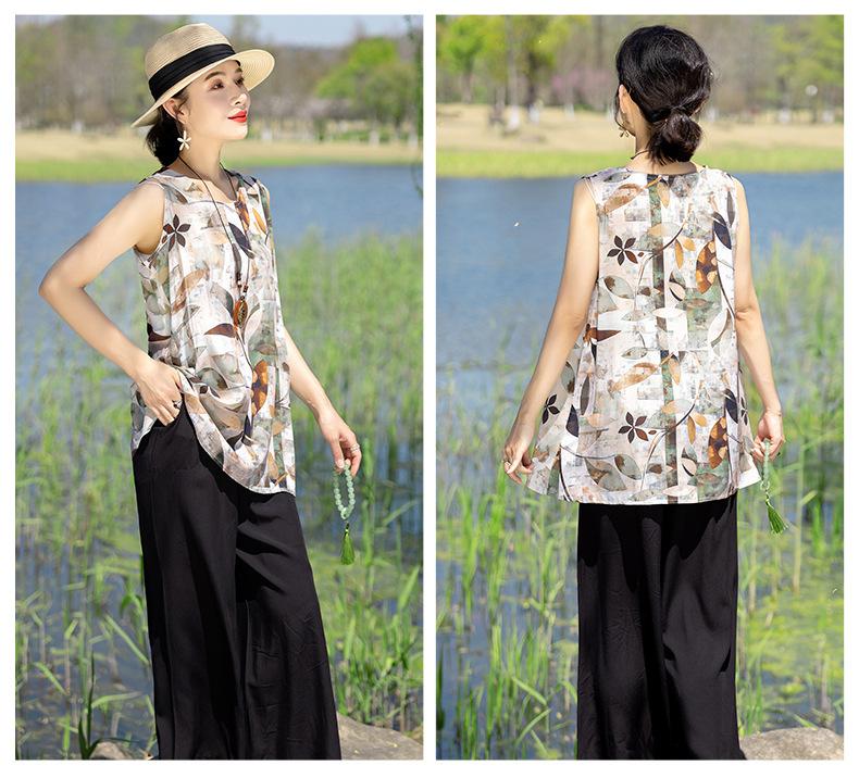 Traje Elegante de Estilo Nacional Floral de Algodón Seda para Mujer, Pijama de Verano para Exterior, Sin Mangas, Pantalones, Ropa de Casa Holgada para Madres de Mediana Edad y Ancianas