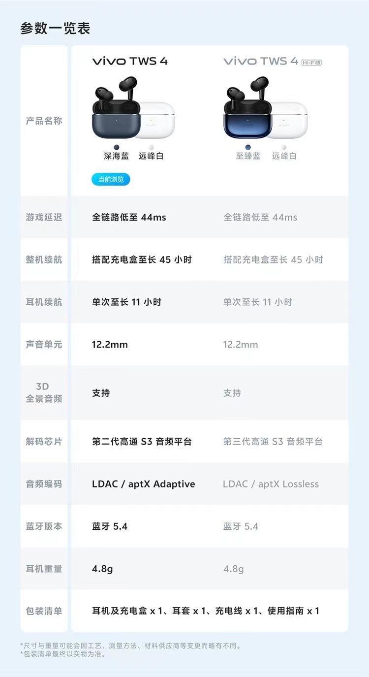 Vivo tws4 standard blue, Vivo tws4 standard white, Vivo tws4 hifi version white, Vivo tws4 hifi version blue
