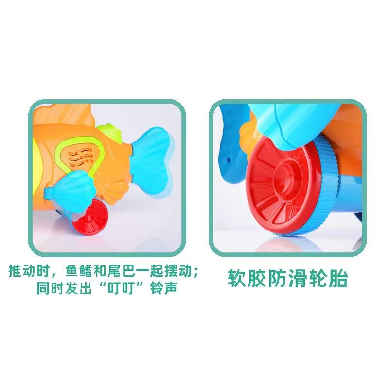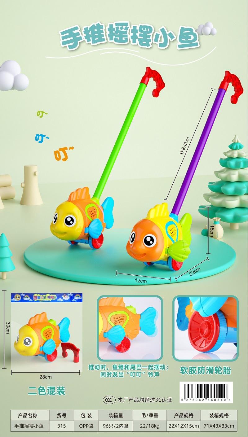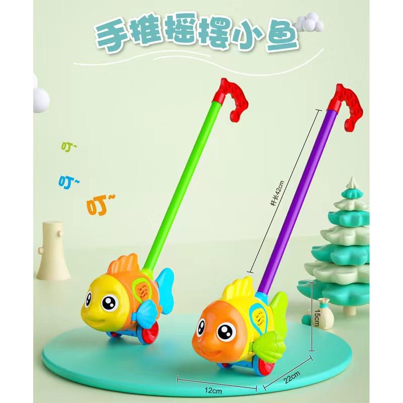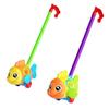 Juguete de plástico para empujar con la mano para bebés y niños pequeños, con forma de pez que se balancea y una sola varilla.