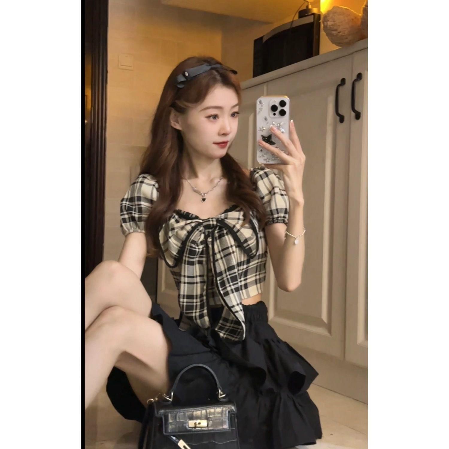 Traje de Mujer 2025 Verano Nuevo Estilo Preppy Lazo Manga Abullonada Top Falda Pomposa de Pastel Conjunto de Dos Piezas