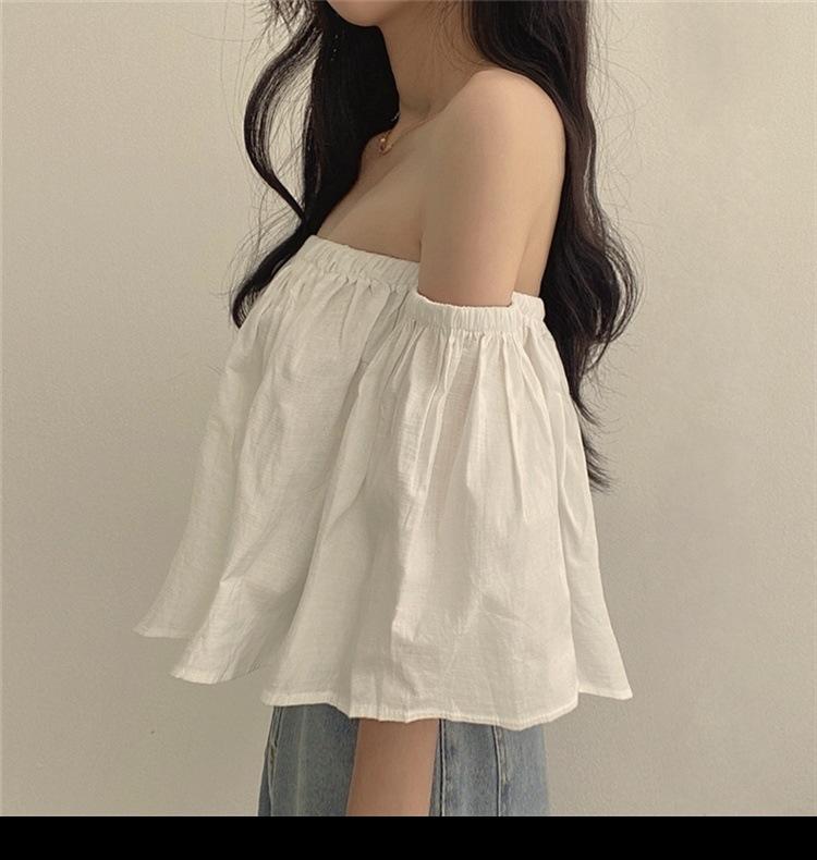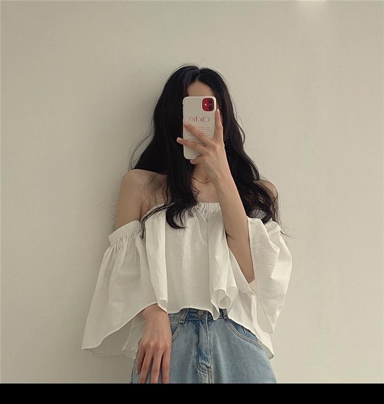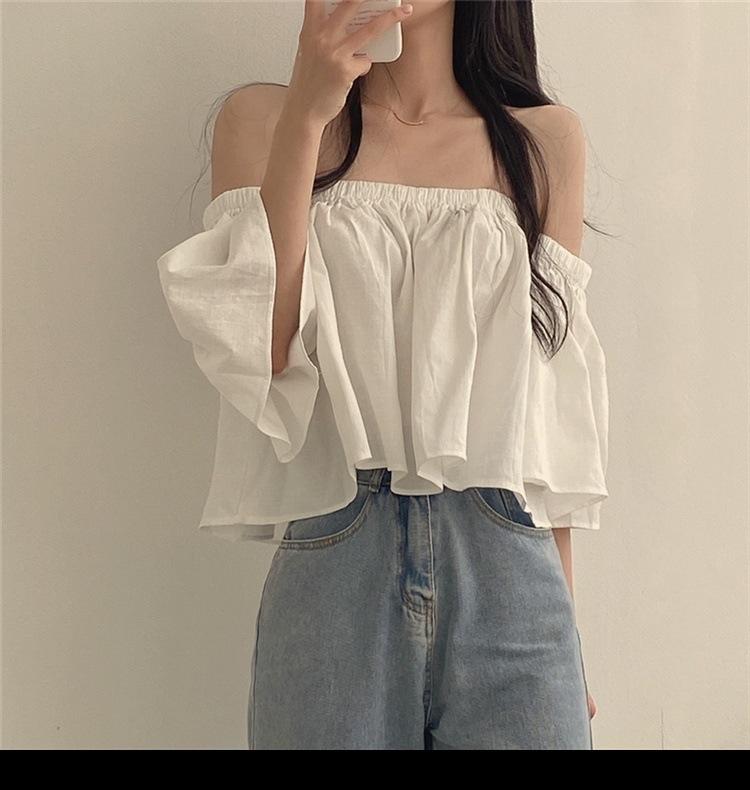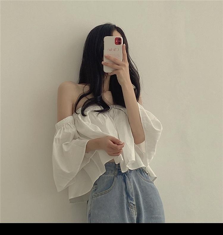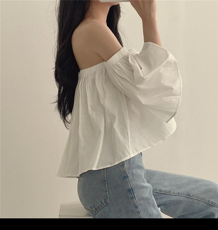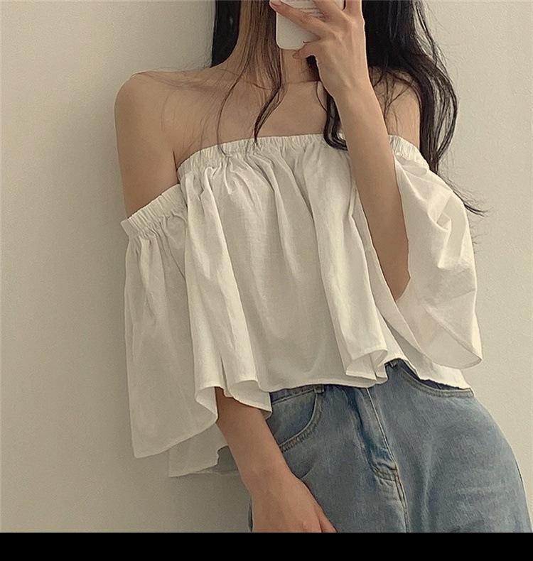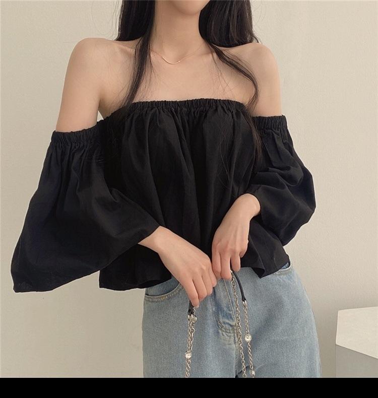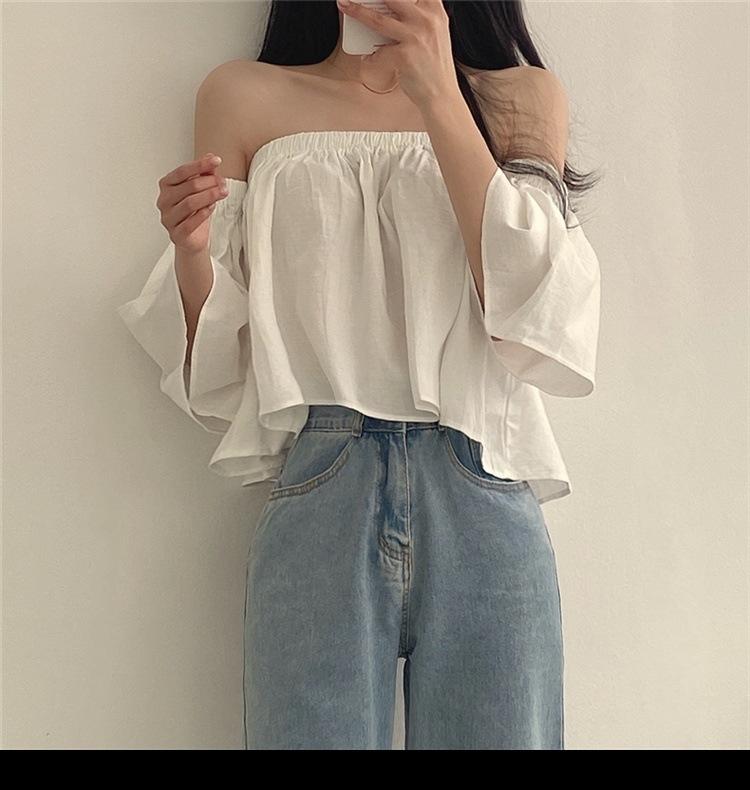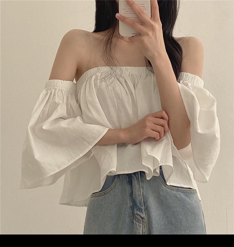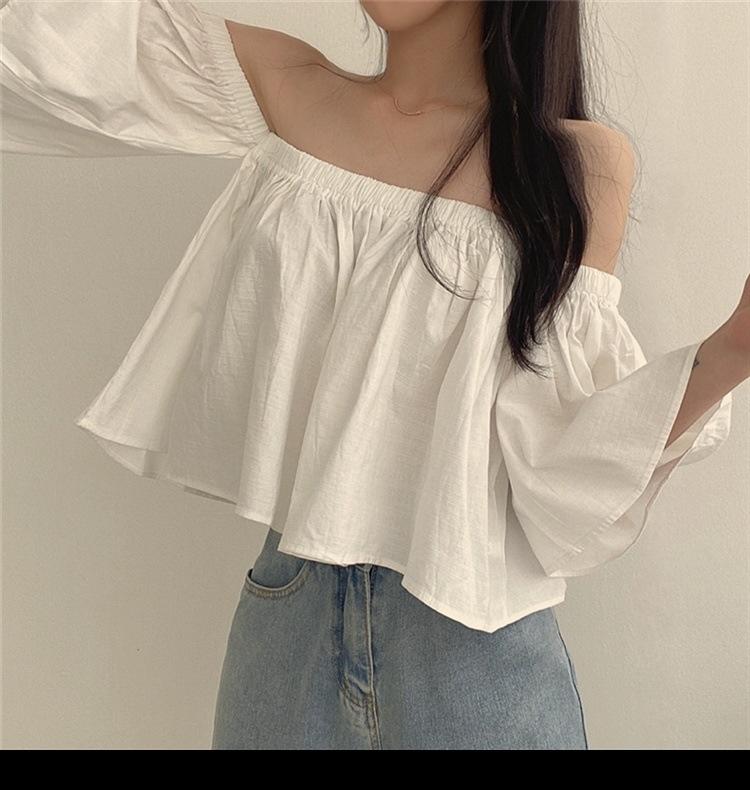 Primavera y Otoño 2025 Nuevo Top de Tubo Bardot de Manga Trompeta Estilo Francés Suave Camisa Corta para Mujer