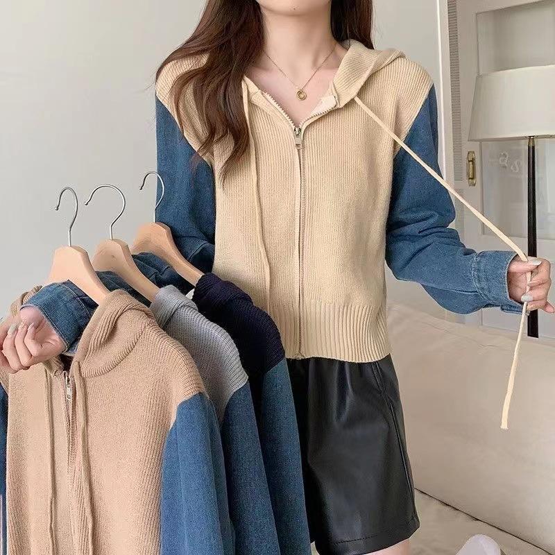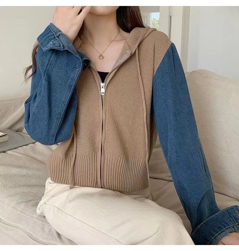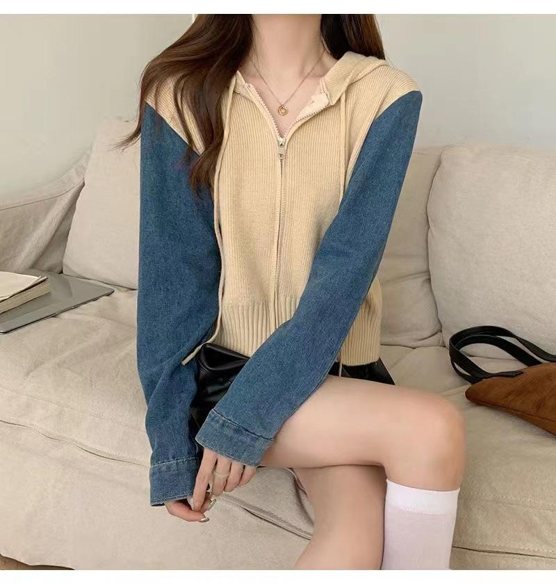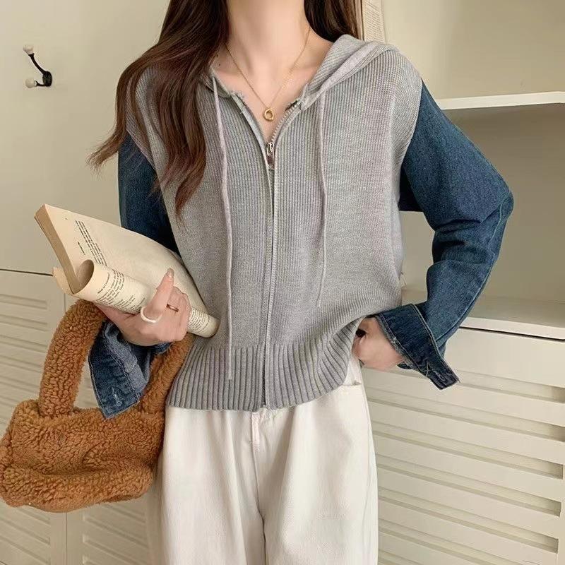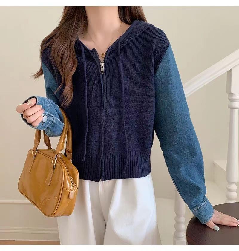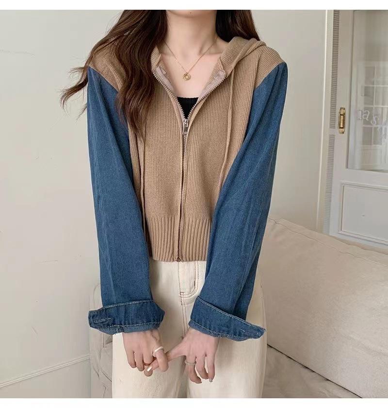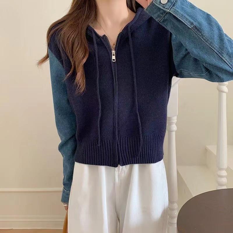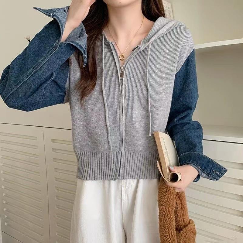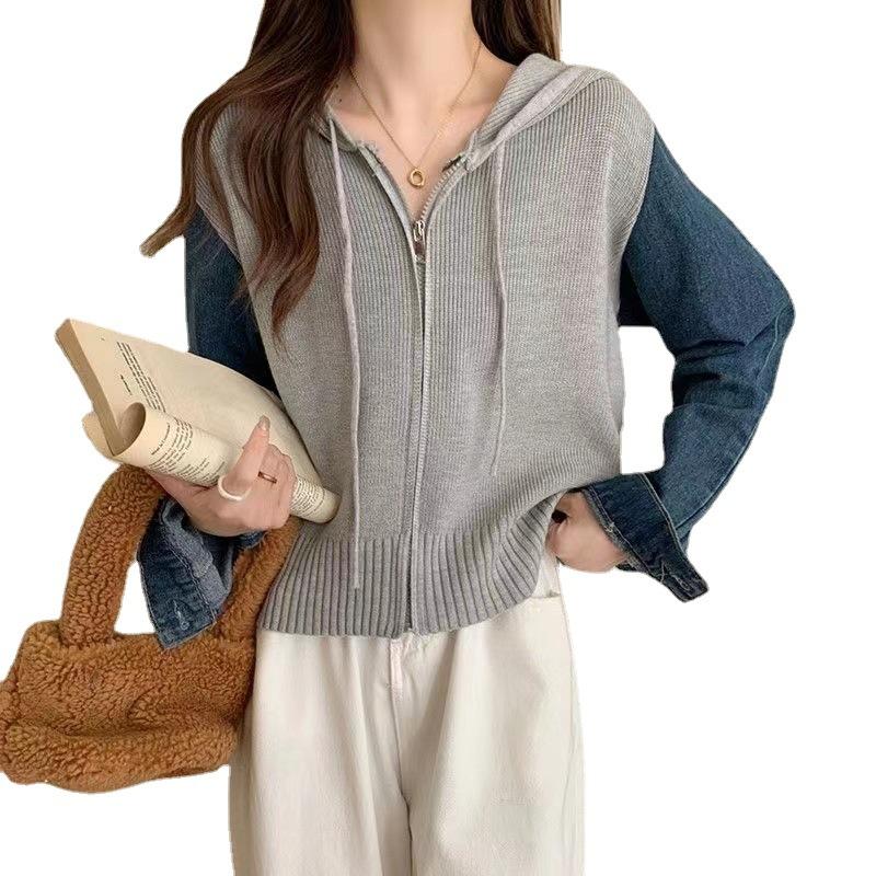 Suéter Cárdigan de Punto con Capucha y Cremallera para Mujer Otoño e Invierno Nuevo Costuras Denim Manga Larga Chaqueta Corta Top para Mujer