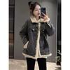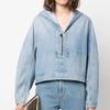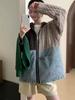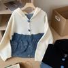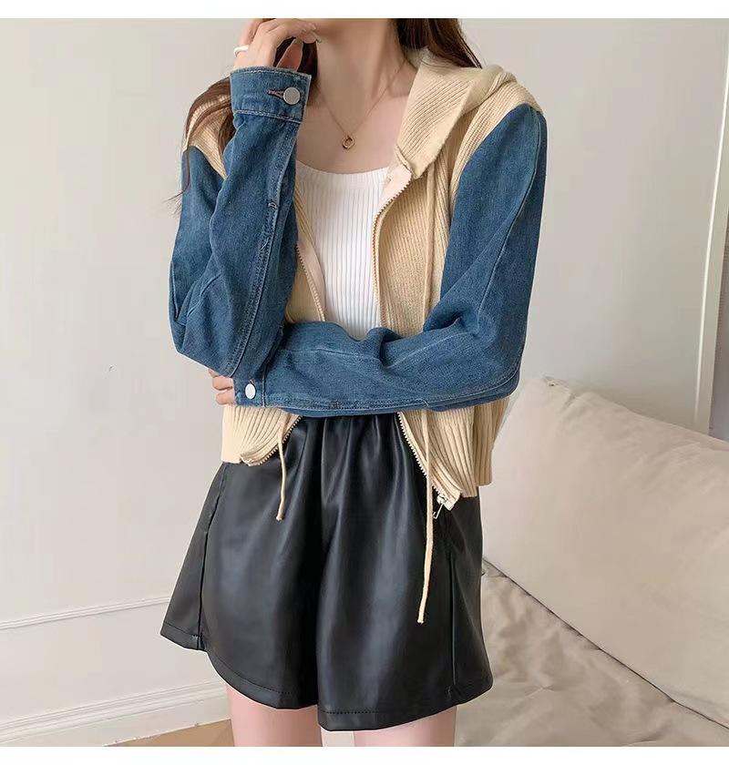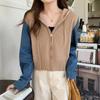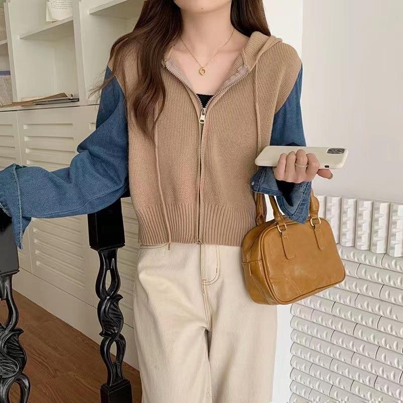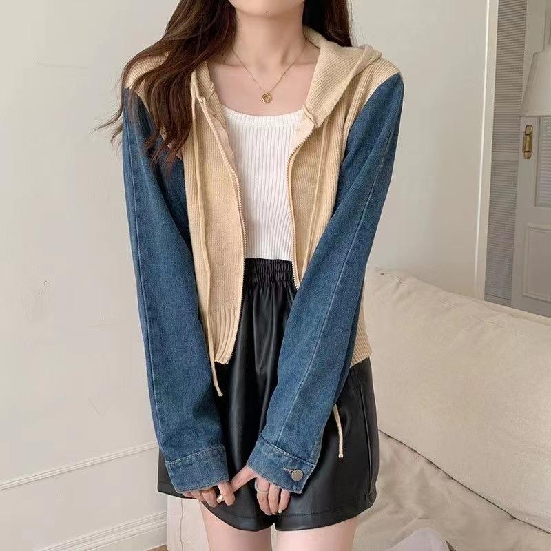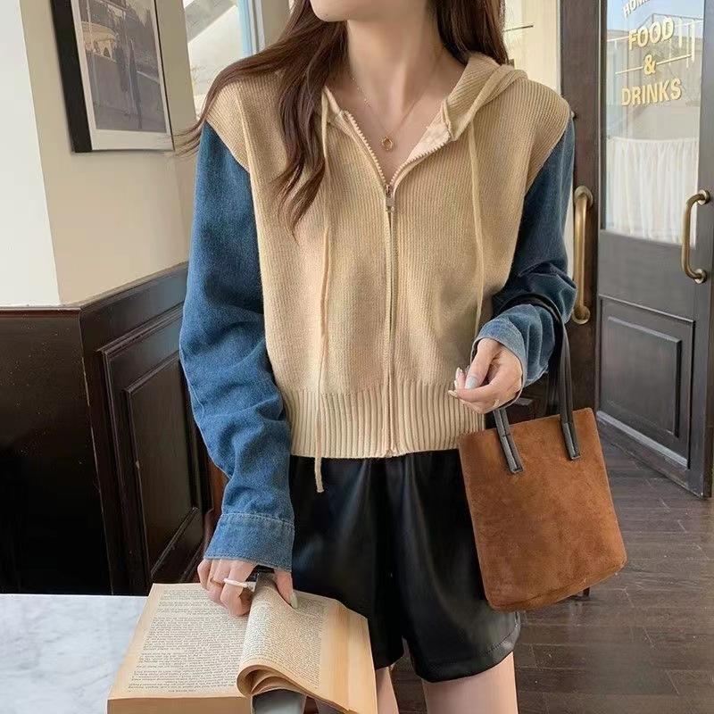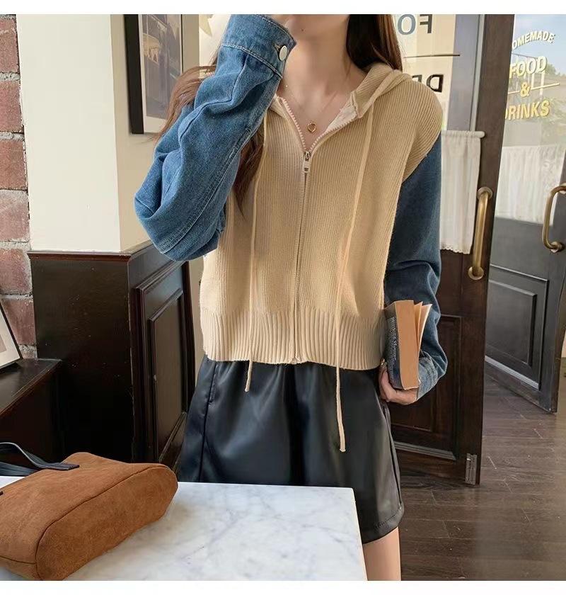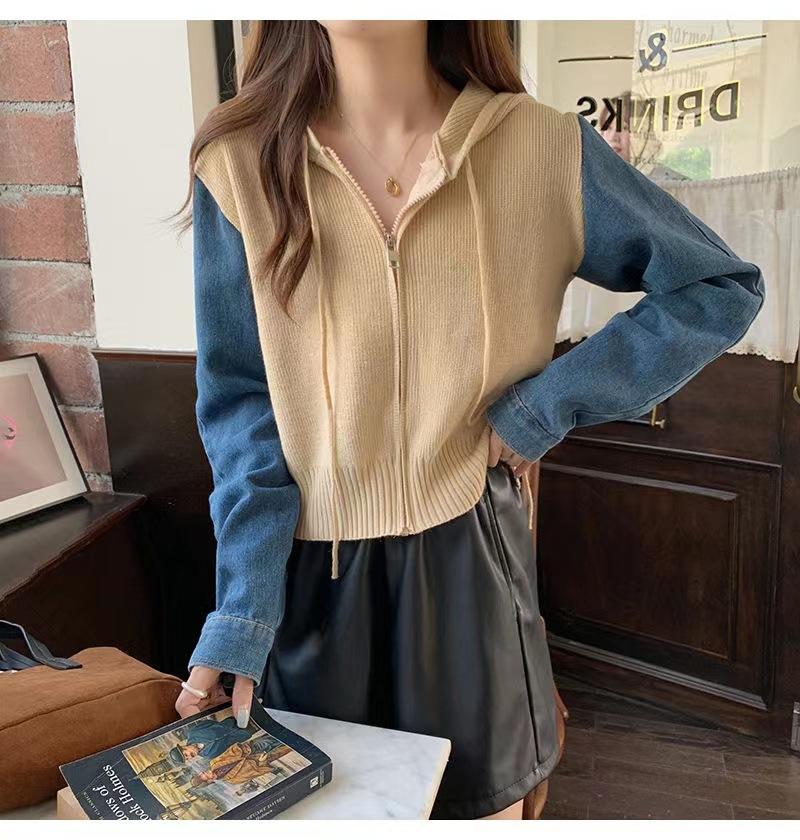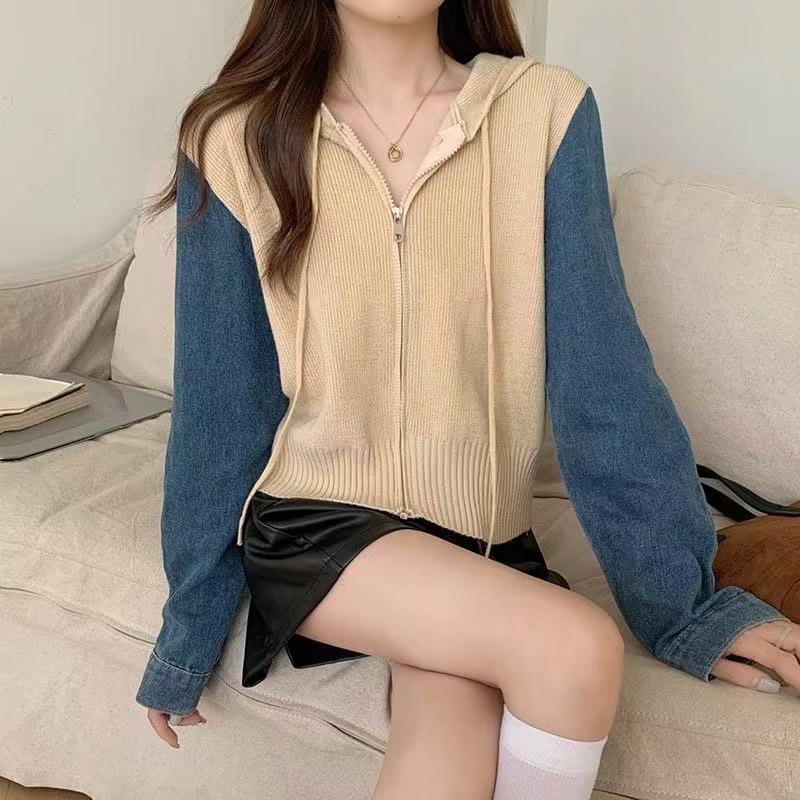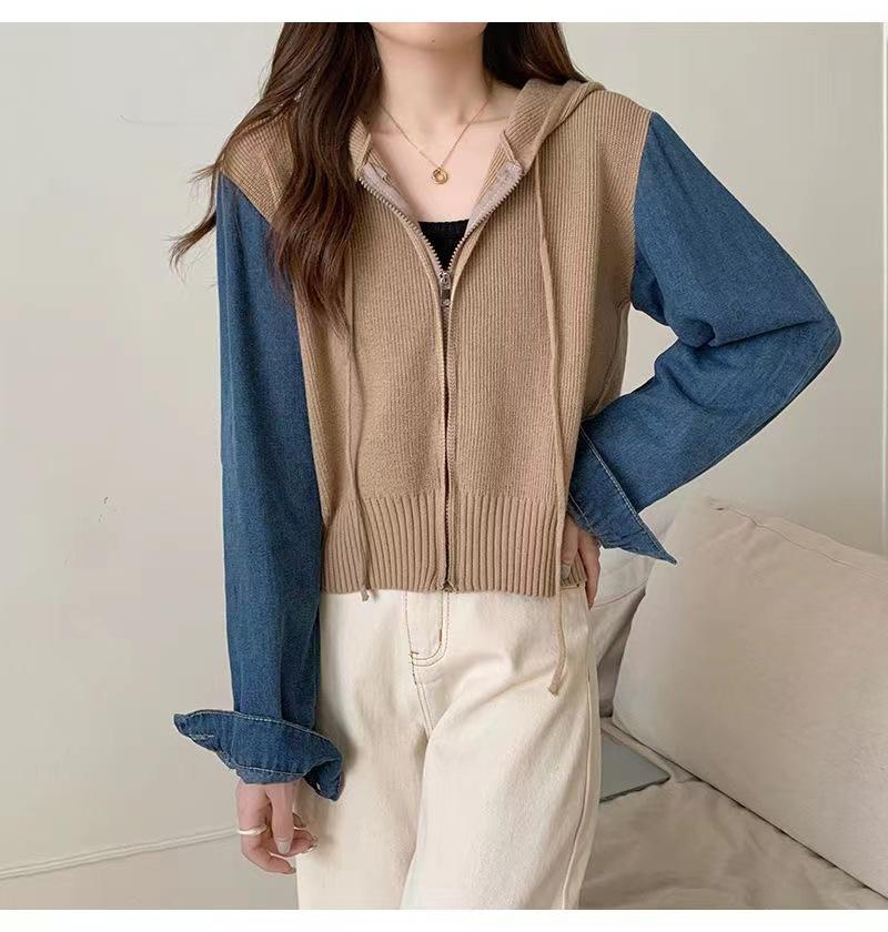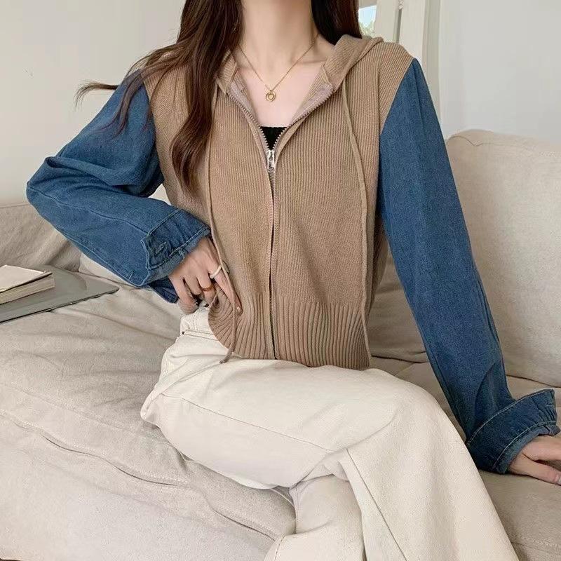 Suéter Cárdigan de Punto con Capucha y Cremallera para Mujer Otoño e Invierno Nuevo Costuras Denim Manga Larga Chaqueta Corta Top para Mujer