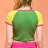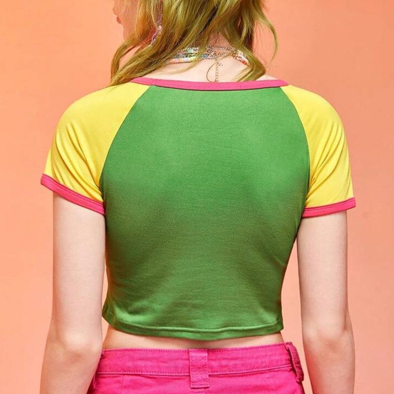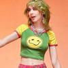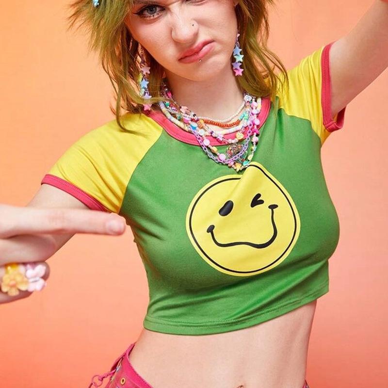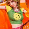AliExpress Nuevo Verano Europeo y Americano Estampado Smiley Contraste de Color Moda Combinable Ombliguera Camiseta de Manga Corta Top Cuello Redondo para Mujer
