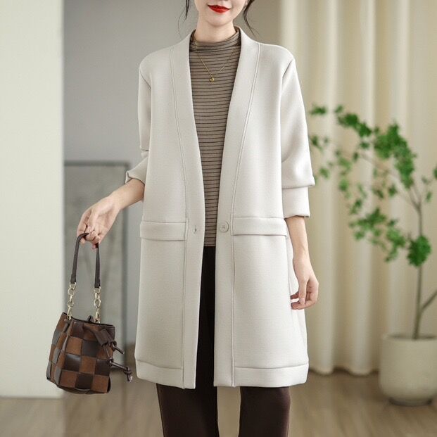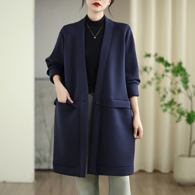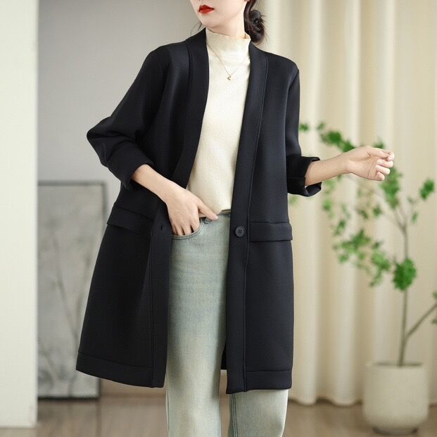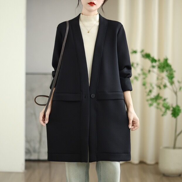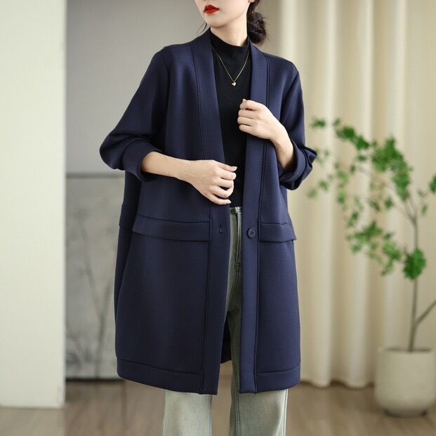 Abrigo Largo de Color Sólido Primavera 2025 Nuevo Artístico Simple Estilo Coreano Cuello en V Un Botón Suelto Casual Abrigo para Mujer