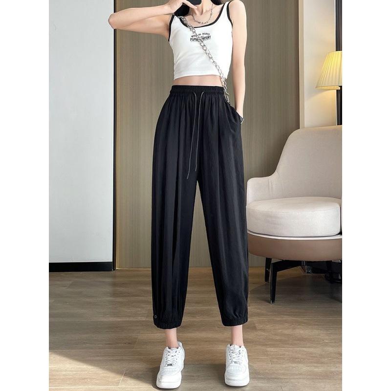 Pantalones deportivos de acetato para mujer, de seda helada, de verano, finos, de cintura alta, holgados, ajustados, estilo harén, informales, con puños de nueve puntos