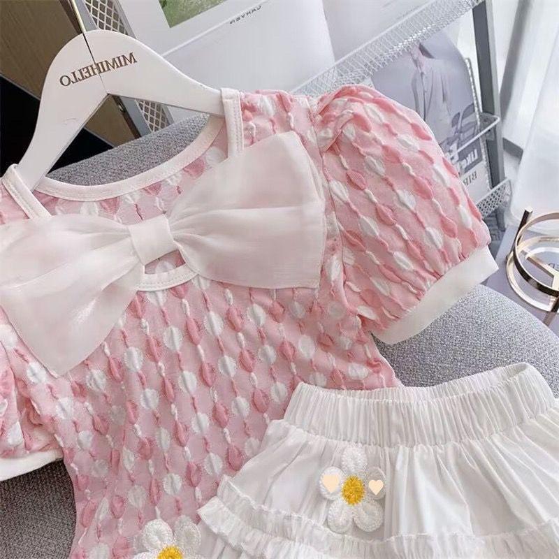 Traje de niña, ropa de verano elegante, camisa de lazo de celebridad de red para niños, falda corta, traje de dos piezas, camiseta de manga corta de moda para niñas