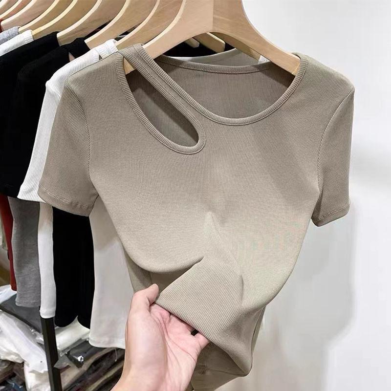 Camiseta de manga corta con cuello oblicuo y artículos europeos de moda para mujer, novedad de verano 2023, diseño de nicho hueco ajustado, tendencia superior versátil