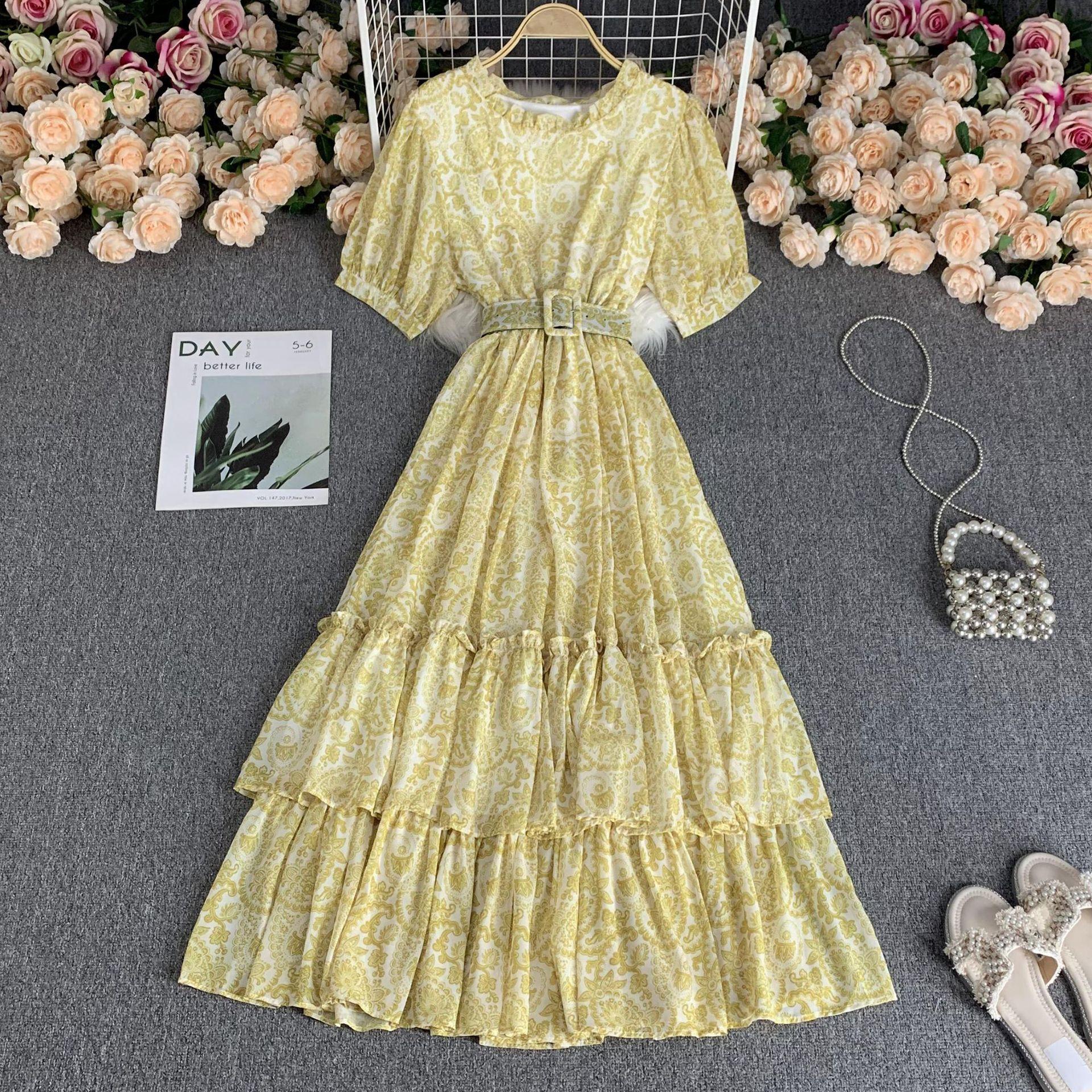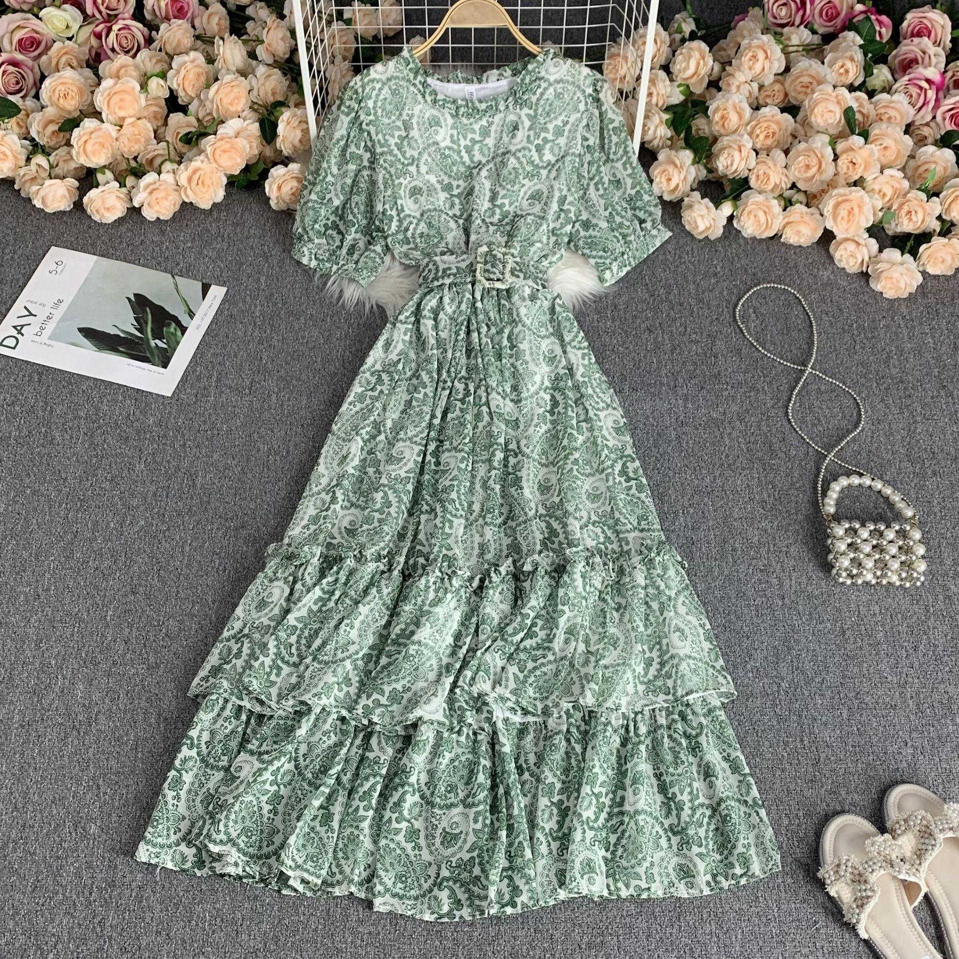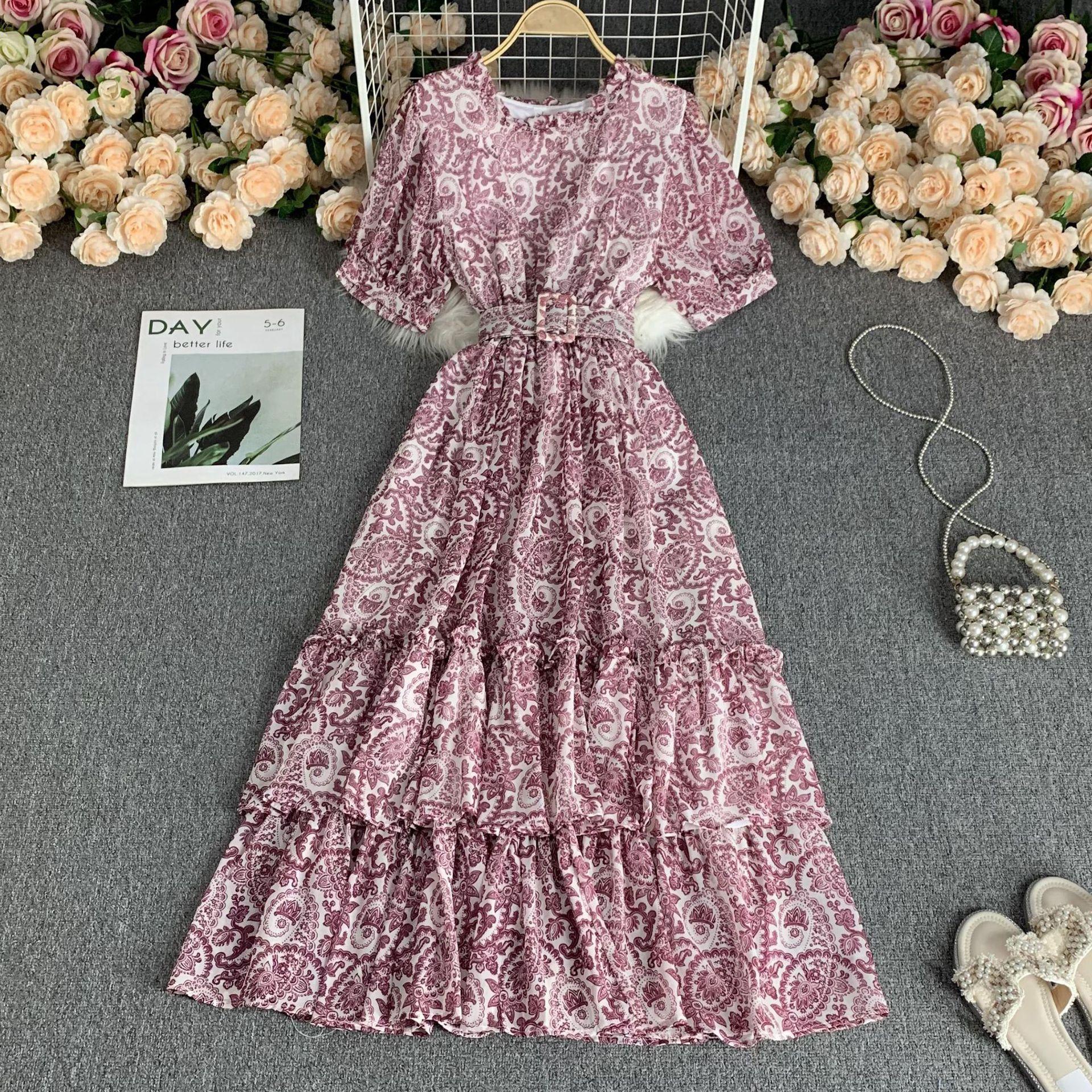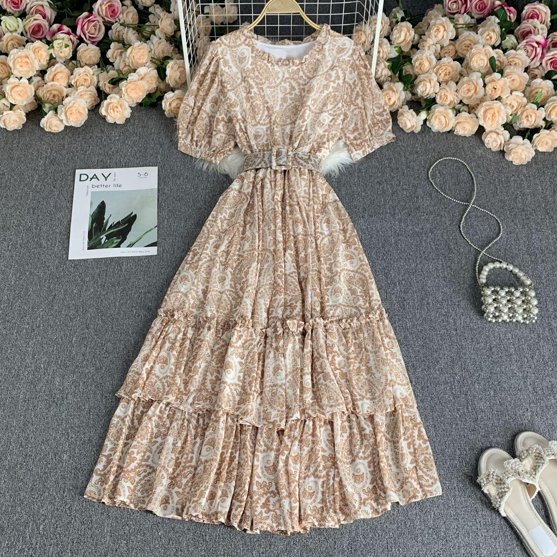 Vestido de Chifón para la Hora del Té Dulce Francés Cuello Redondo Manga Corta Abullonada Estampado para Mujer de Alta Gama Ajustado a la Cintura Adelgazante Tipo Pastel