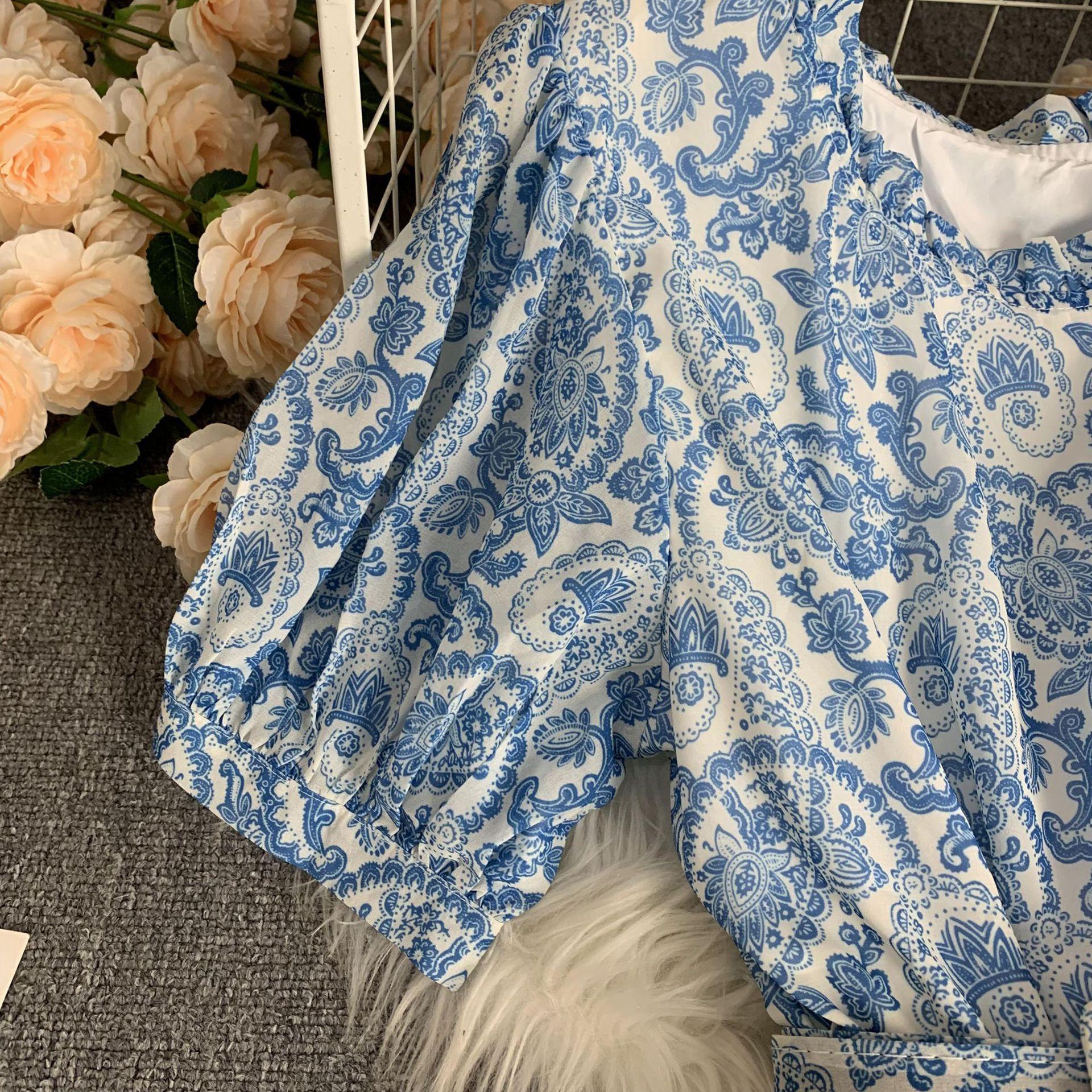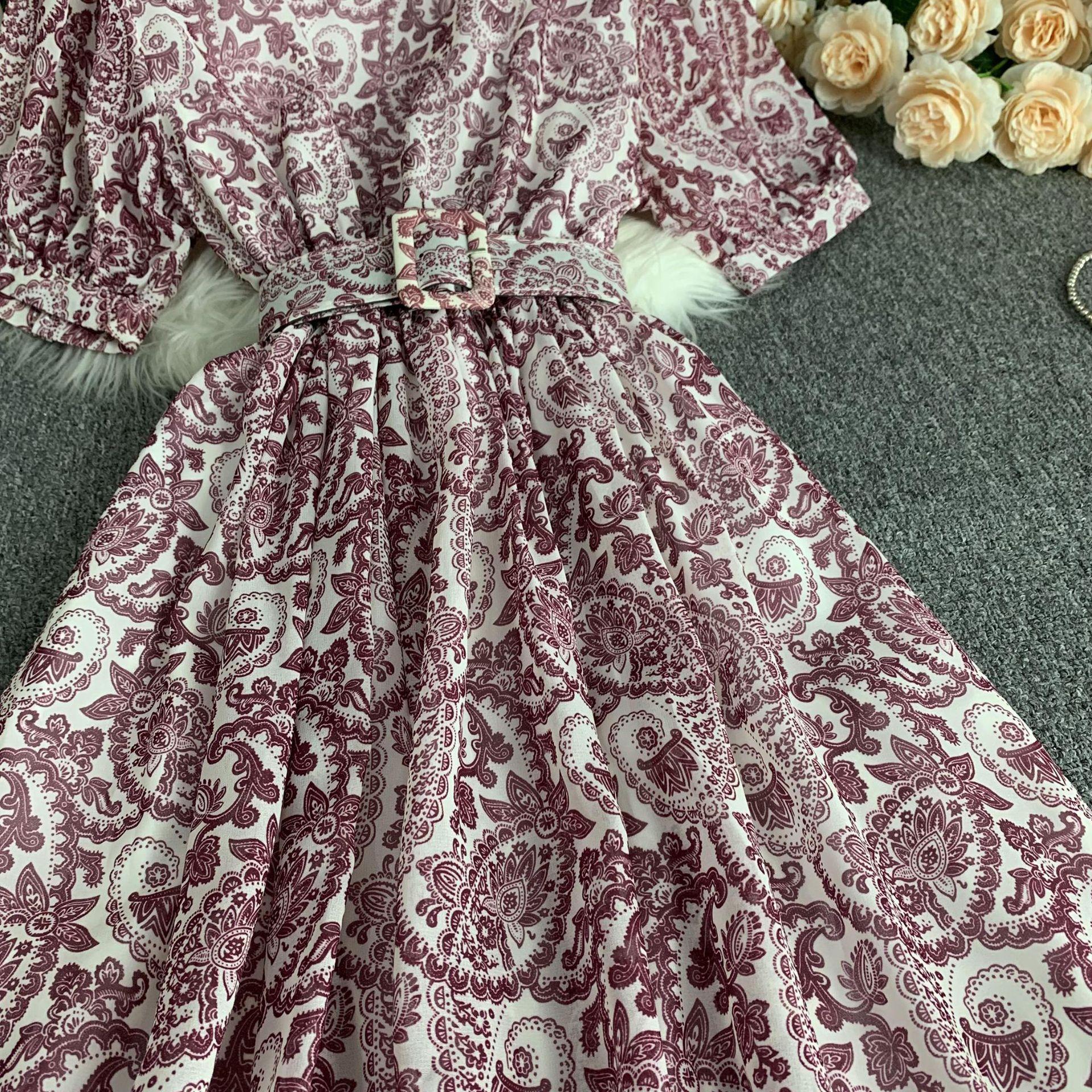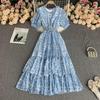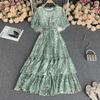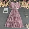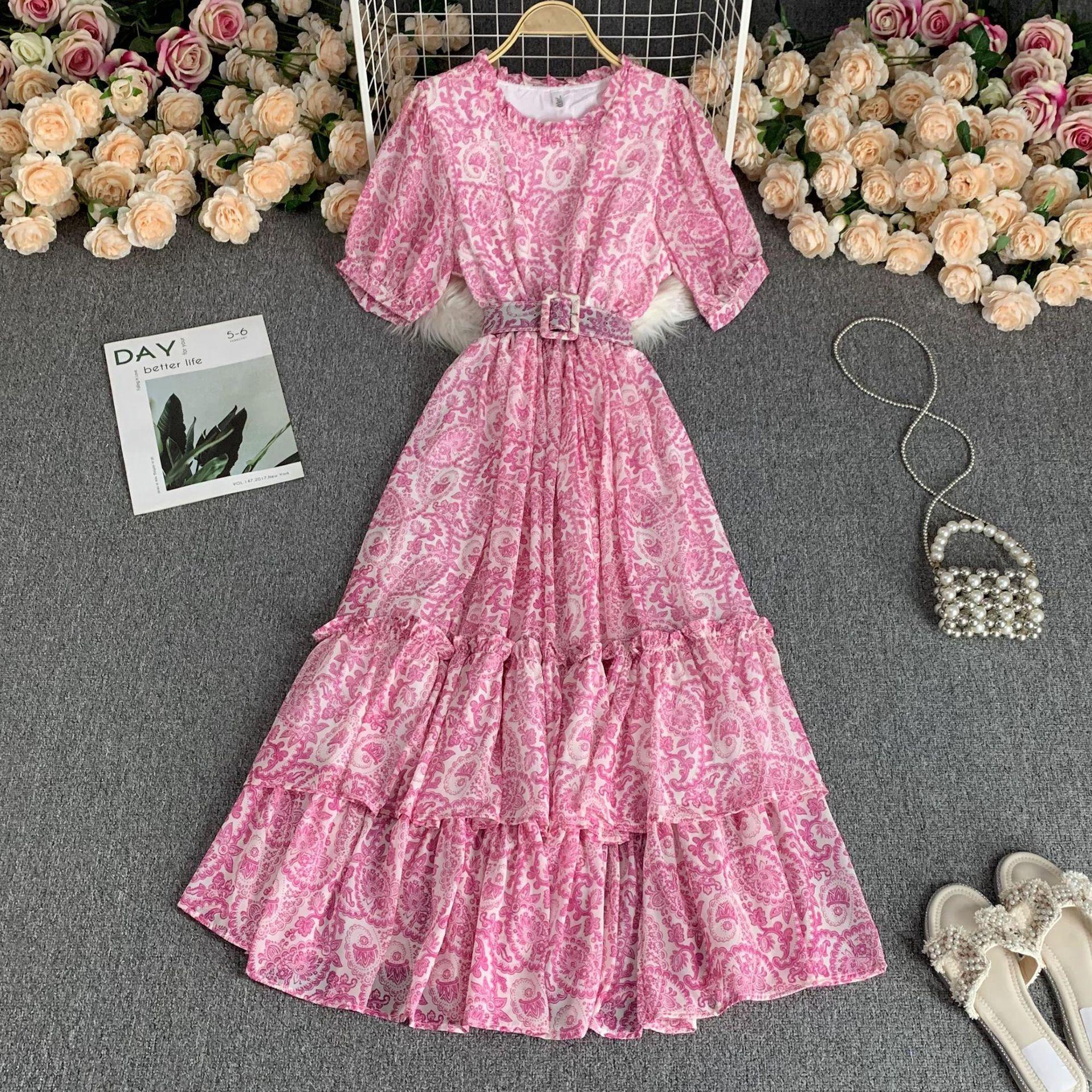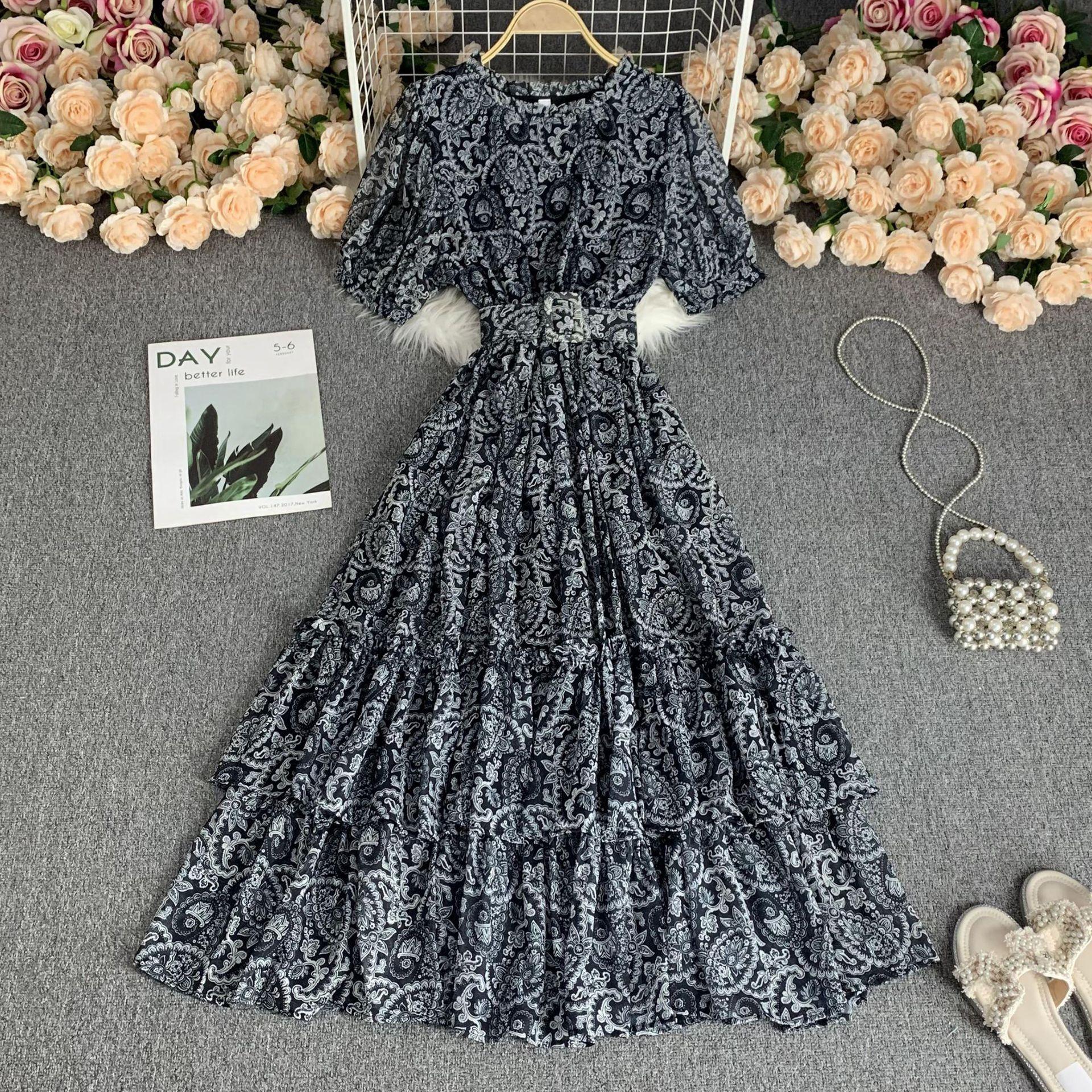 Vestido de Chifón para la Hora del Té Dulce Francés Cuello Redondo Manga Corta Abullonada Estampado para Mujer de Alta Gama Ajustado a la Cintura Adelgazante Tipo Pastel