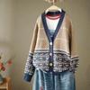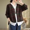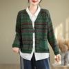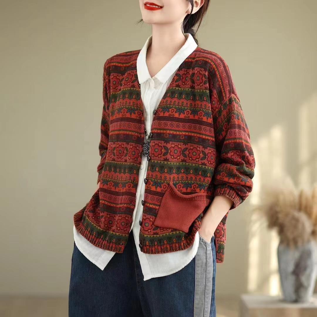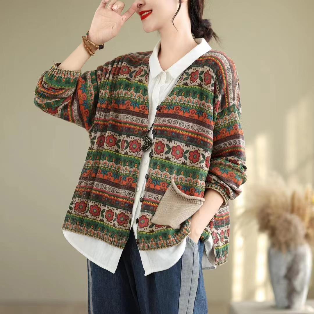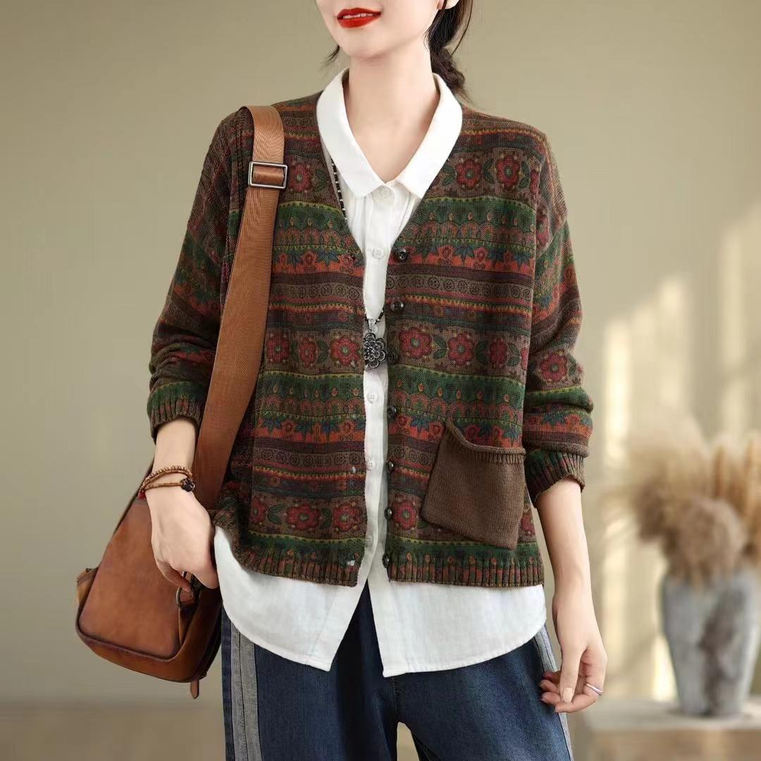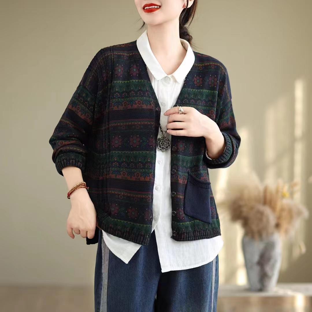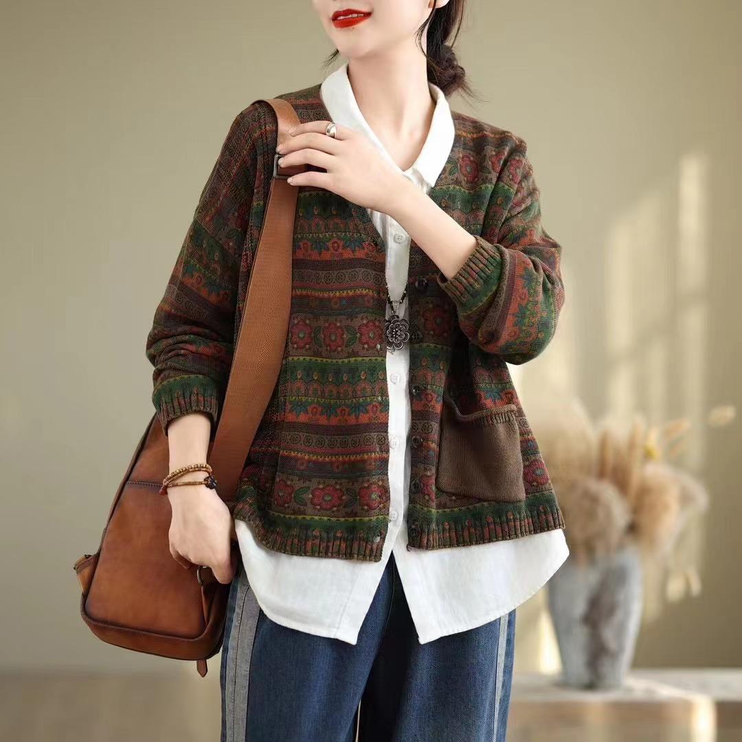 Cárdigan de Punto de Algodón con Estampado Floral Nuevo de Otoño para Mujer, Artístico, Retro, Cuello en V, Adelgazante, Manga Larga, Chaqueta Suéter