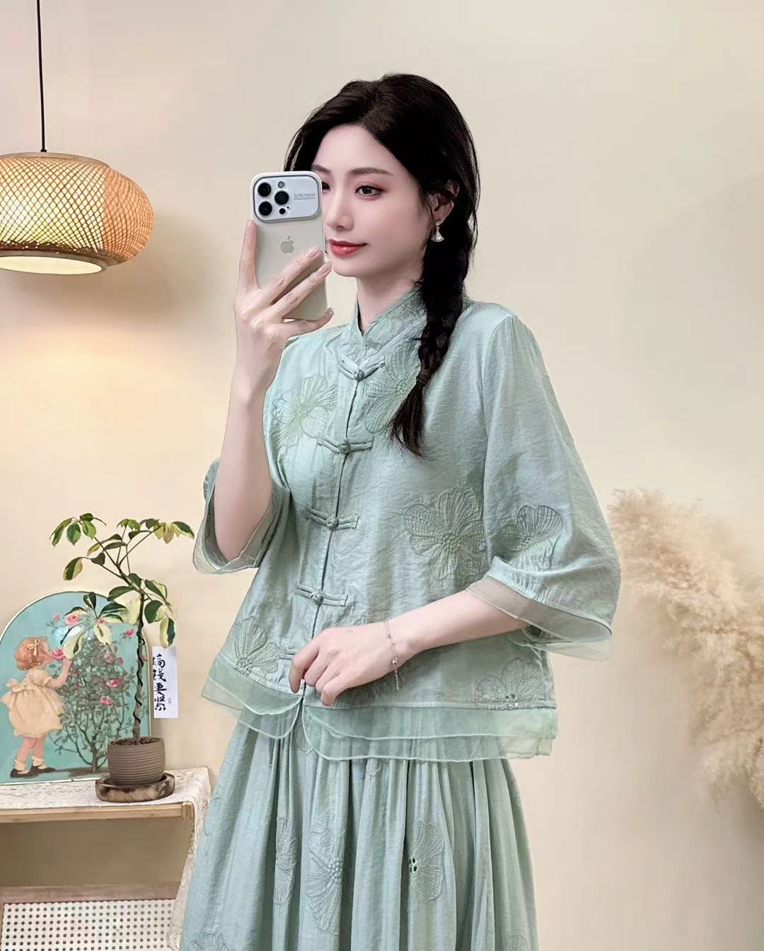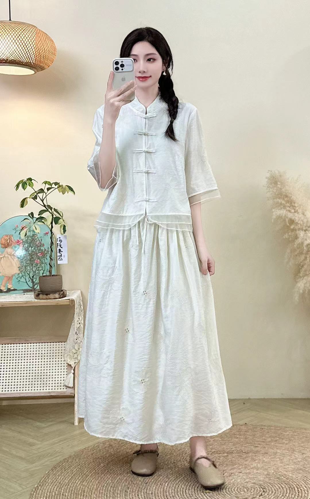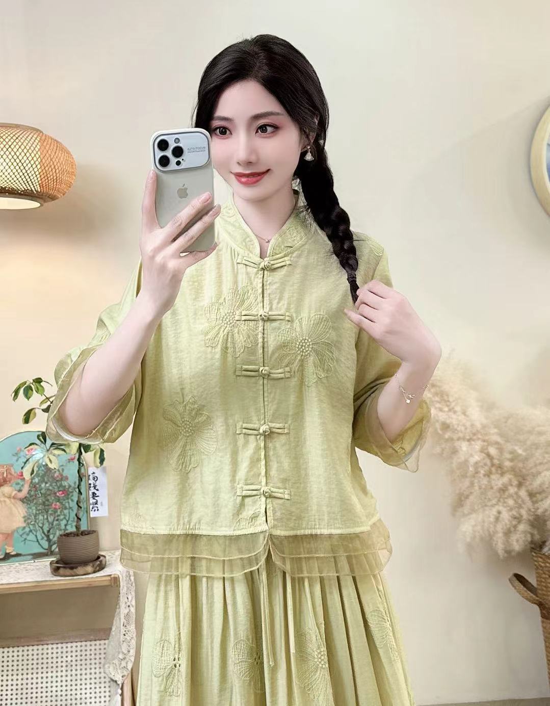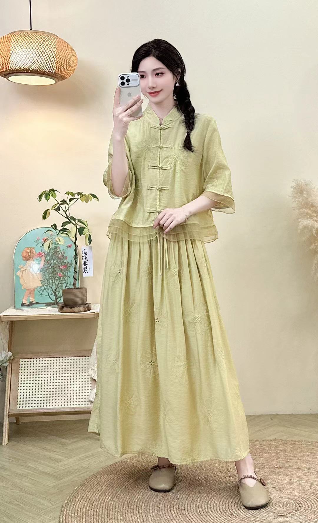 Nuevo traje de estilo chino para mujer Verano 2025 Nueva llegada Cárdigan de manga corta con hebilla Falda elegante a la cintura Conjunto de dos piezas de lino de seda