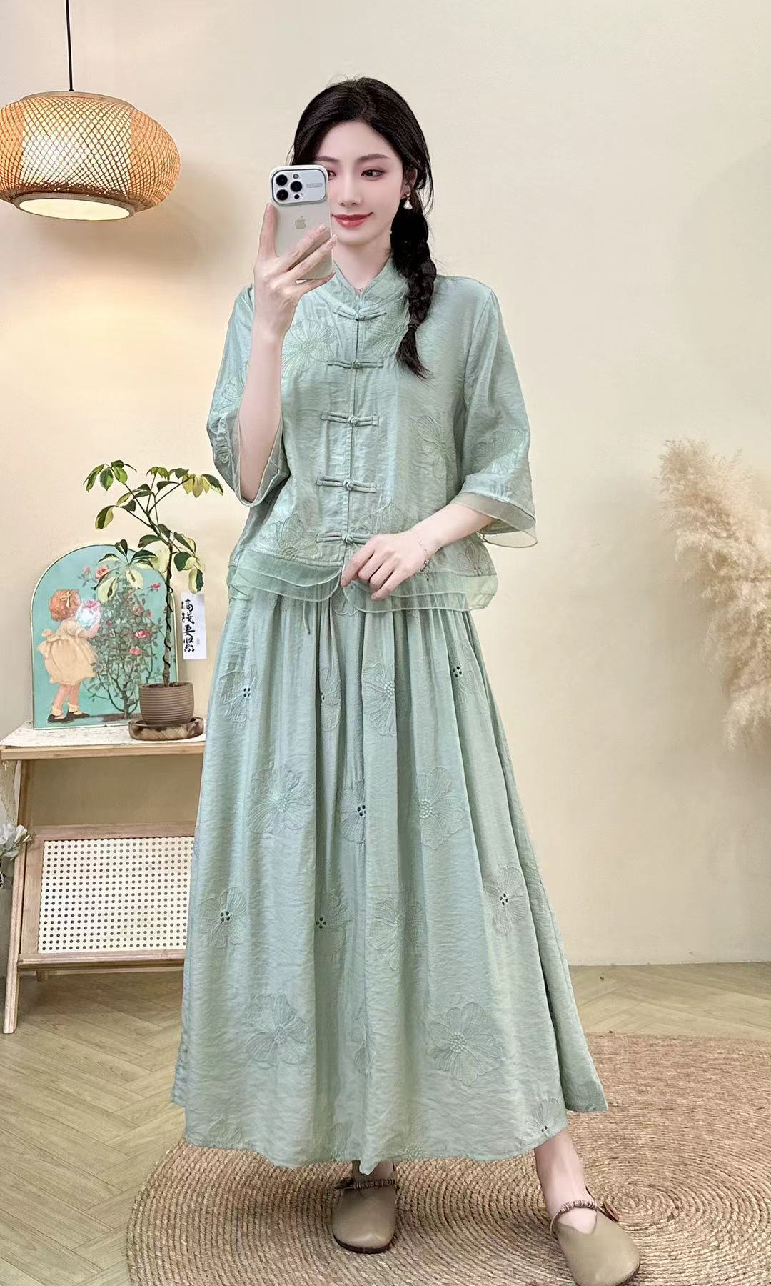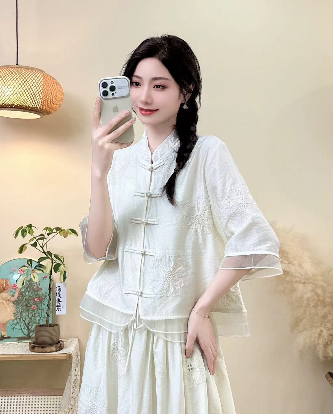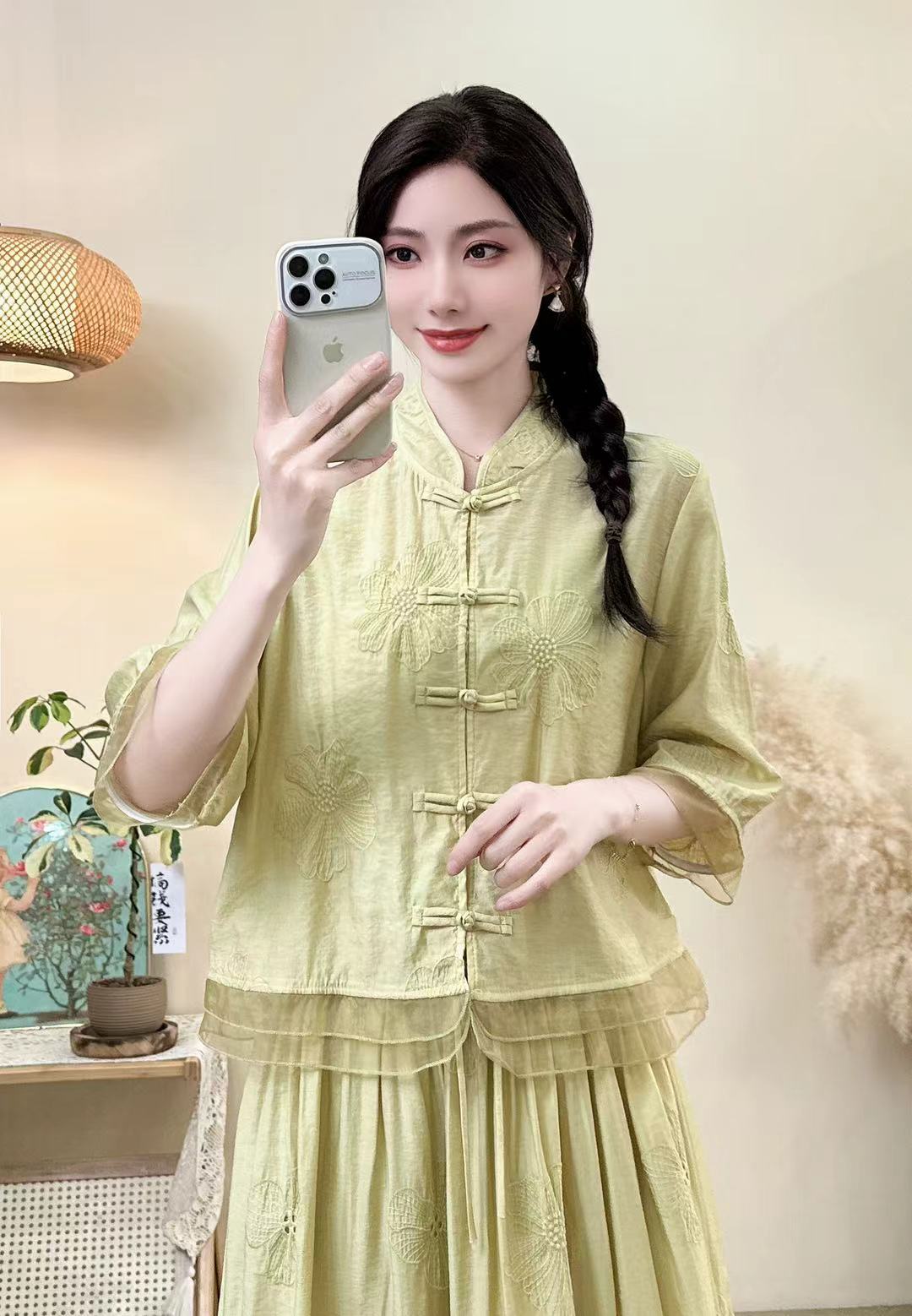 Nuevo traje de estilo chino para mujer Verano 2025 Nueva llegada Cárdigan de manga corta con hebilla Falda elegante a la cintura Conjunto de dos piezas de lino de seda