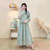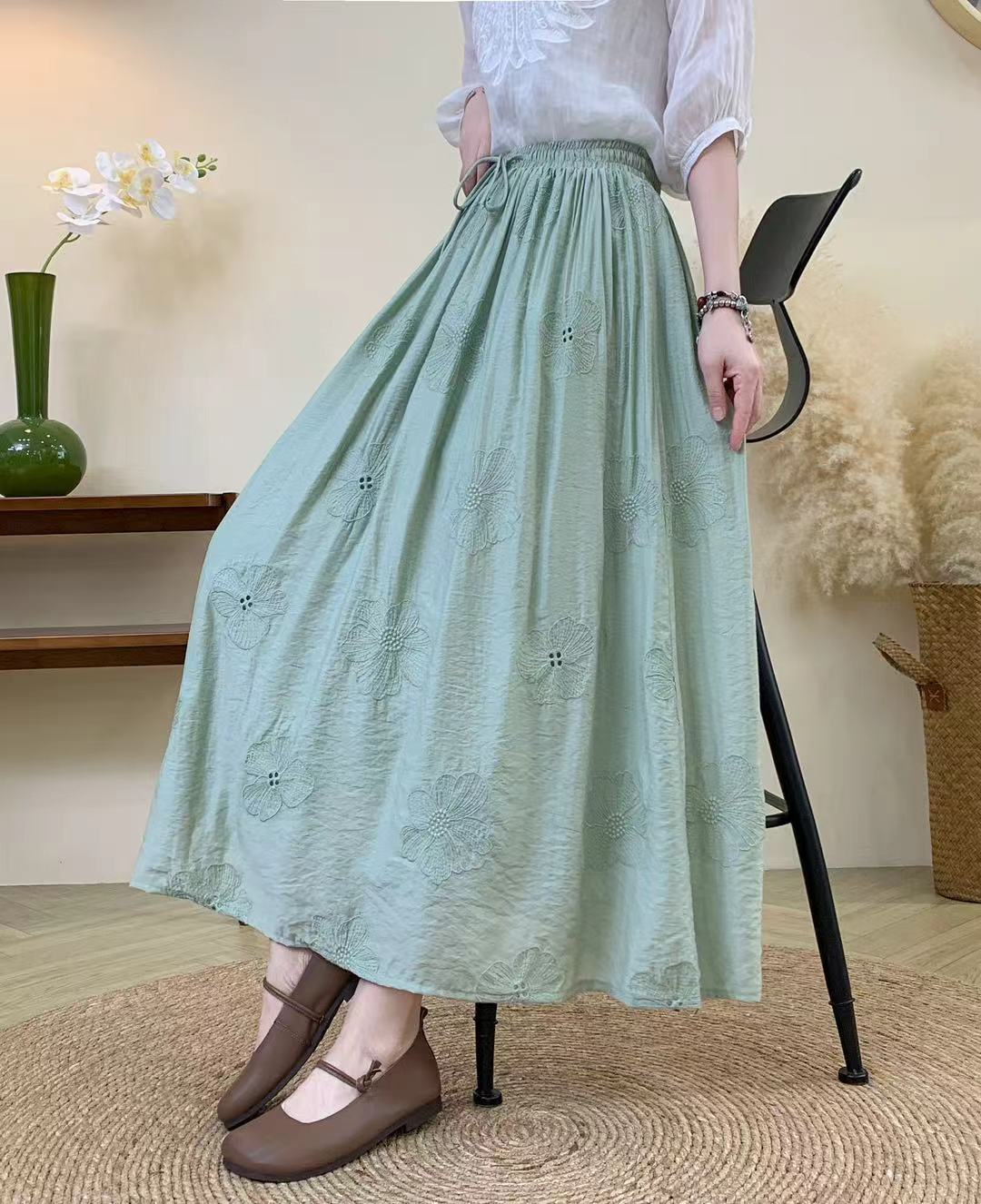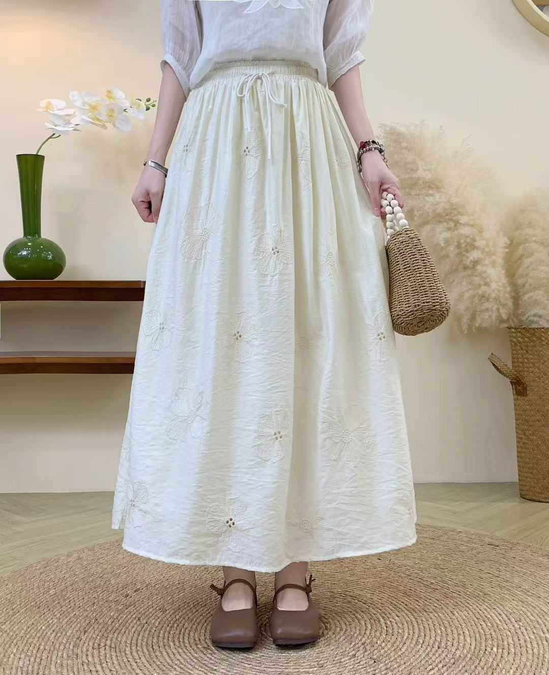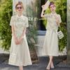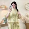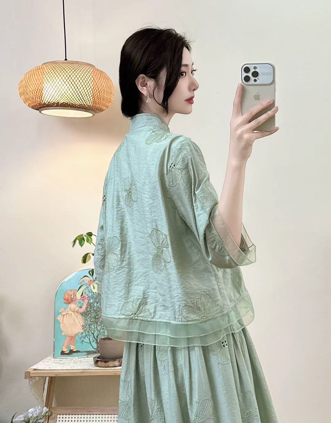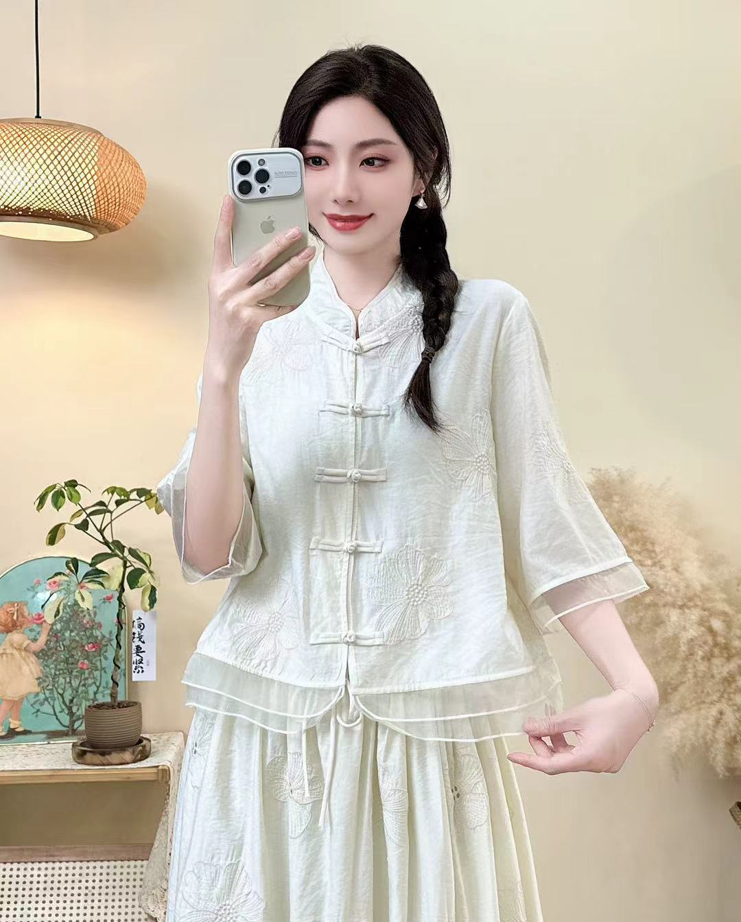 Nuevo traje de estilo chino para mujer Verano 2025 Nueva llegada Cárdigan de manga corta con hebilla Falda elegante a la cintura Conjunto de dos piezas de lino de seda