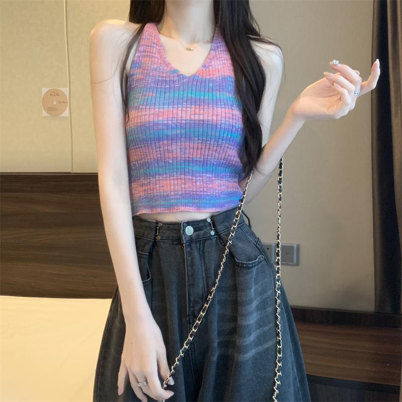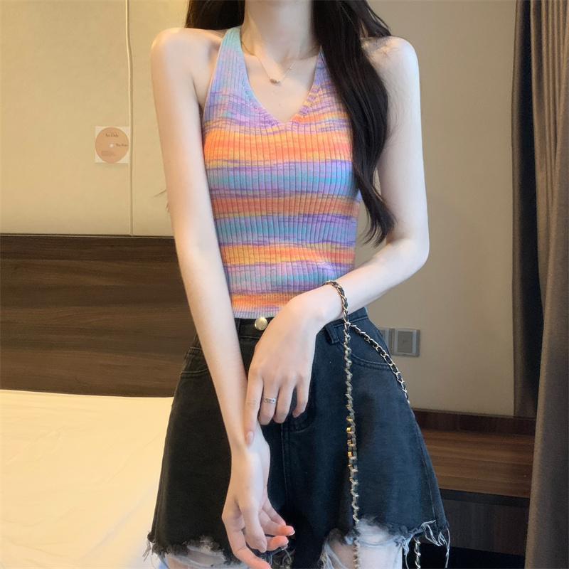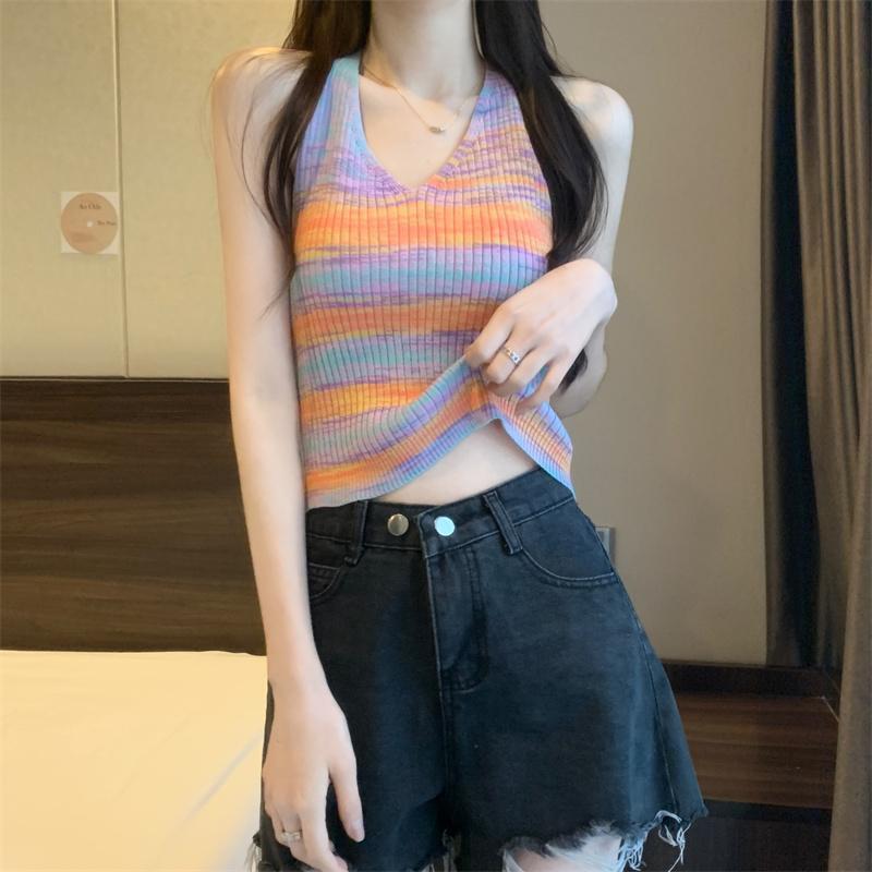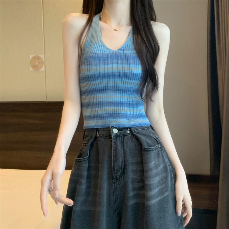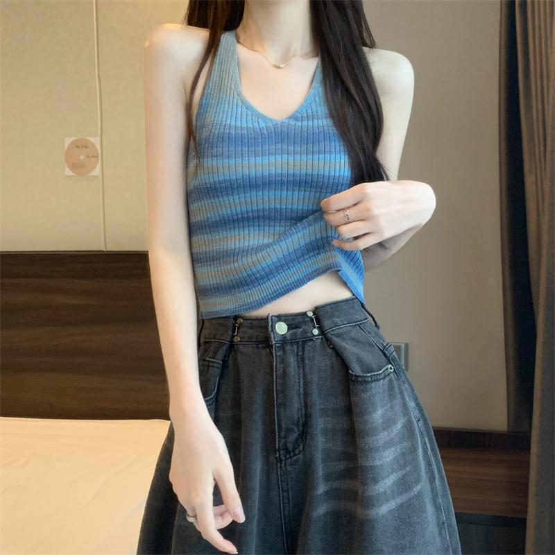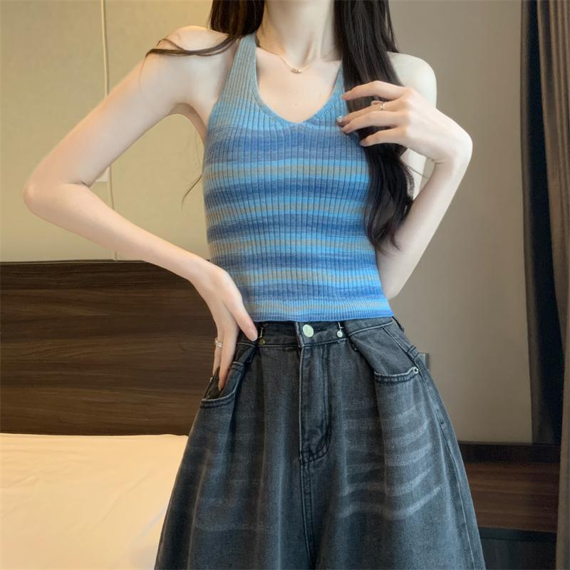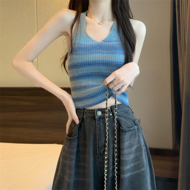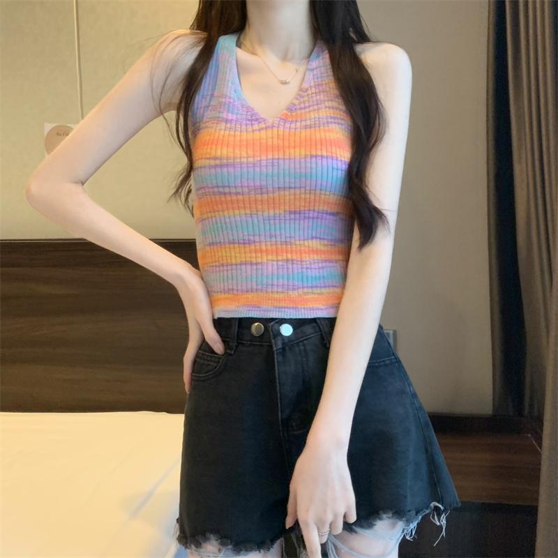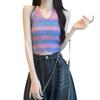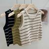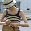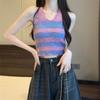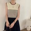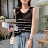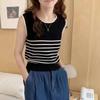Chaleco de punto de seda helada a rayas de color francés para mujer, prenda exterior fina de verano, cuello en V, informal, combinable, sin mangas