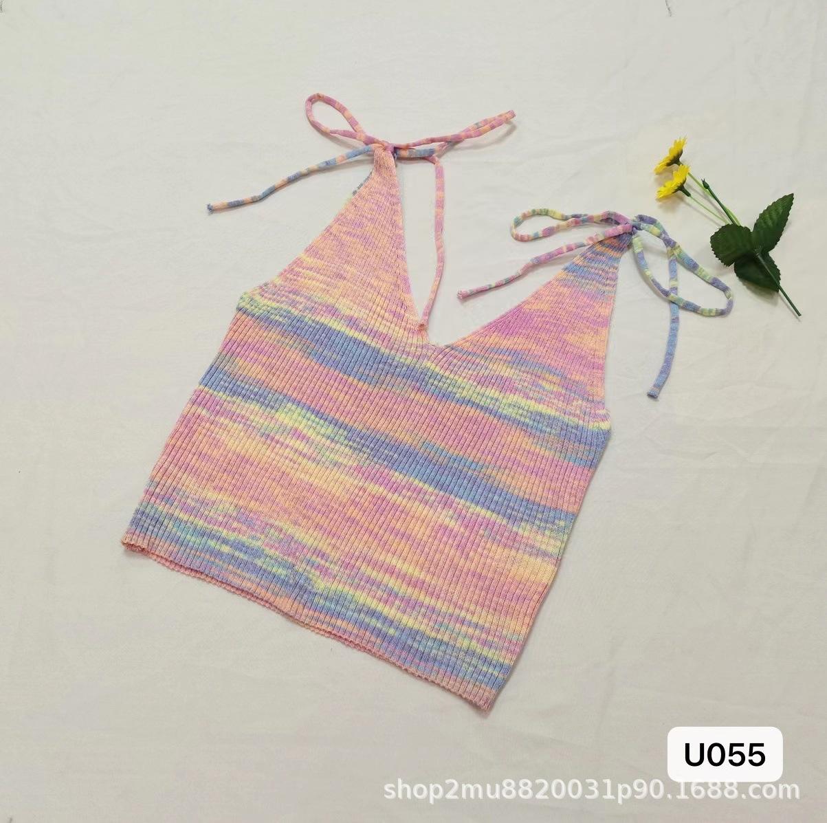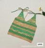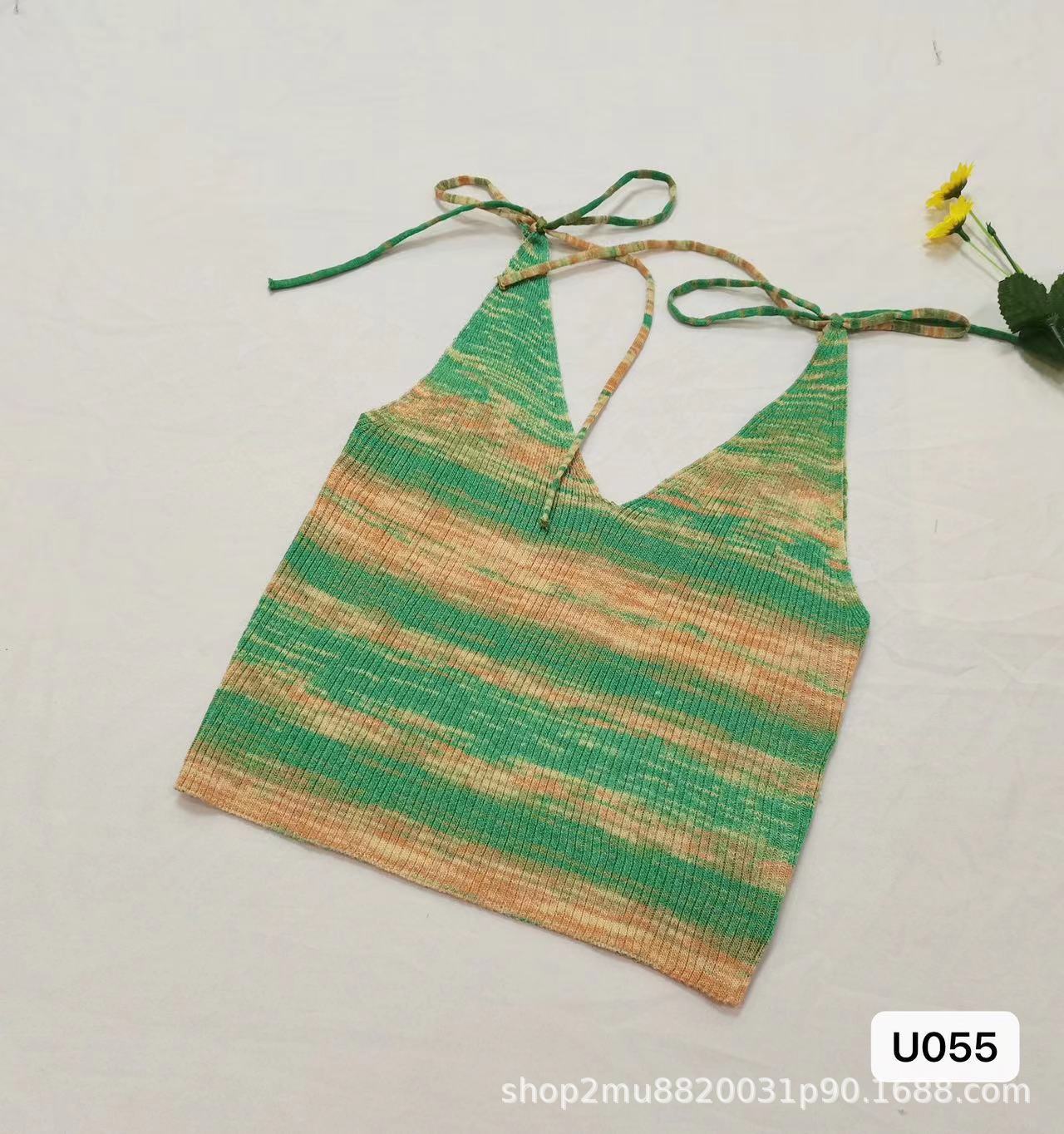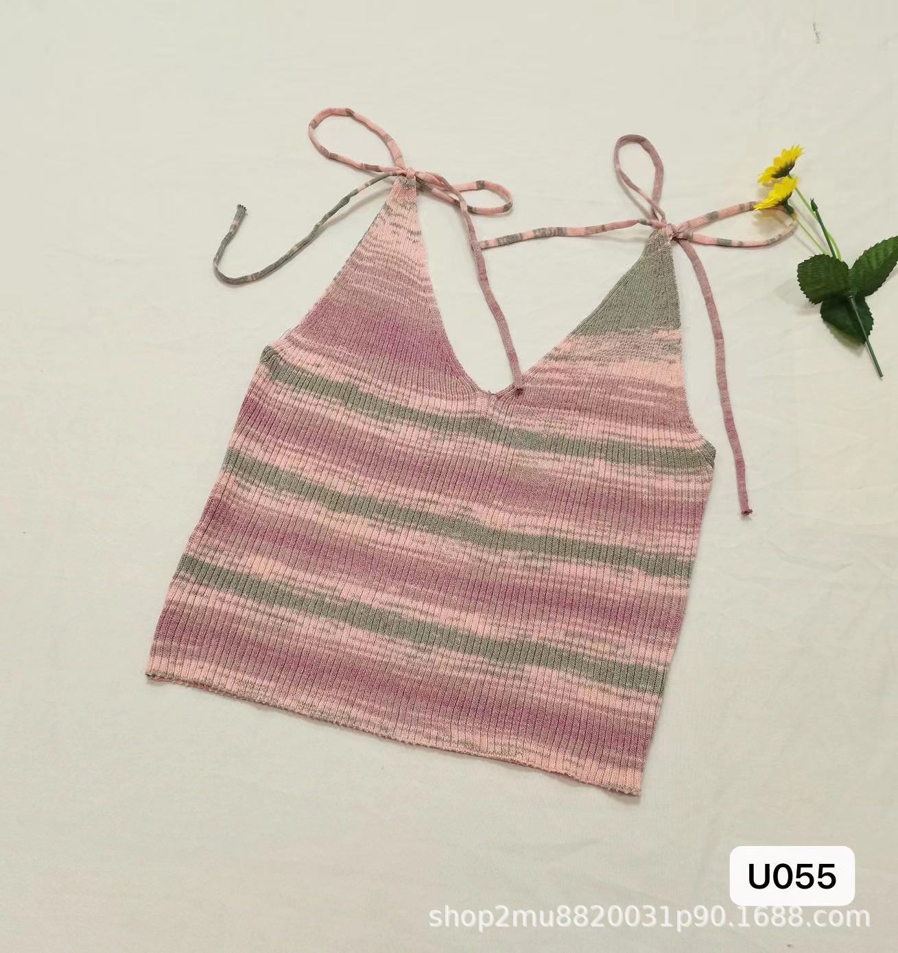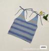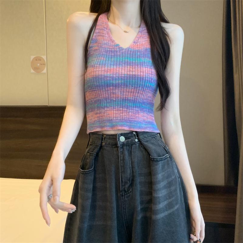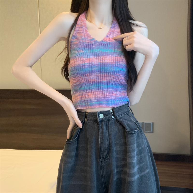Chaleco de punto de seda helada a rayas de color francés para mujer, prenda exterior fina de verano, cuello en V, informal, combinable, sin mangas