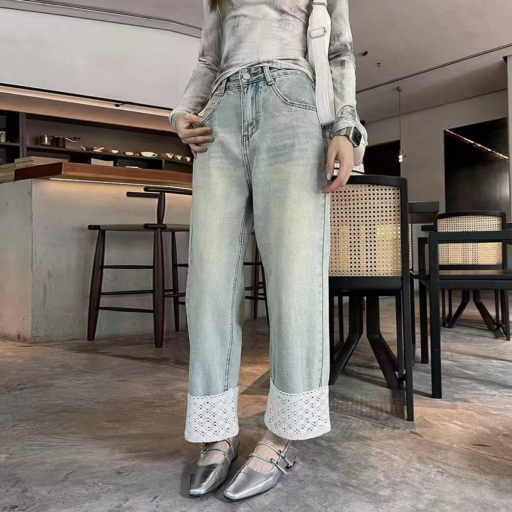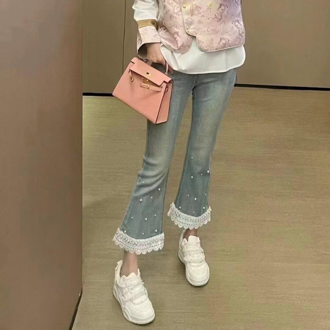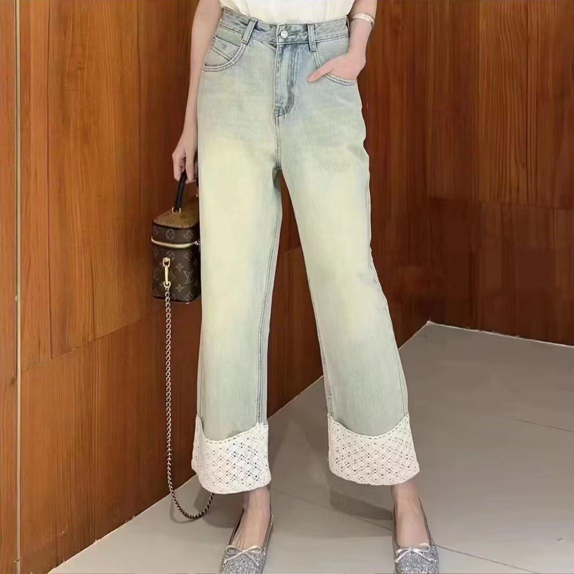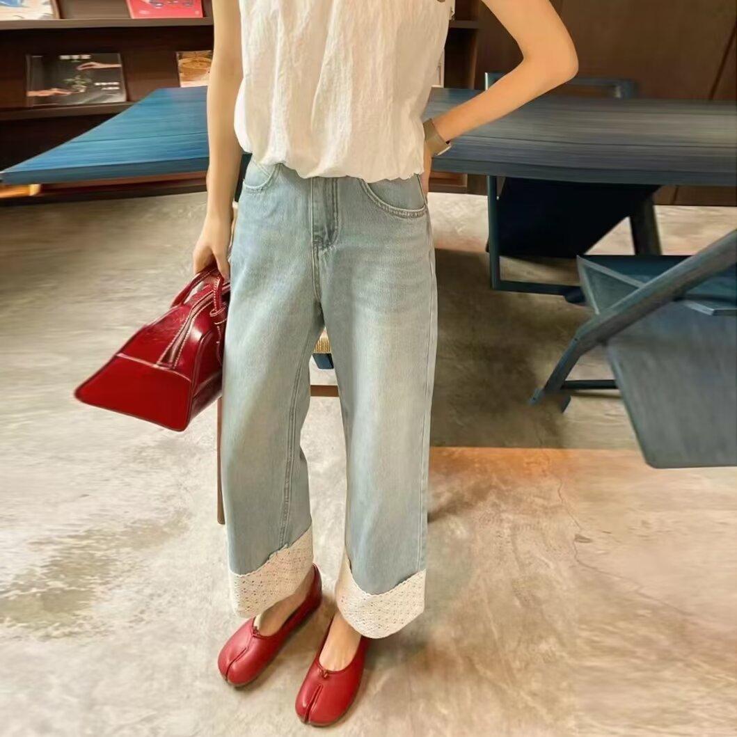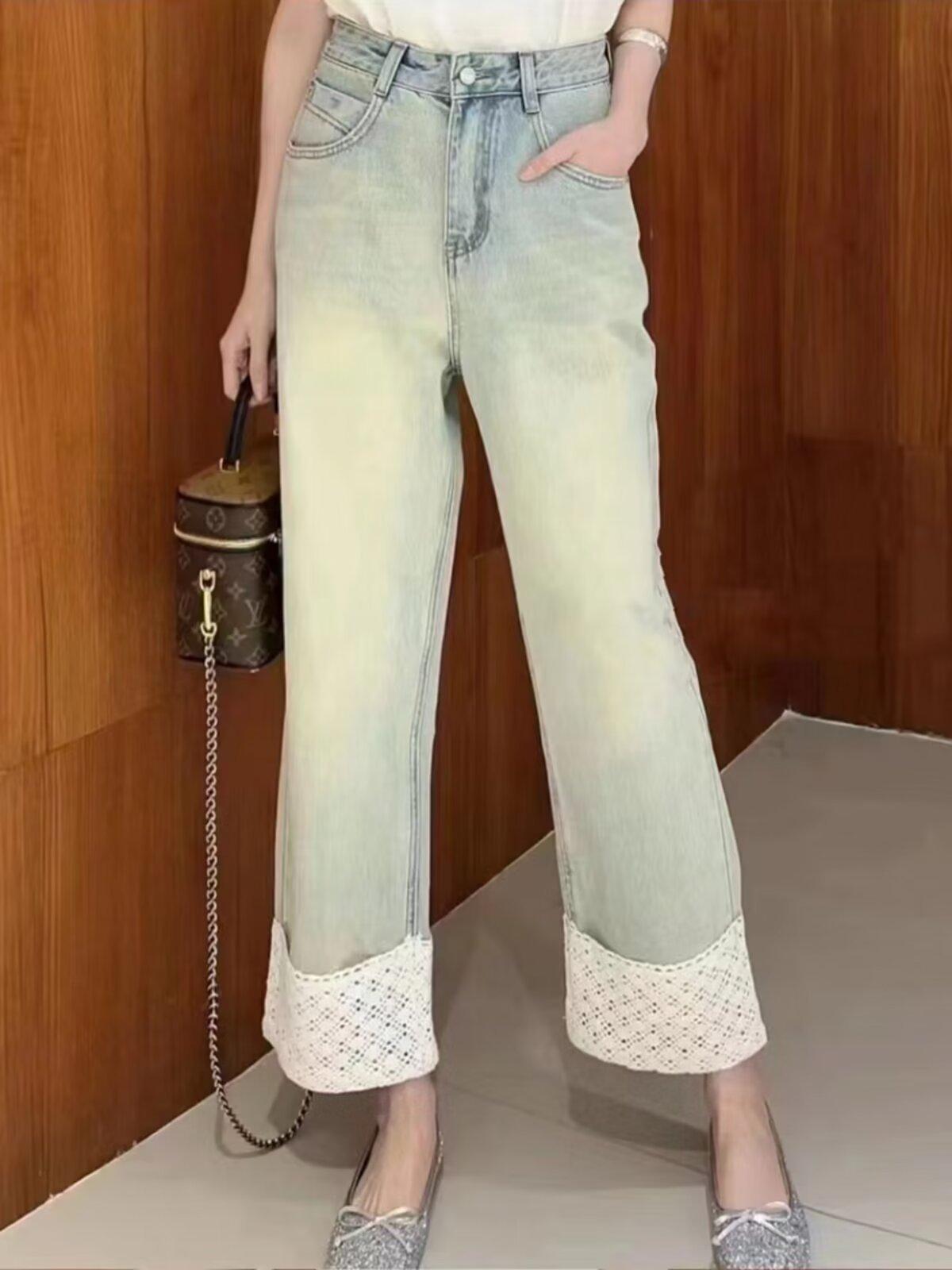 Pantalones vaqueros vintage Micro-Lam para mujer, de verano, de cintura alta, con diseño adelgazante, costuras de encaje, corte trompeta de nueve puntos, informales y modernos.