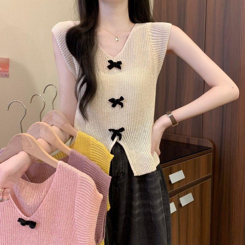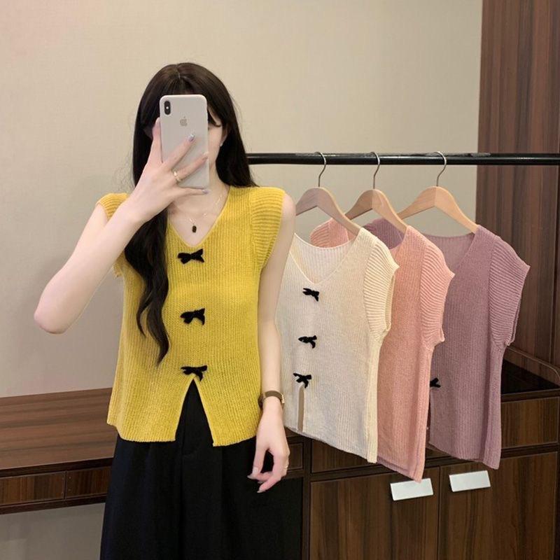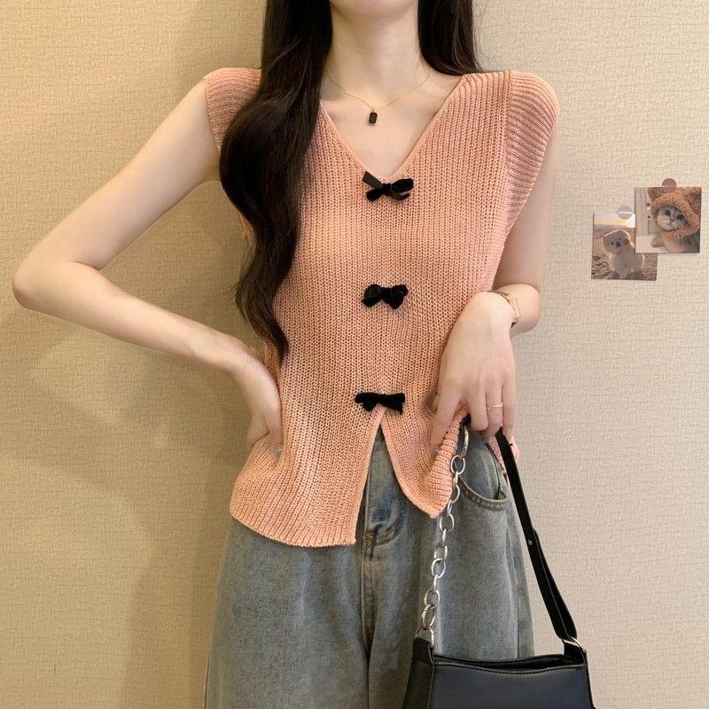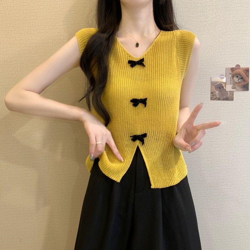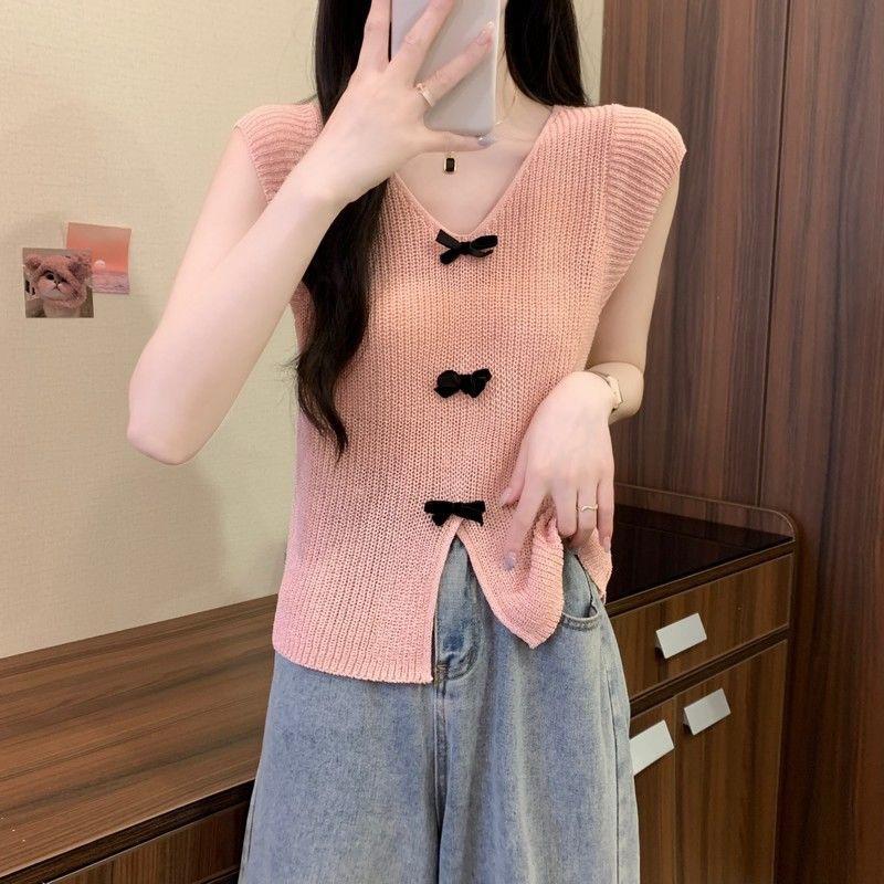 Suéter de manga corta con cuello en V y lazo dividido para mujer, top corto de verano con base de mangas voladoras y corte entallado.