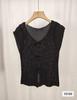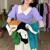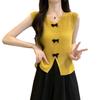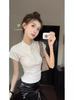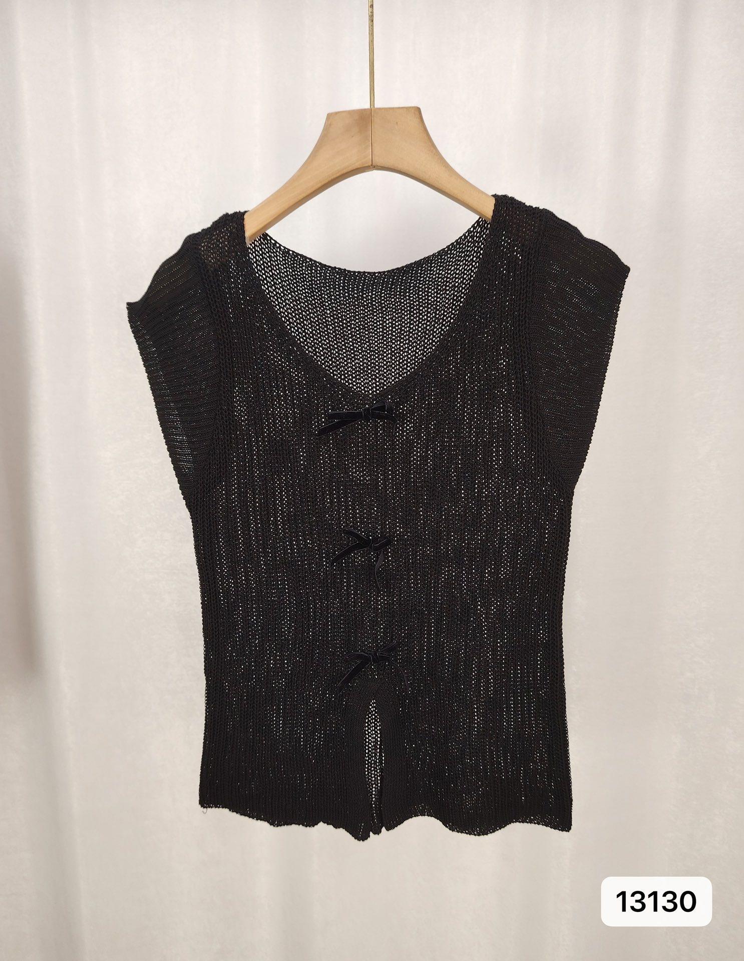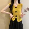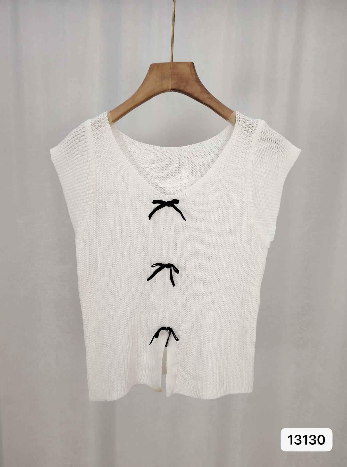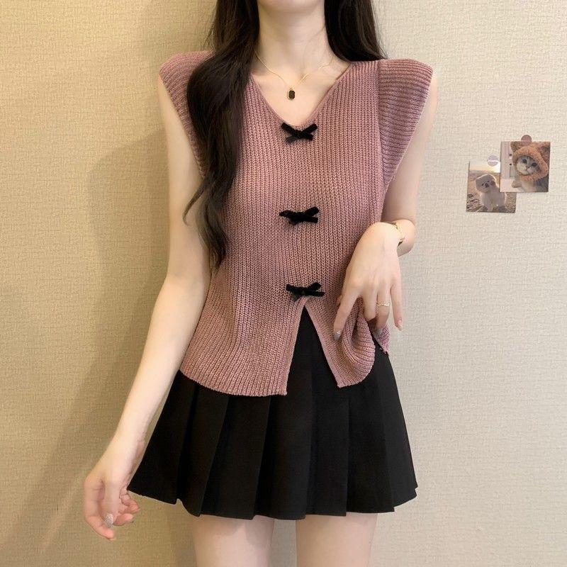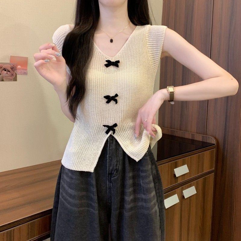 Suéter de manga corta con cuello en V y lazo dividido para mujer, top corto de verano con base de mangas voladoras y corte entallado.