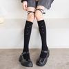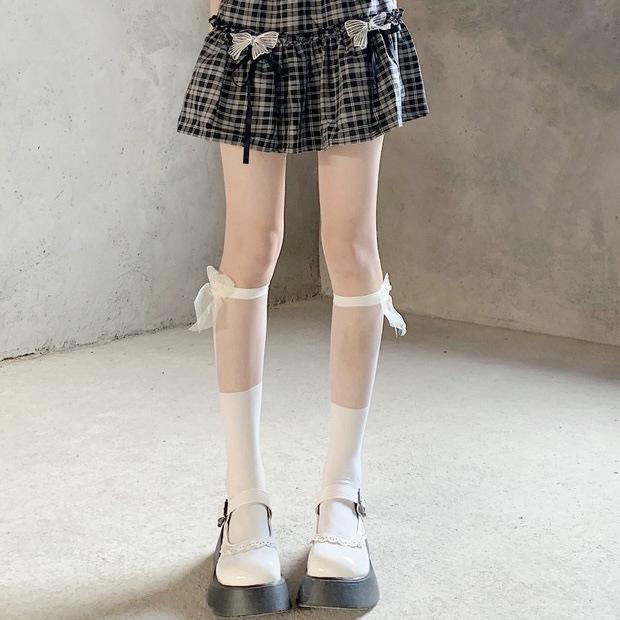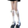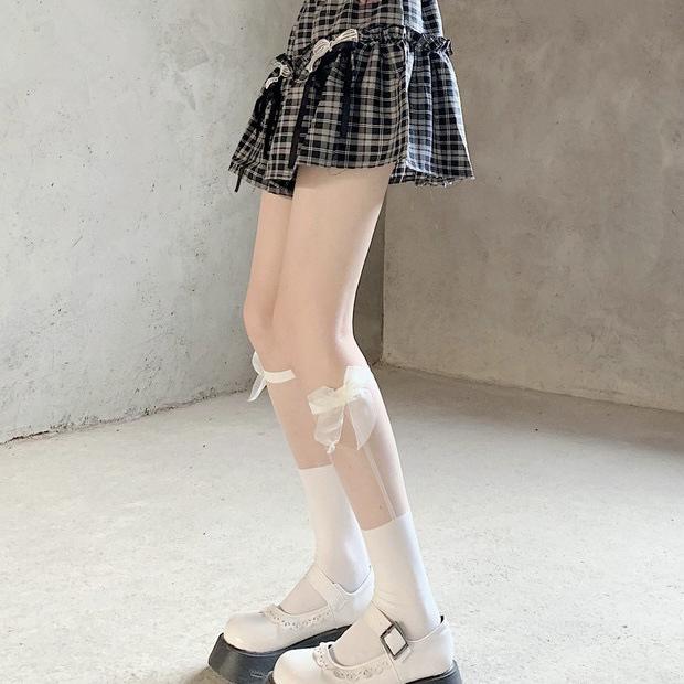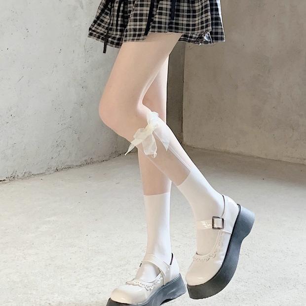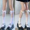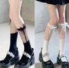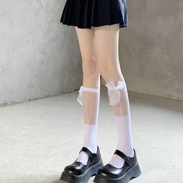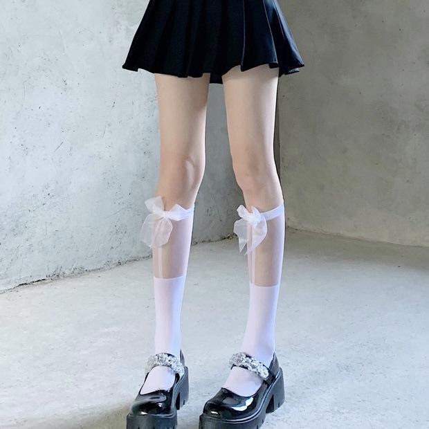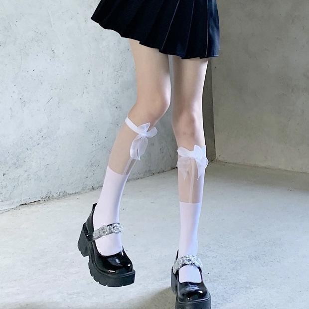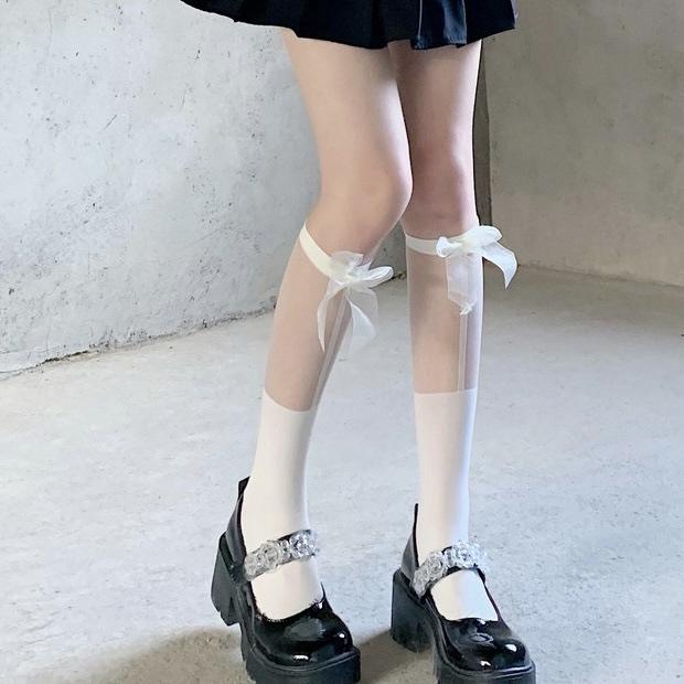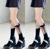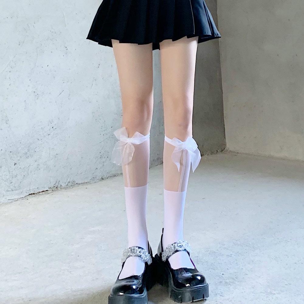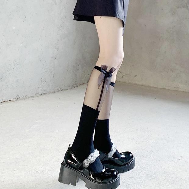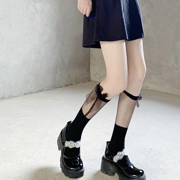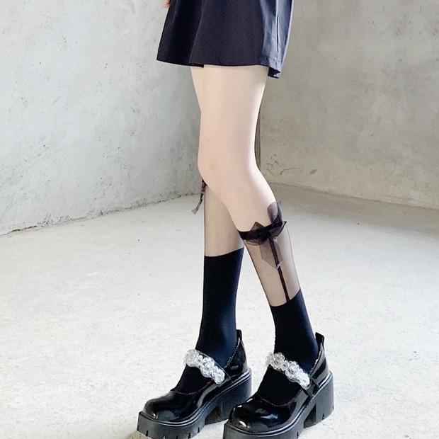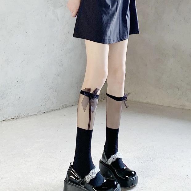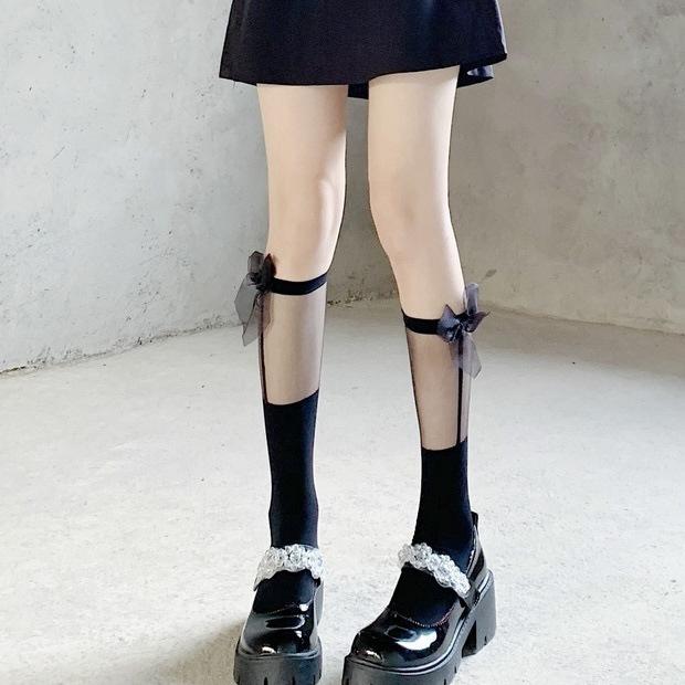 Medias negras hasta la pantorrilla con lazo negro, costura, para mujer, primavera y otoño, sexy, de encaje, calcetines finos hasta media pantorrilla