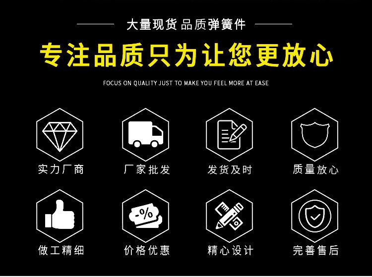Cixi Reina Spring Co., Ltd. es una empresa profesional de fabricación de resortes. La empresa cuenta con varias máquinas computarizadas para enrollar resortes, máquinas para resortes de compresión y equipos de revenido, que pueden proporcionar a los clientes varios tipos de procesamiento de resortes de alta precisión y difíciles. Ofrecemos sinceramente servicios considerados a nuestros clientes con capacidades de diseño de alto nivel y precios razonables. Este es el compromiso constante de la empresa. Nuestros servicios profesionales lo satisfarán. La integridad, la fortaleza y la calidad del producto de Cixi Reina Spring Co., Ltd. son reconocidas por la industria. Amigos de todos los ámbitos son bienvenidos a visitar, guiar y negociar negocios.