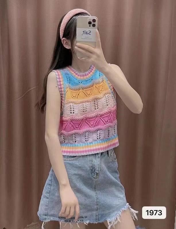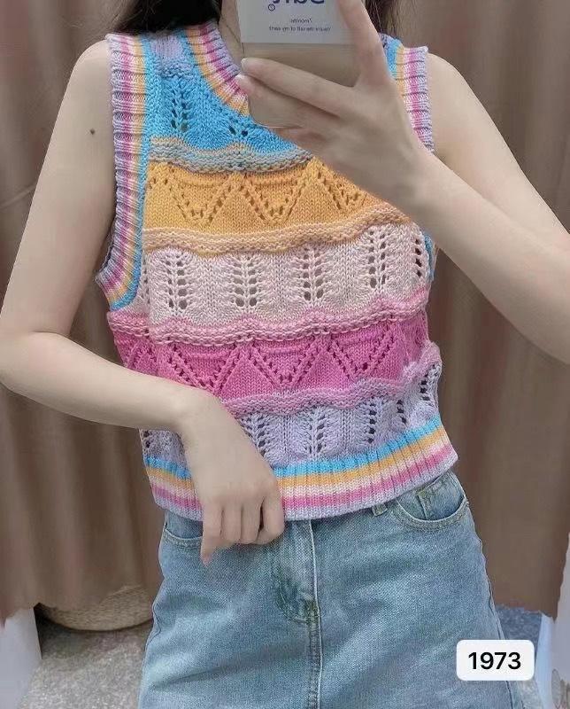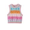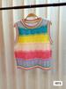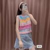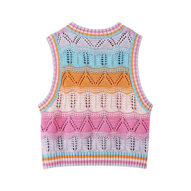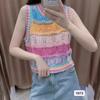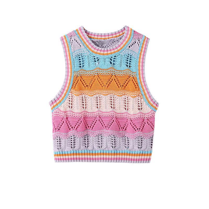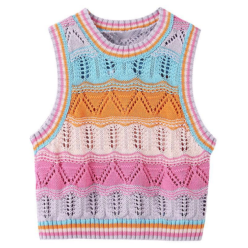 Chaleco de Punto Rayado Hueco Colorido para Mujer Verano Transfronterizo Nuevo Top sin Mangas Chaleco Corto sin Mangas con Cuadros de Rombo