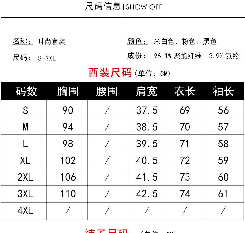Black one piece suit, Off-white single suit, Pink one piece suit, Black suit + pants, Off-white suit + pants, Pink suit + pants