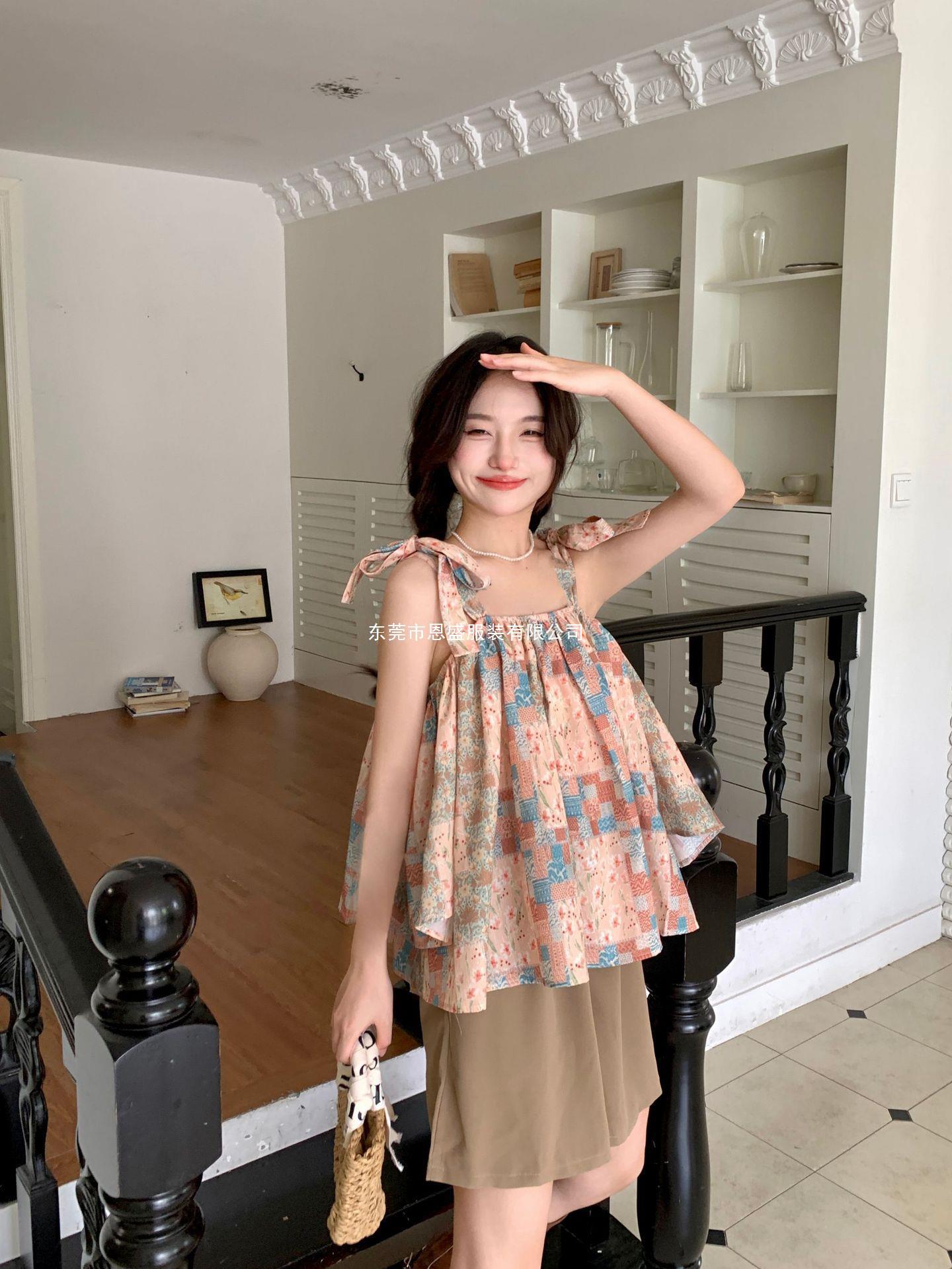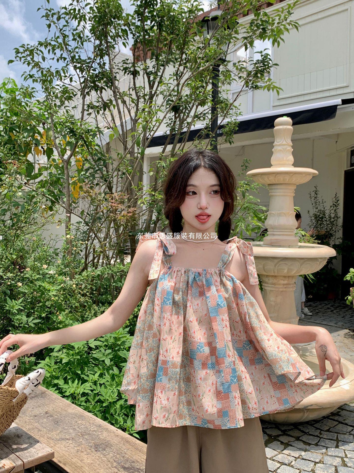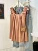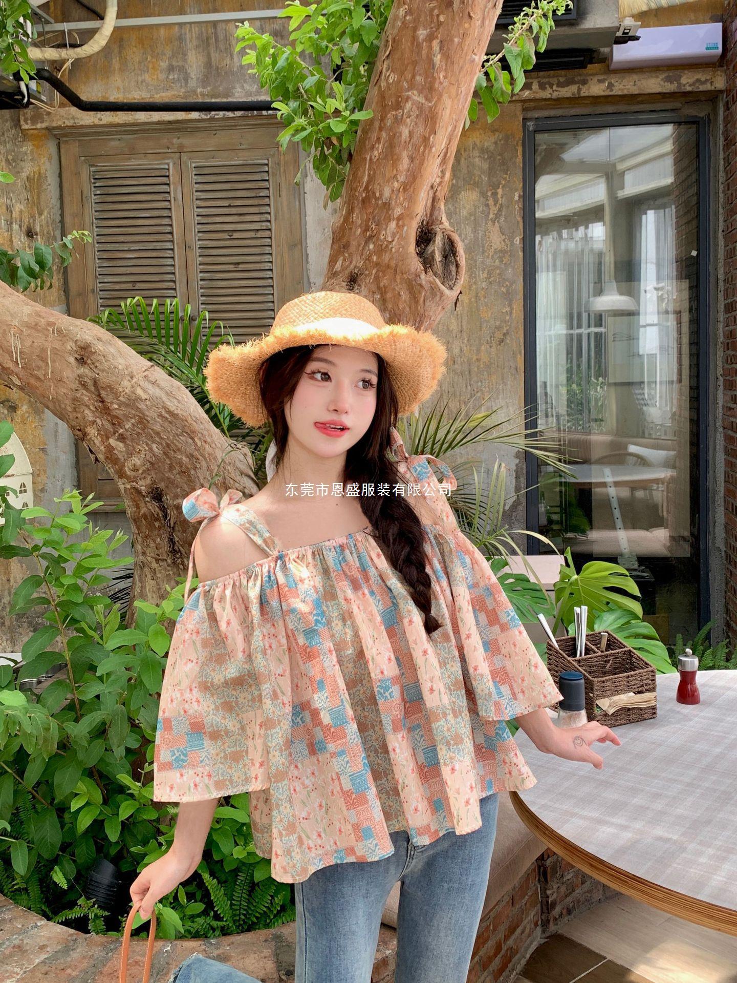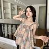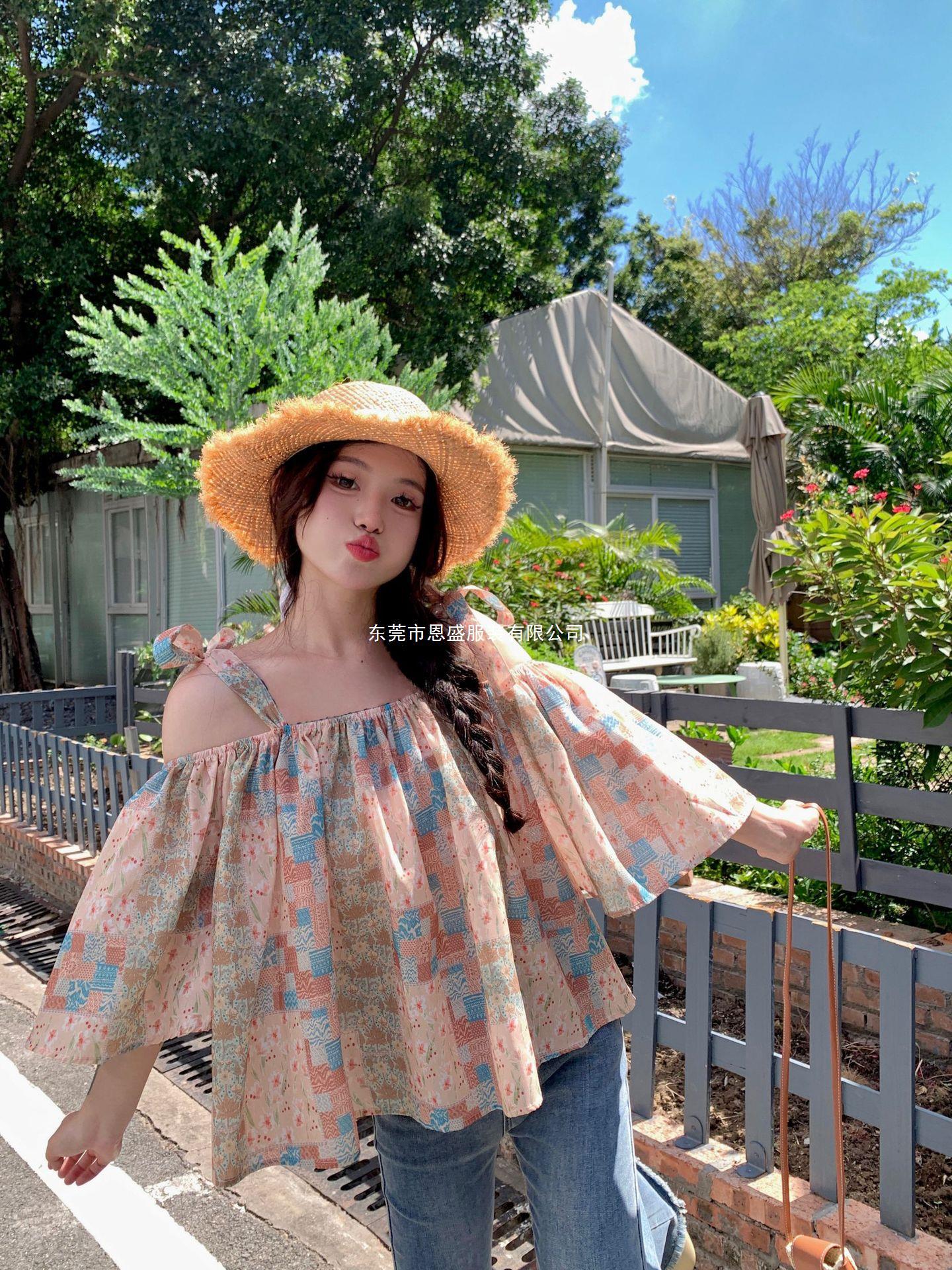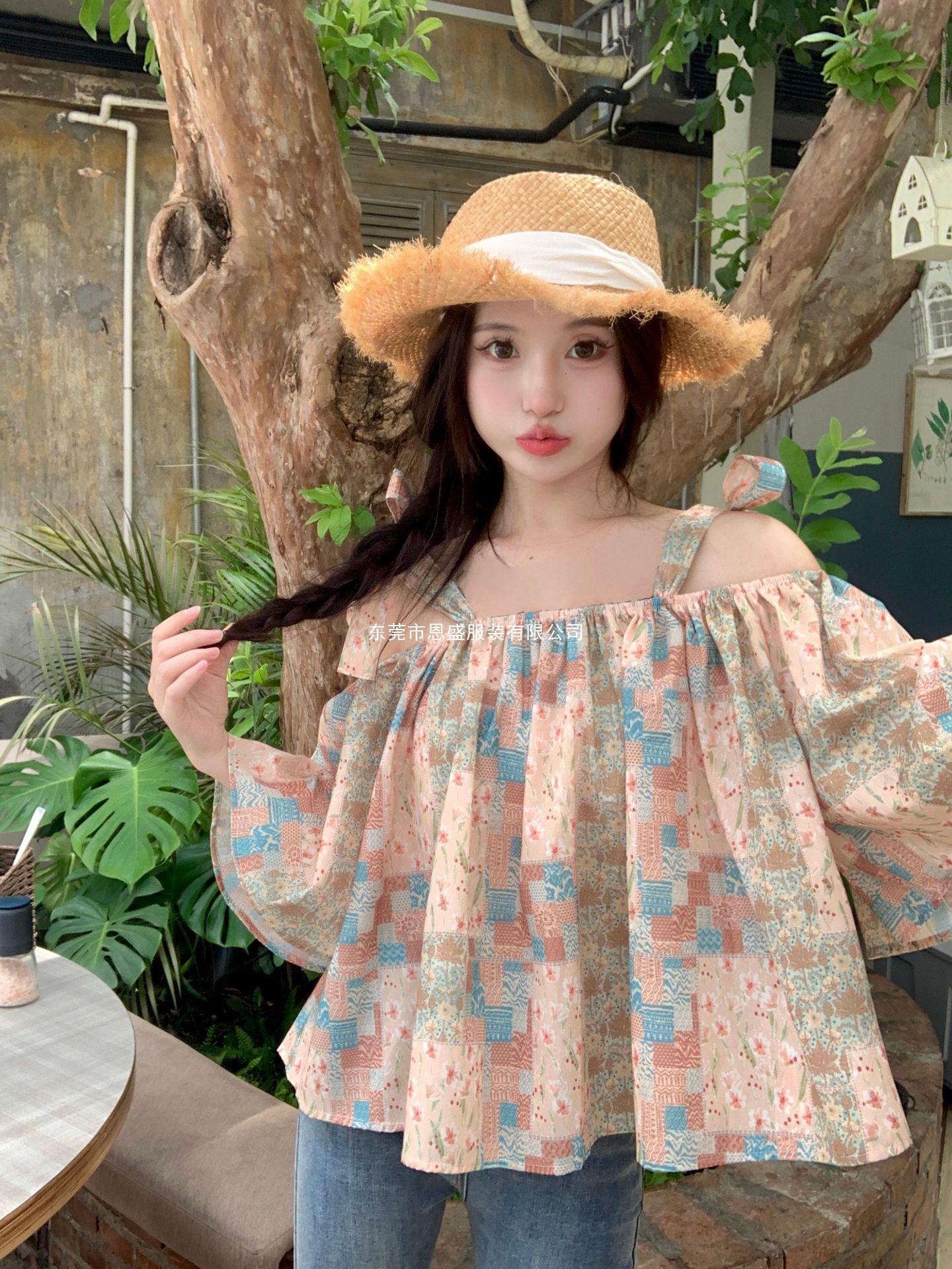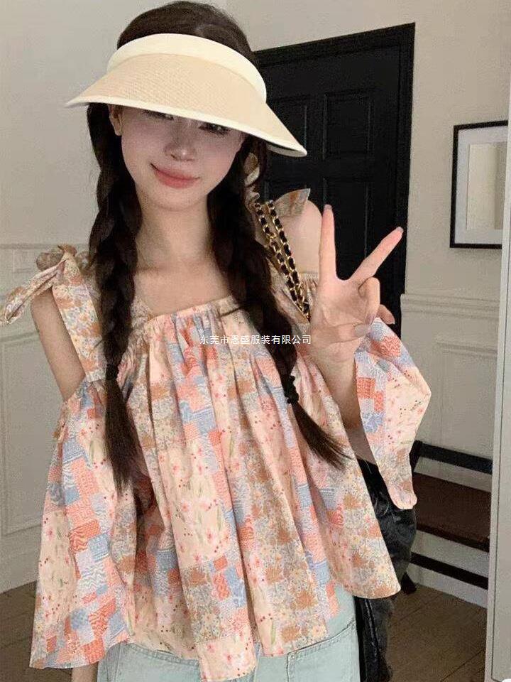 Verano 2024 Dulce y Picante Reductor de Edad Estilo Occidental Sling Delgada Hombro Camisa Francesa para Mujer Top Corto Holgado Ropa de Mujer