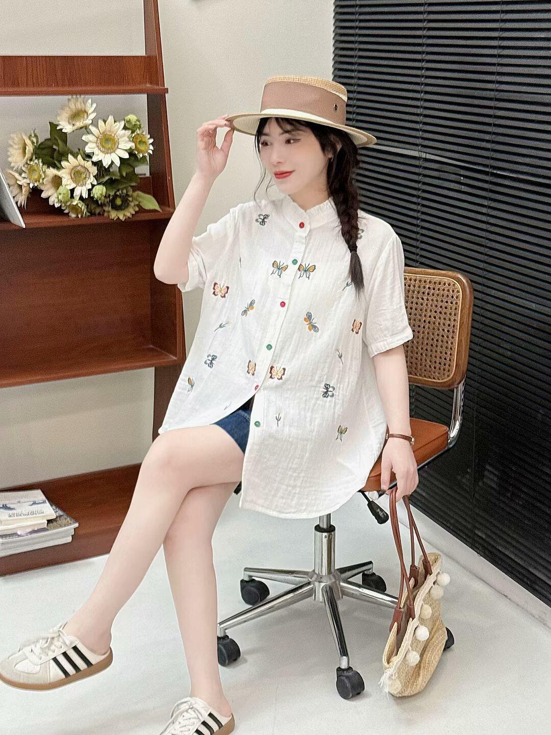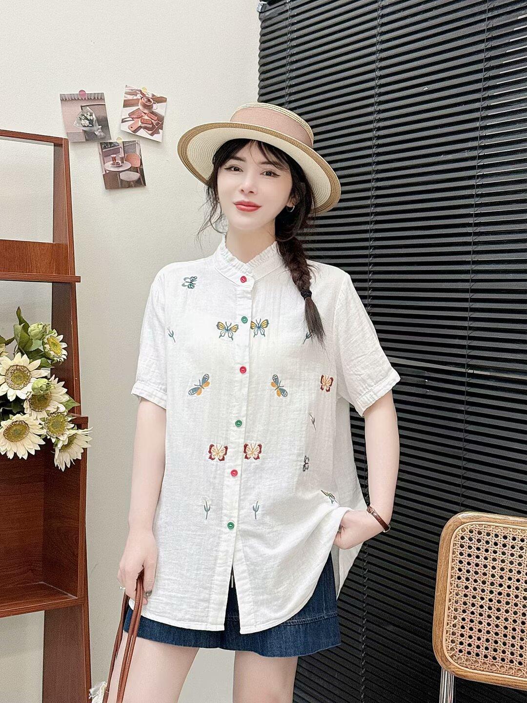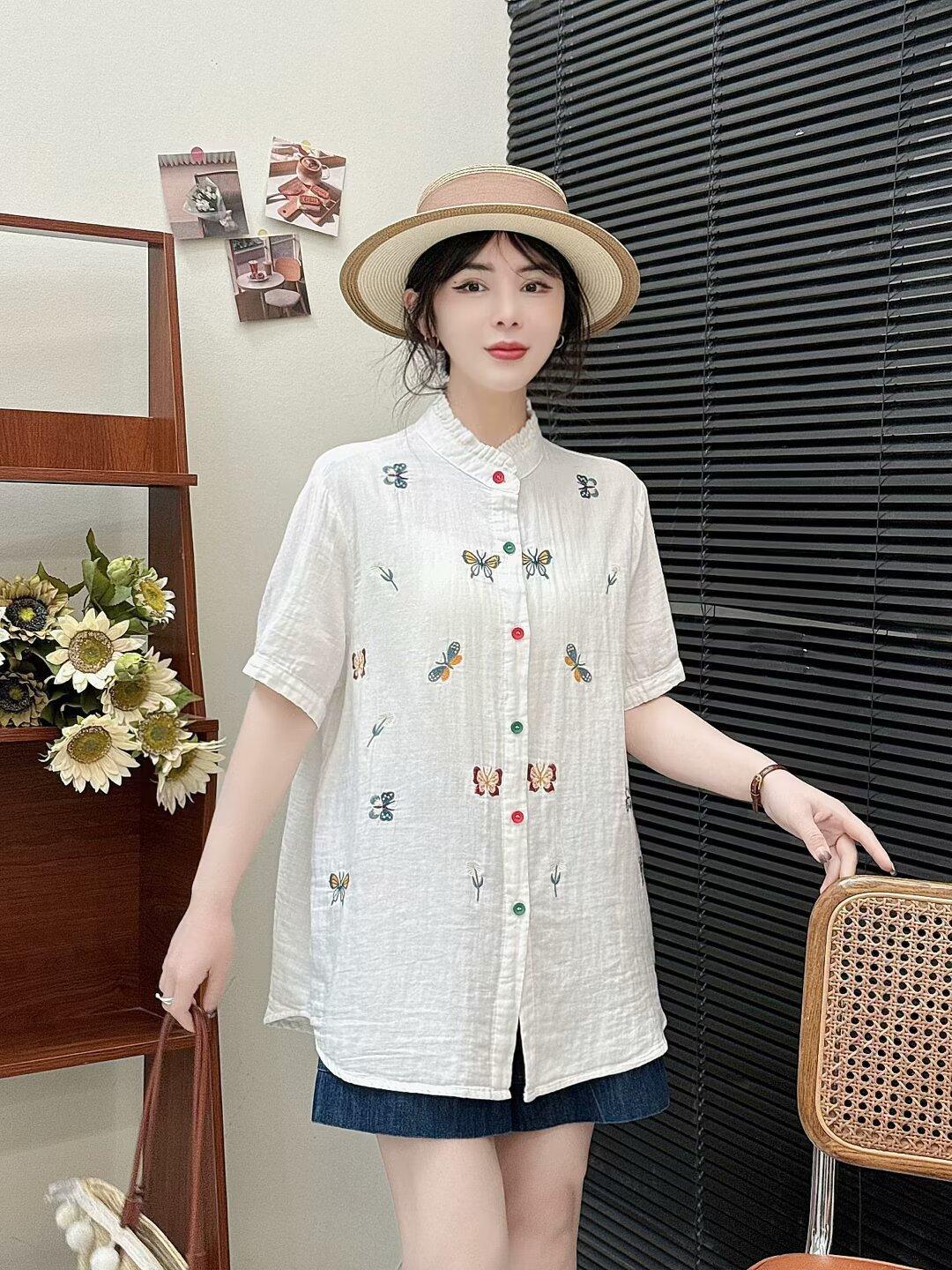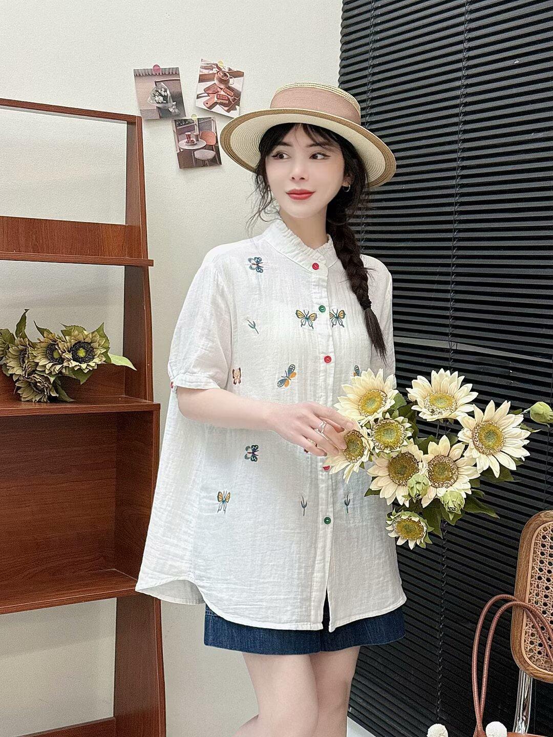 Verano 2025 Nueva Camisa Artística Estampada con Cuello Holgada Adelgazante Casual Combinable Manga Corta Top Cárdigan de Mujer