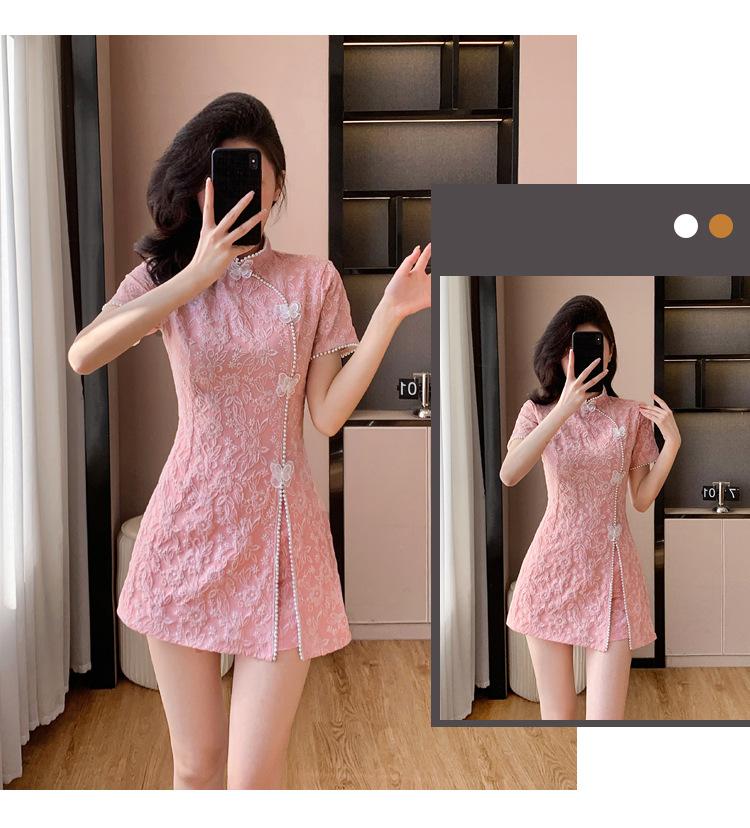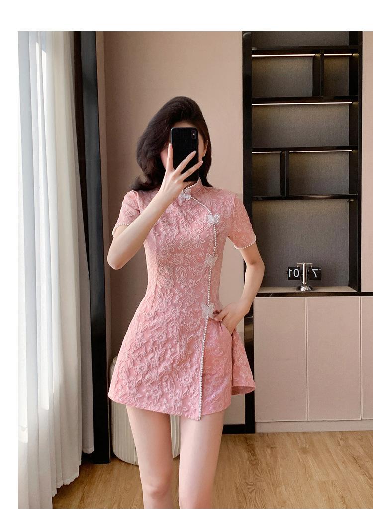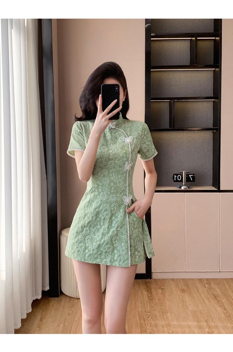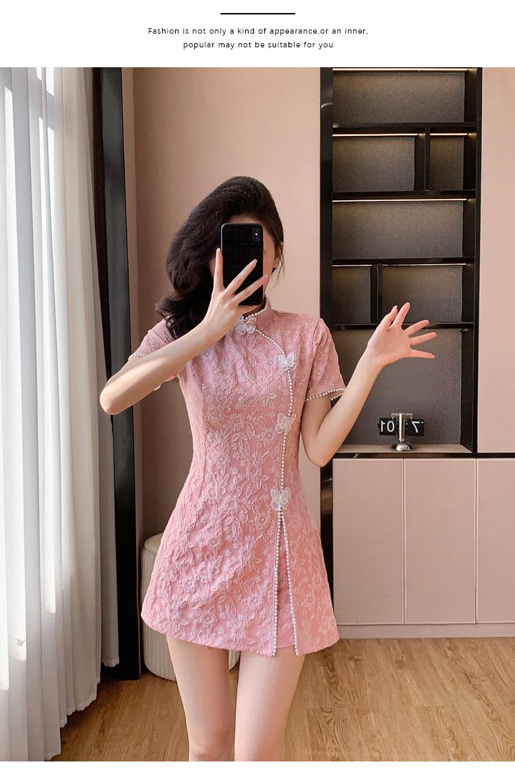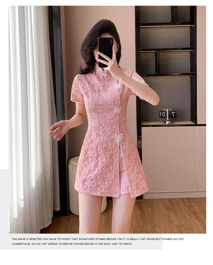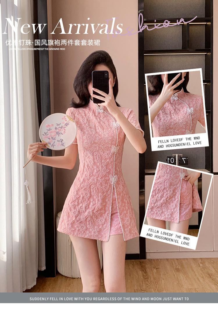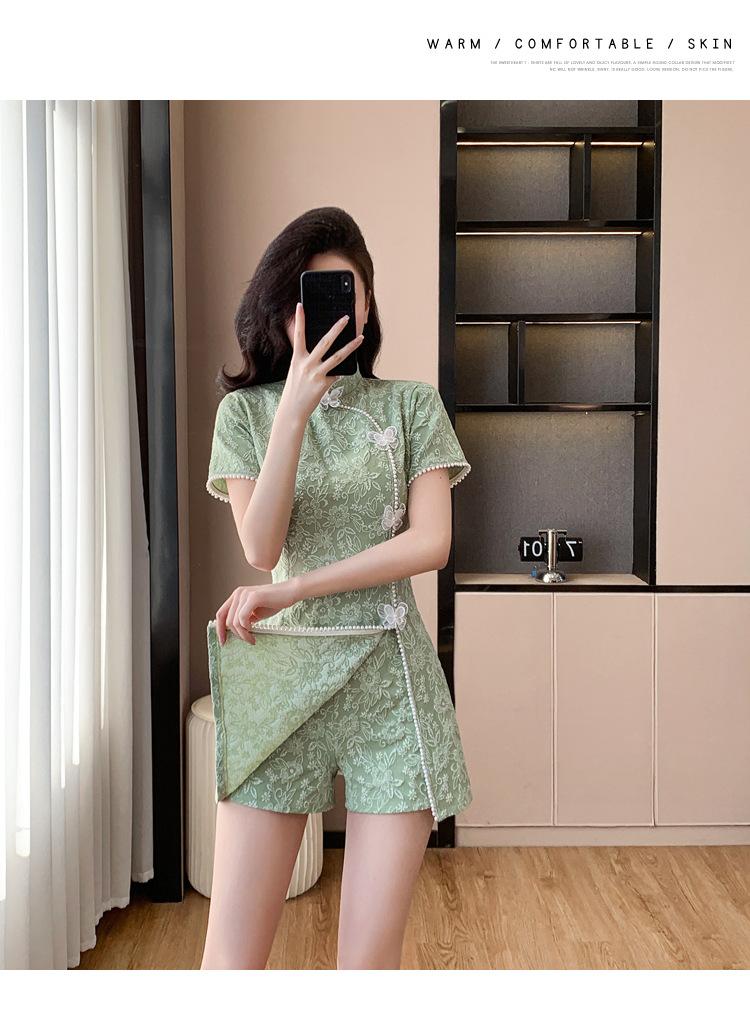 Real Shot en stock Verano Nuevo Cheongsam Mejorado Costura de Perlas Mariposa Jacquard Vestido Microelástico Pantalones Cortos Conjunto de Dos Piezas
