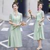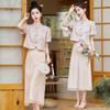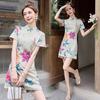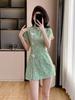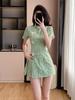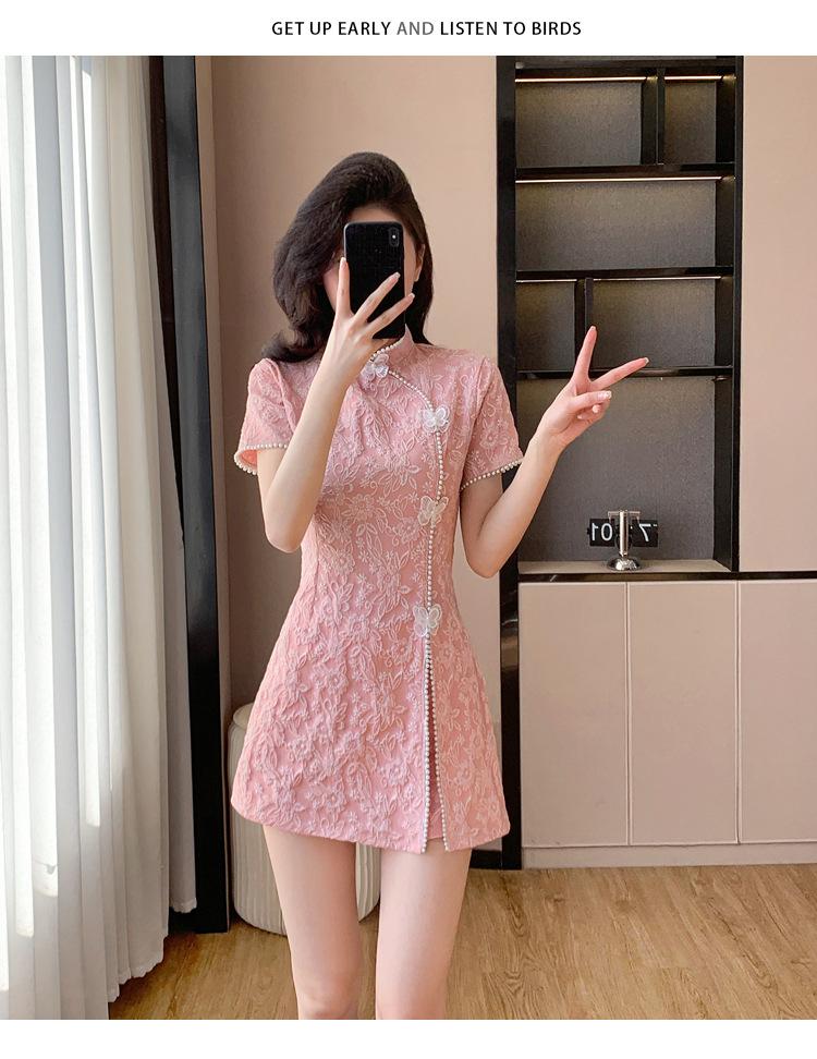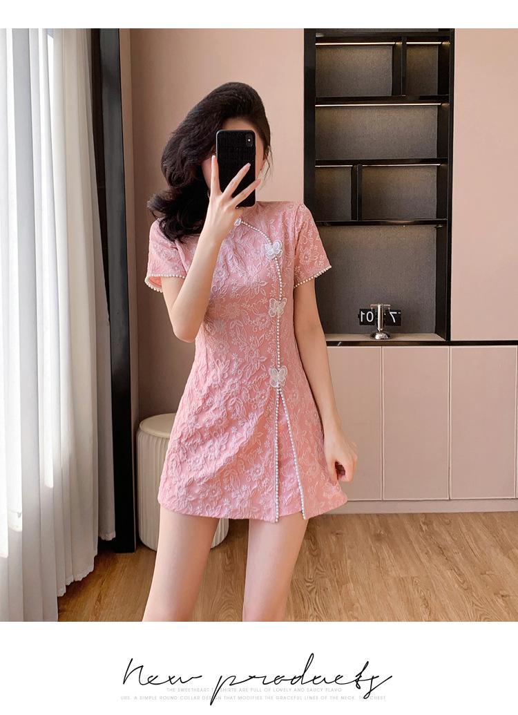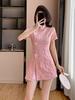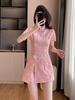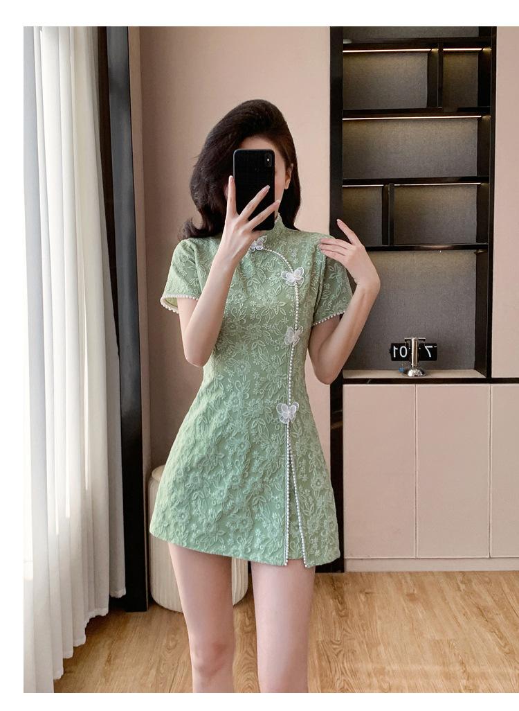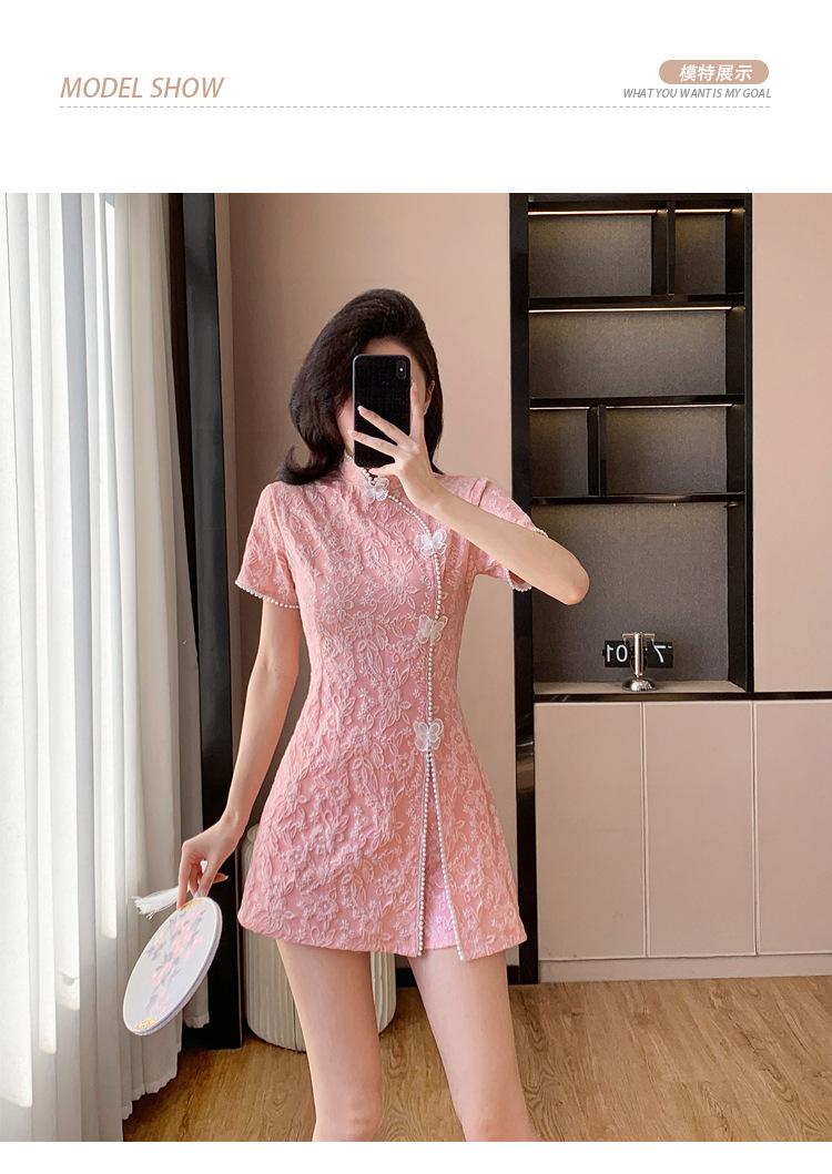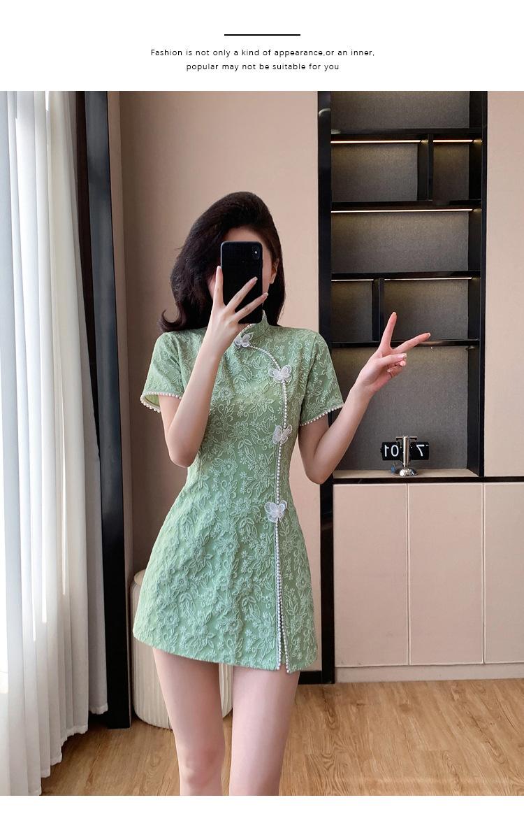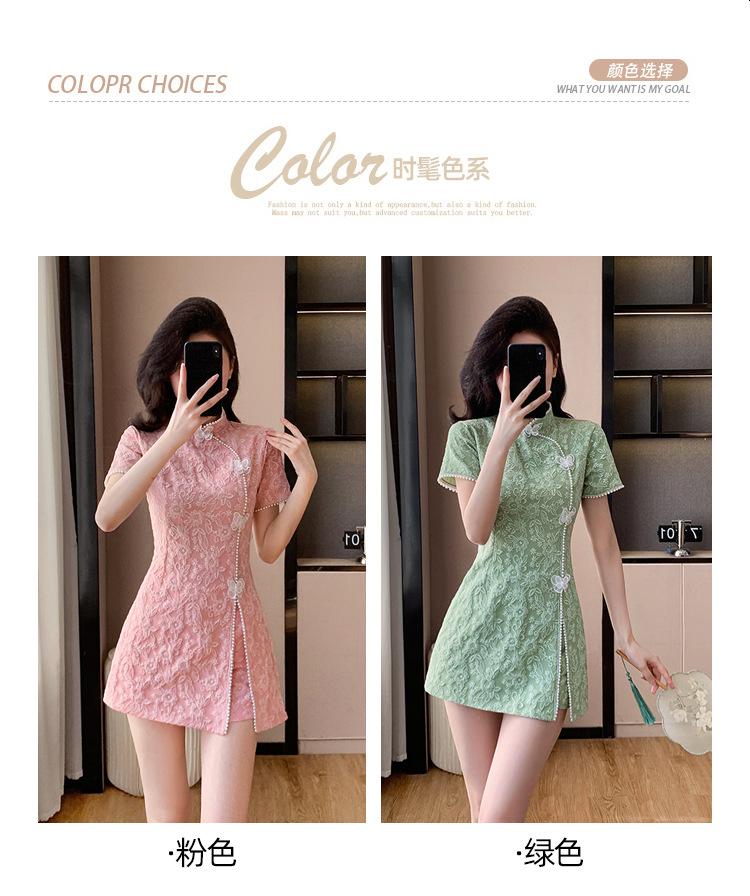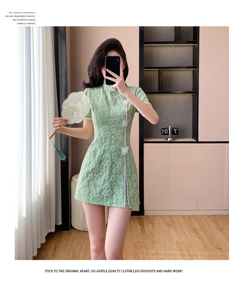 Real Shot en stock Verano Nuevo Cheongsam Mejorado Costura de Perlas Mariposa Jacquard Vestido Microelástico Pantalones Cortos Conjunto de Dos Piezas